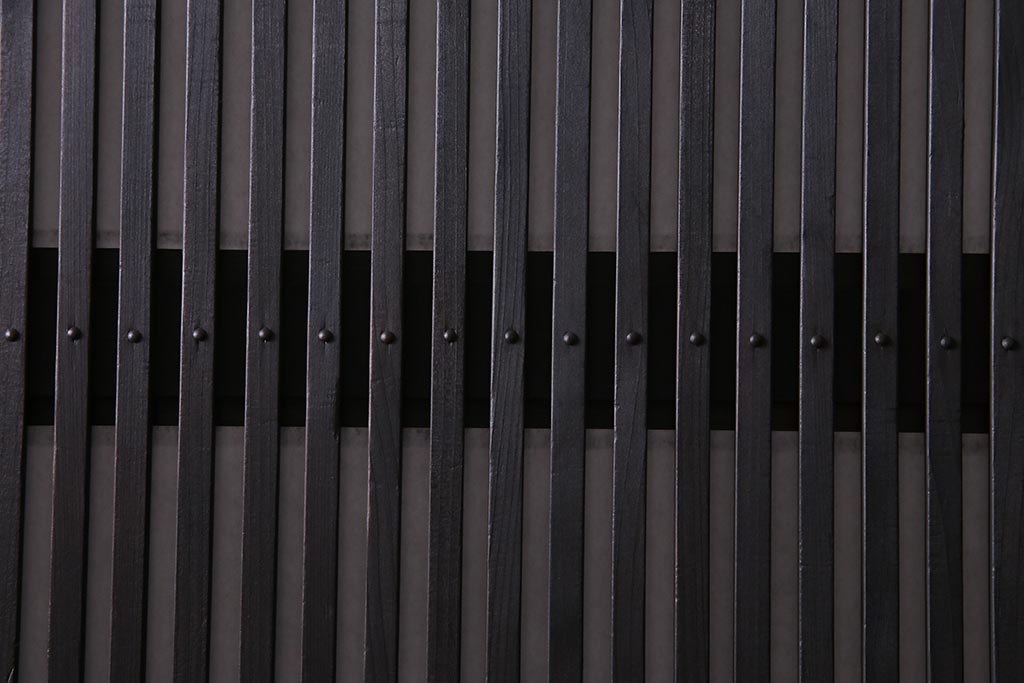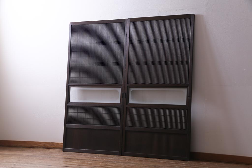 アンティーク建具 和製アンティーク 大正昭和初期 裏障子付き ガラス入り 縦格子が美しいシックでモダンな雰囲気の格子戸2枚セット(引き戸、障子戸、建具)(R-037745)です。