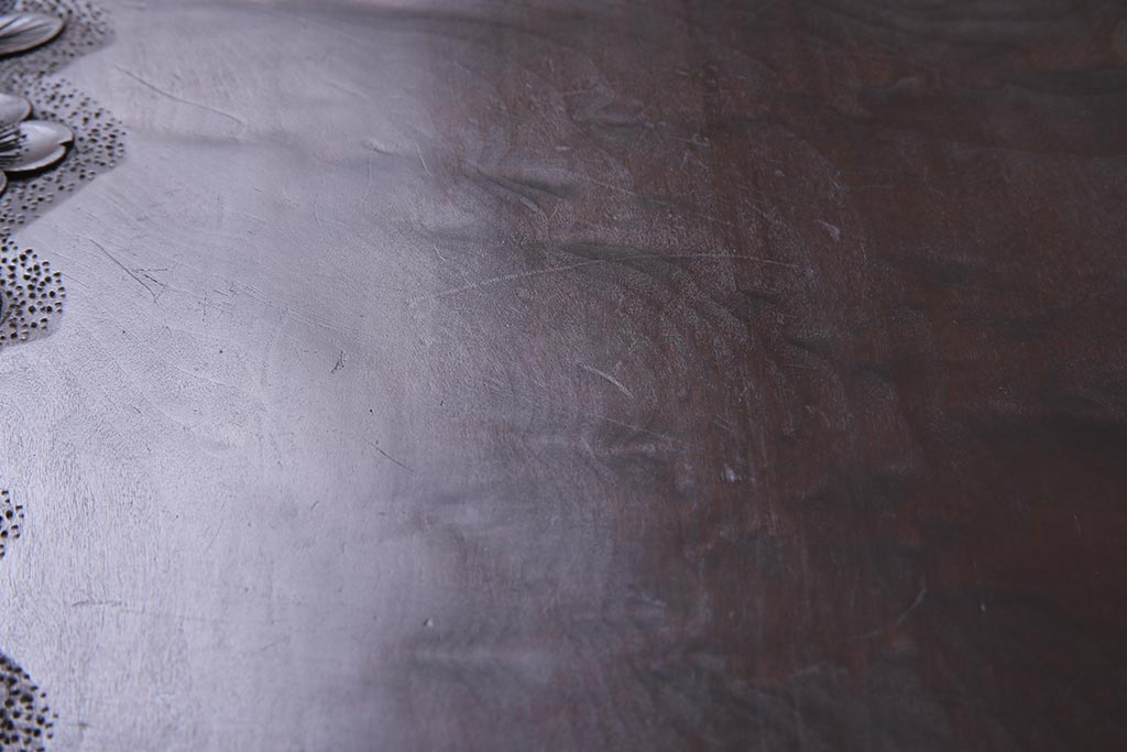 1、2枚目の画像にありますように天板に歪みがありますが、使用上、強度上に問題はありません。