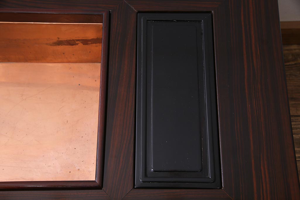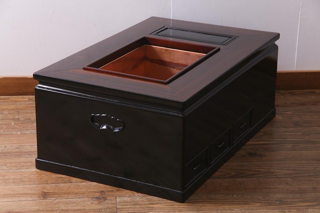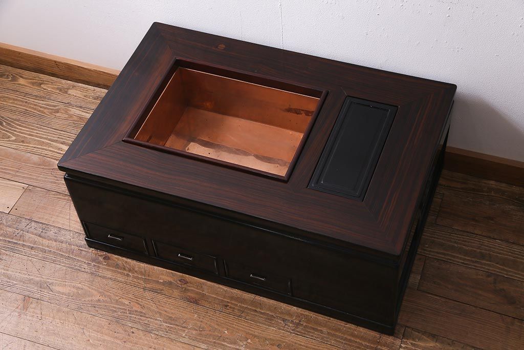 アンティーク雑貨 和製アンティーク 昭和初期 天板縞黒檀材・唐木材使用 つややかな黒塗りが高級感漂う長火鉢(手あぶり)(R-037739)