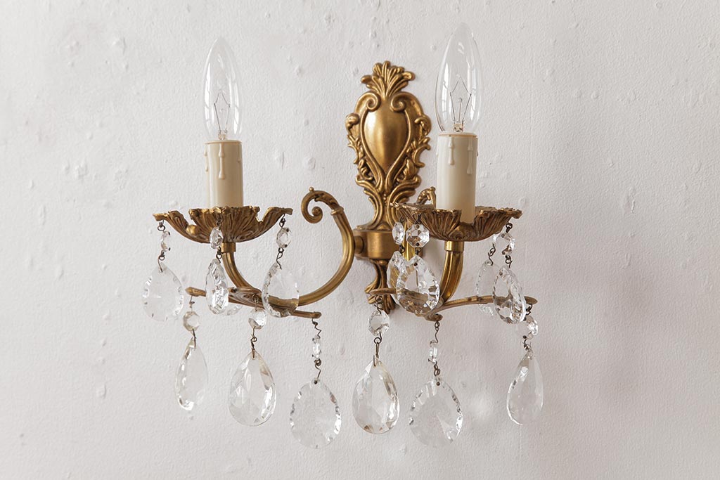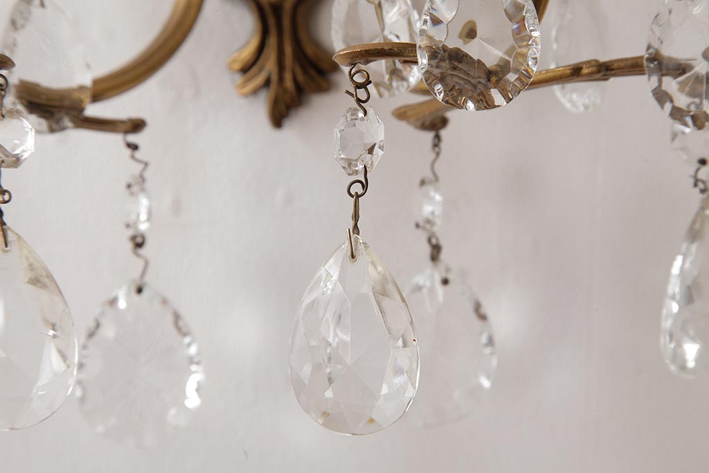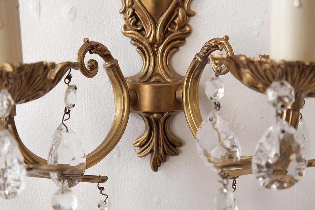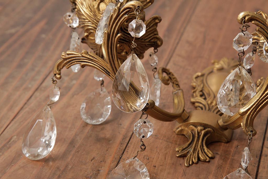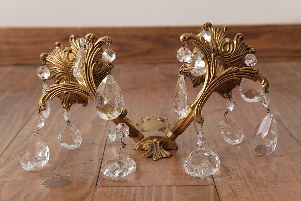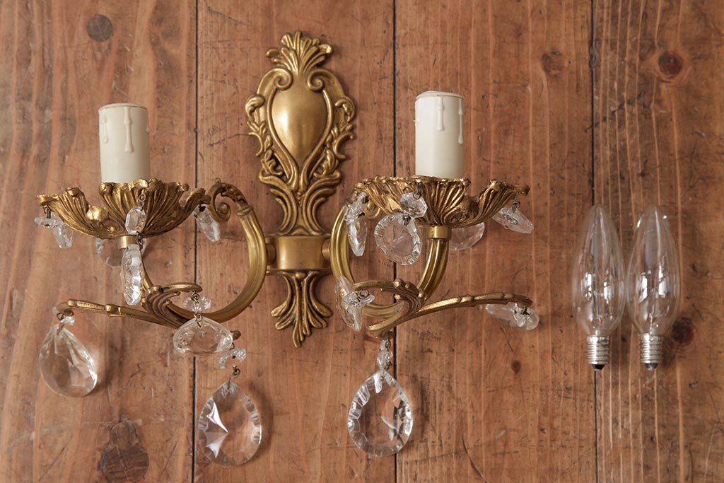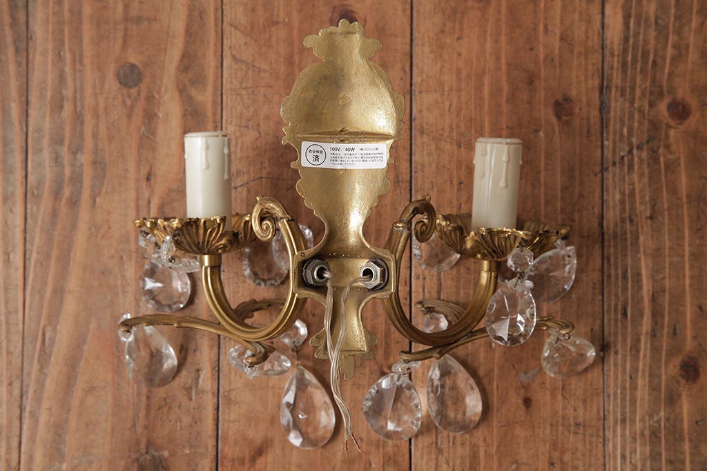 照明・ランプ> シャンデリア > ビンテージ照明 真鍮製 ガラスドロップがおしゃれなフランスヴィンテージのウォールランプ(壁掛けシャンデリア、壁付け照明)(R-037589)
