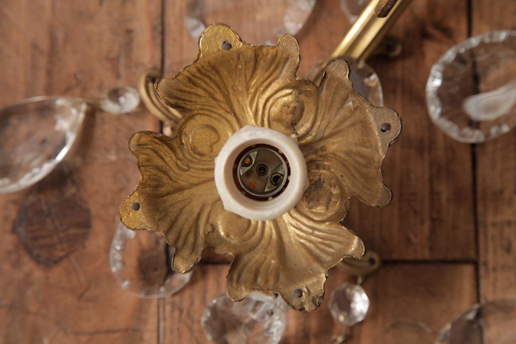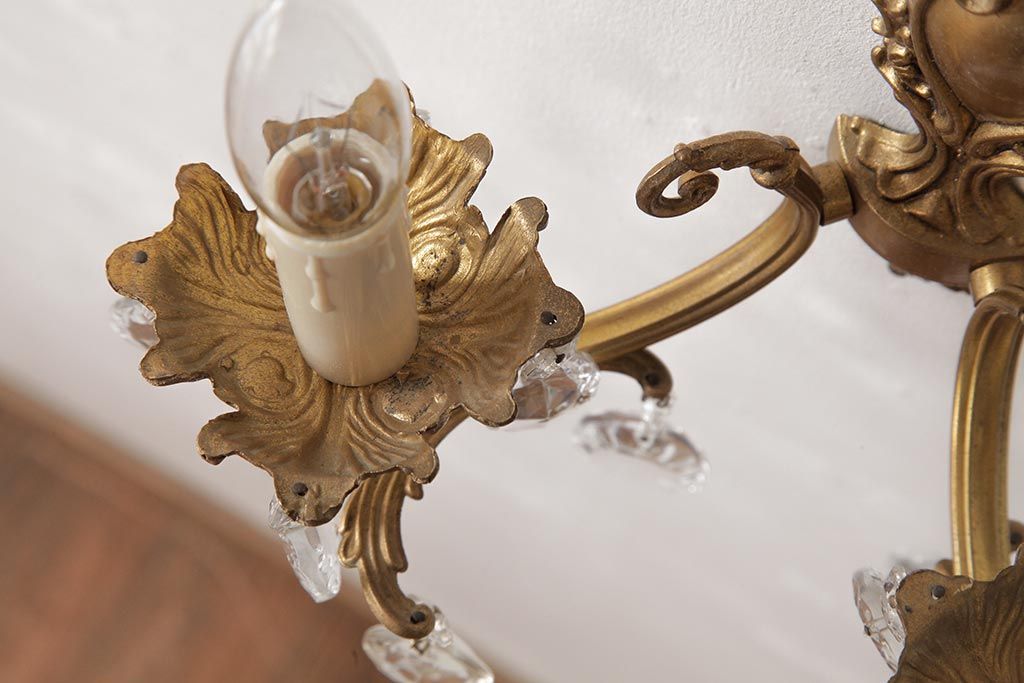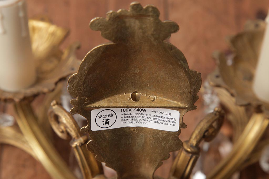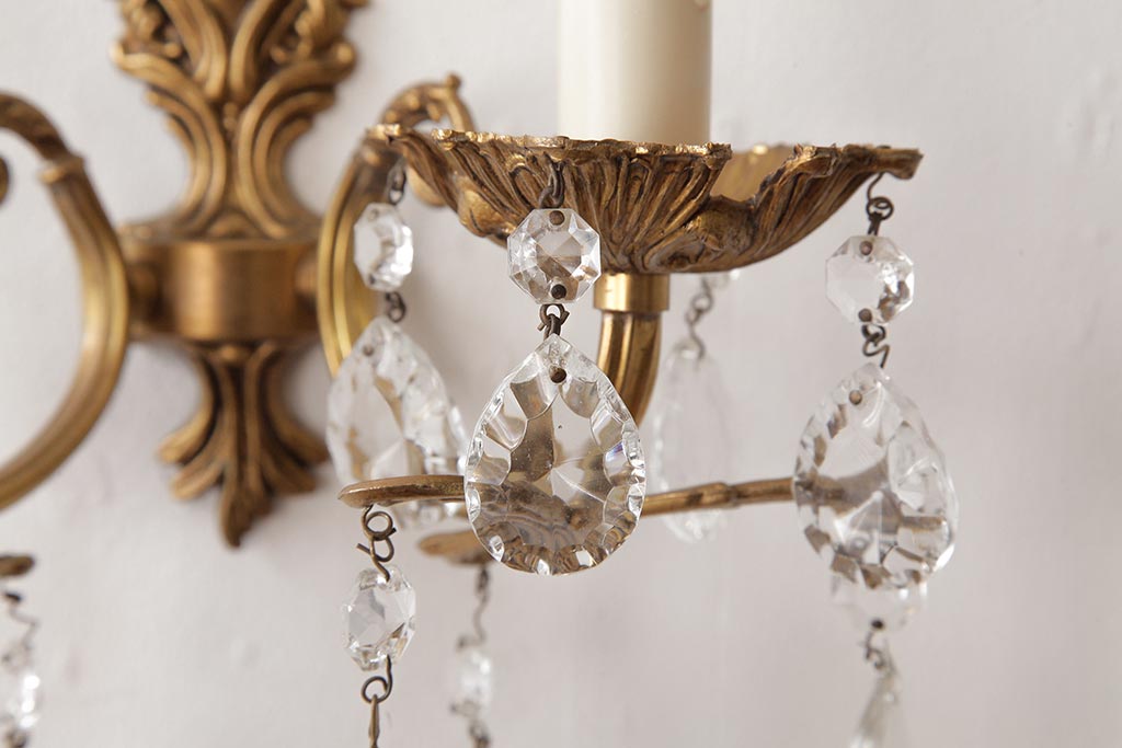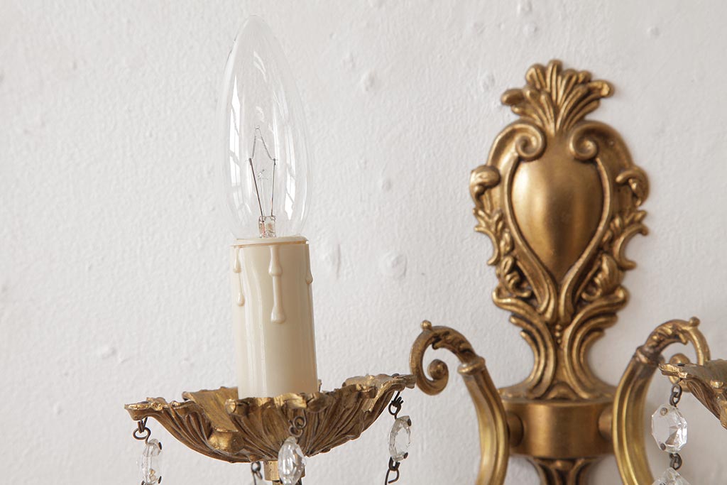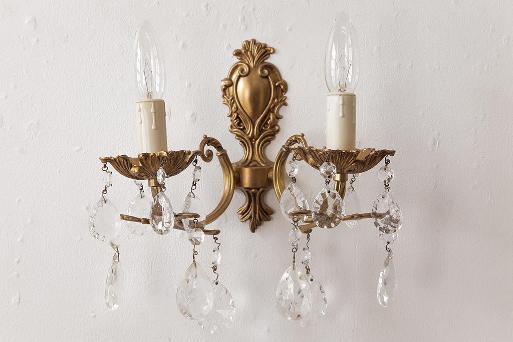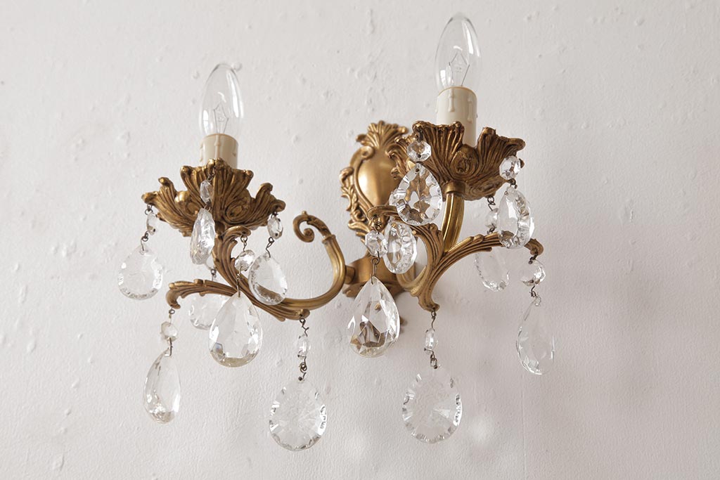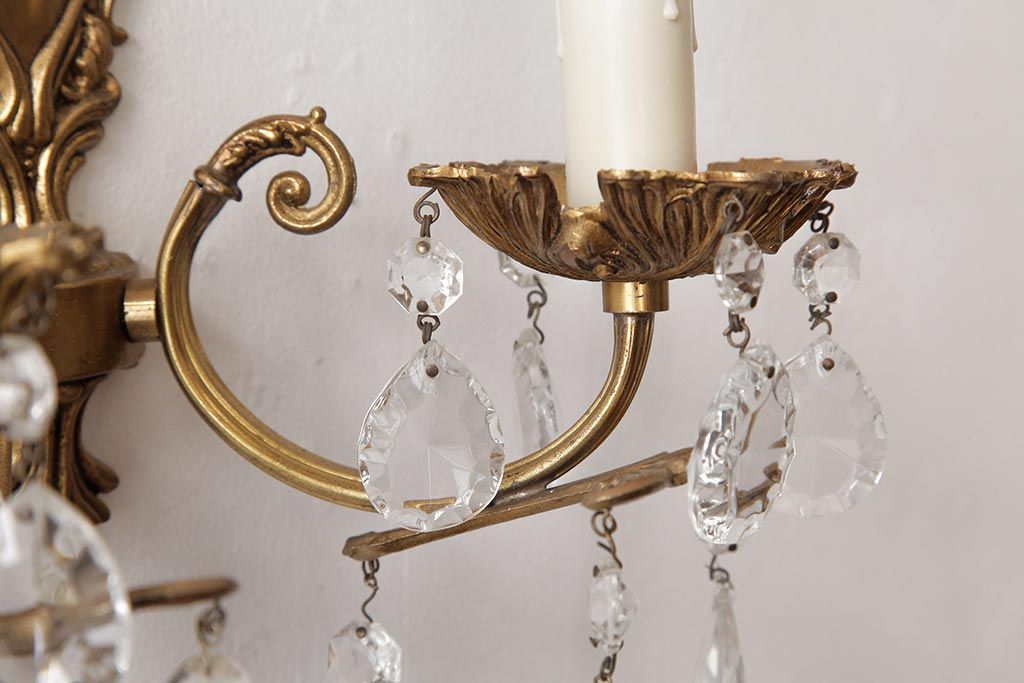 照明・ランプ> シャンデリア > ビンテージ照明 真鍮製 ガラスドロップがおしゃれなフランスヴィンテージのウォールランプ(壁掛けシャンデリア、壁付け照明)(R-037589)