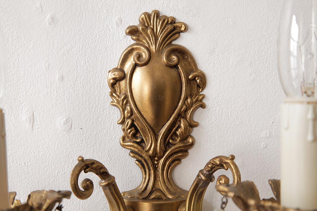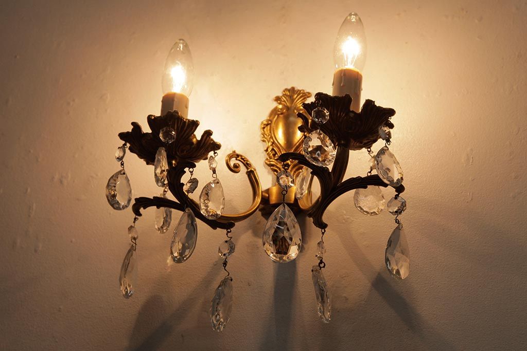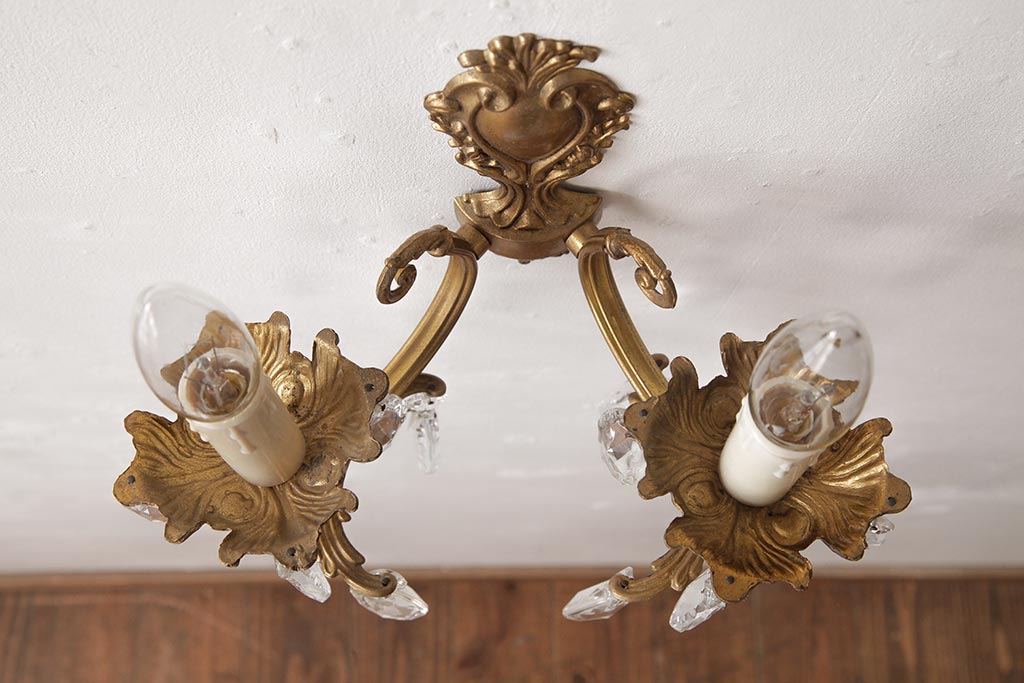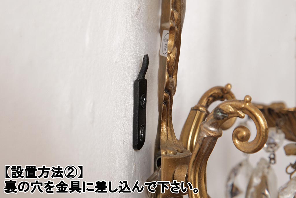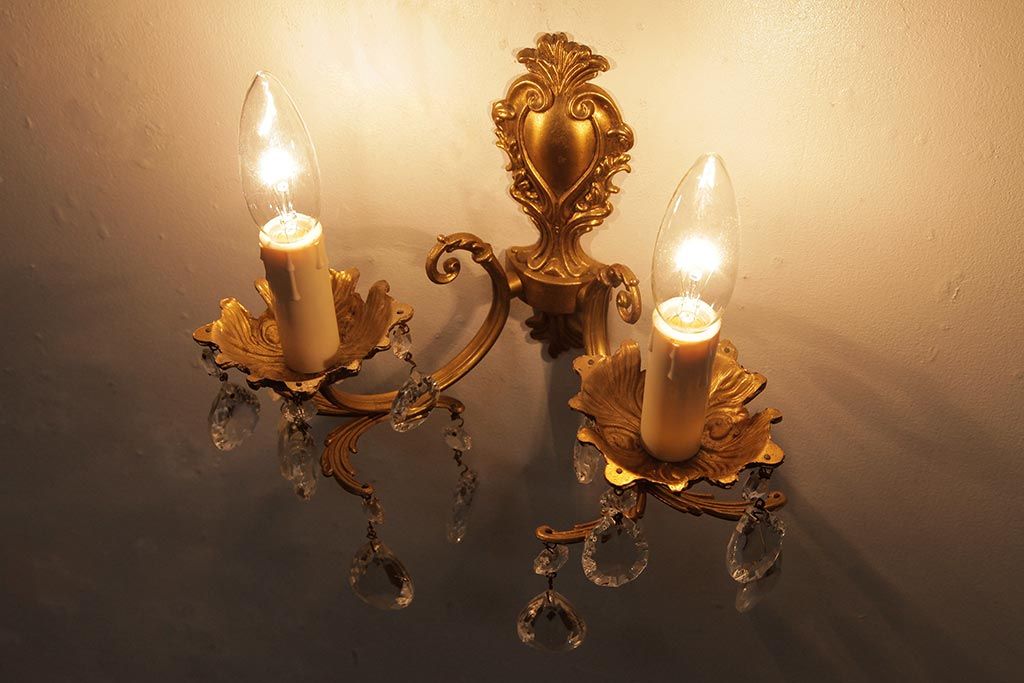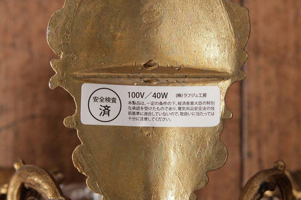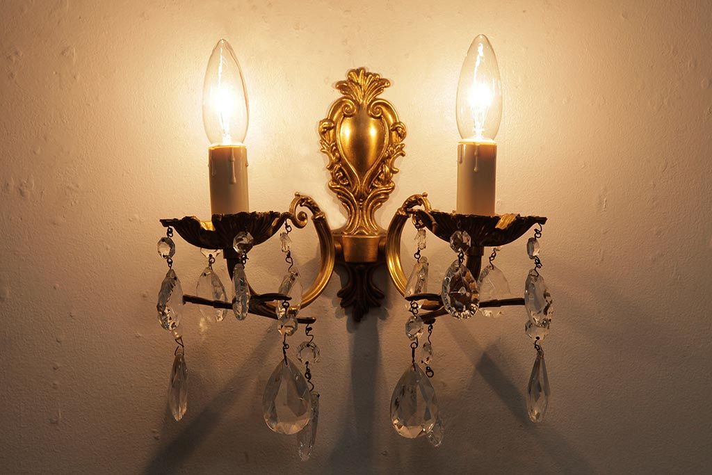 照明・ランプ> シャンデリア > ビンテージ照明 真鍮製 ガラスドロップがおしゃれなフランスヴィンテージのウォールランプ(壁掛けシャンデリア、壁付け照明)(R-037589)