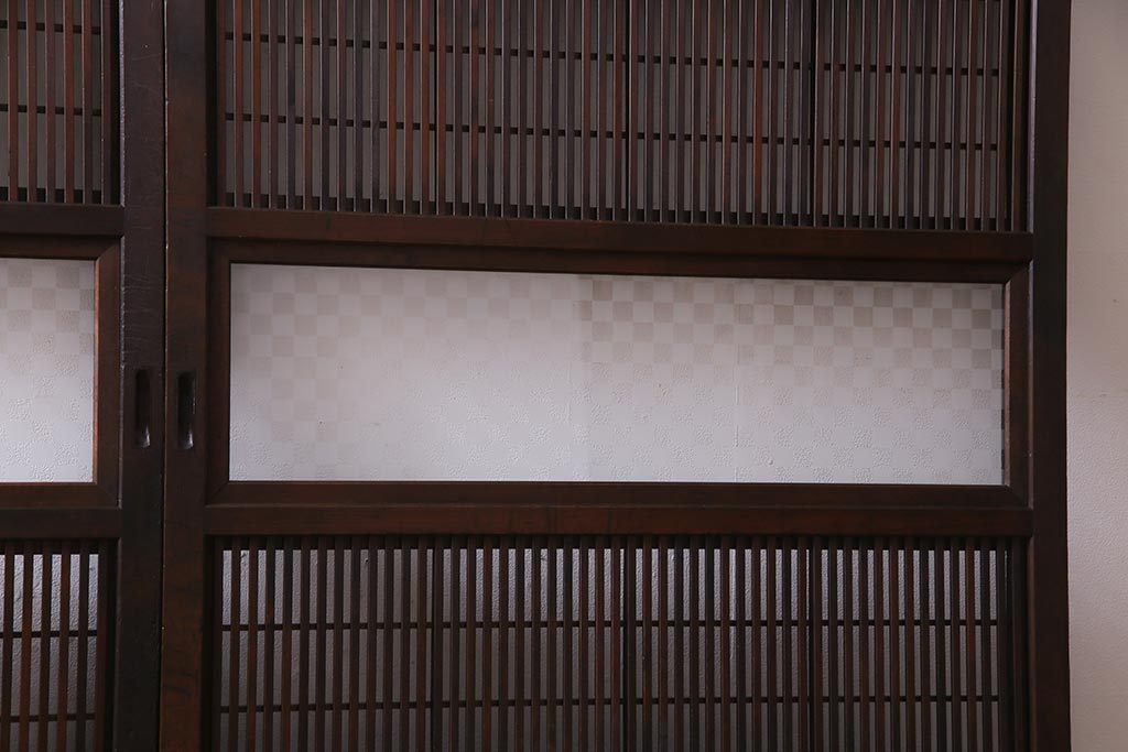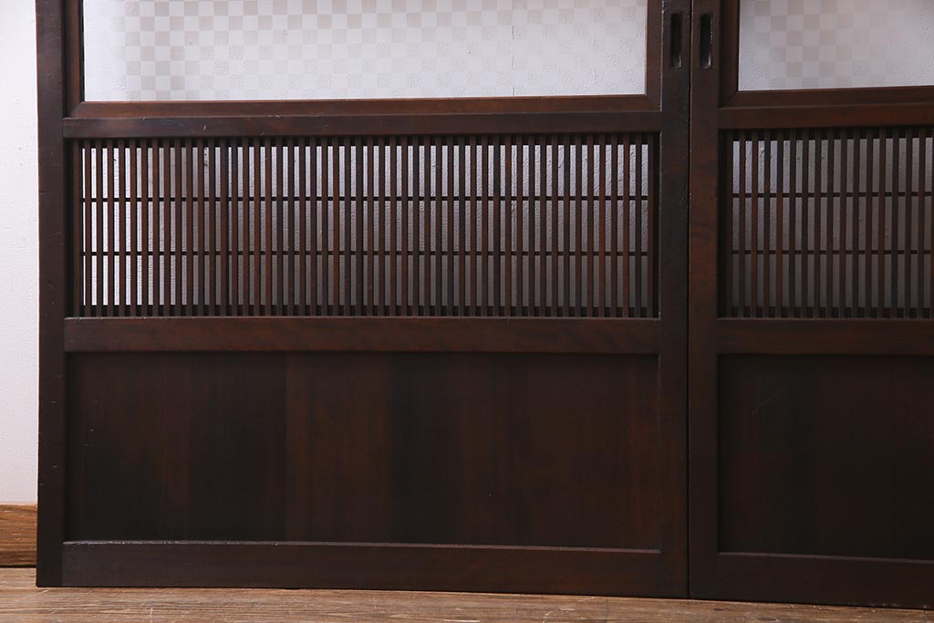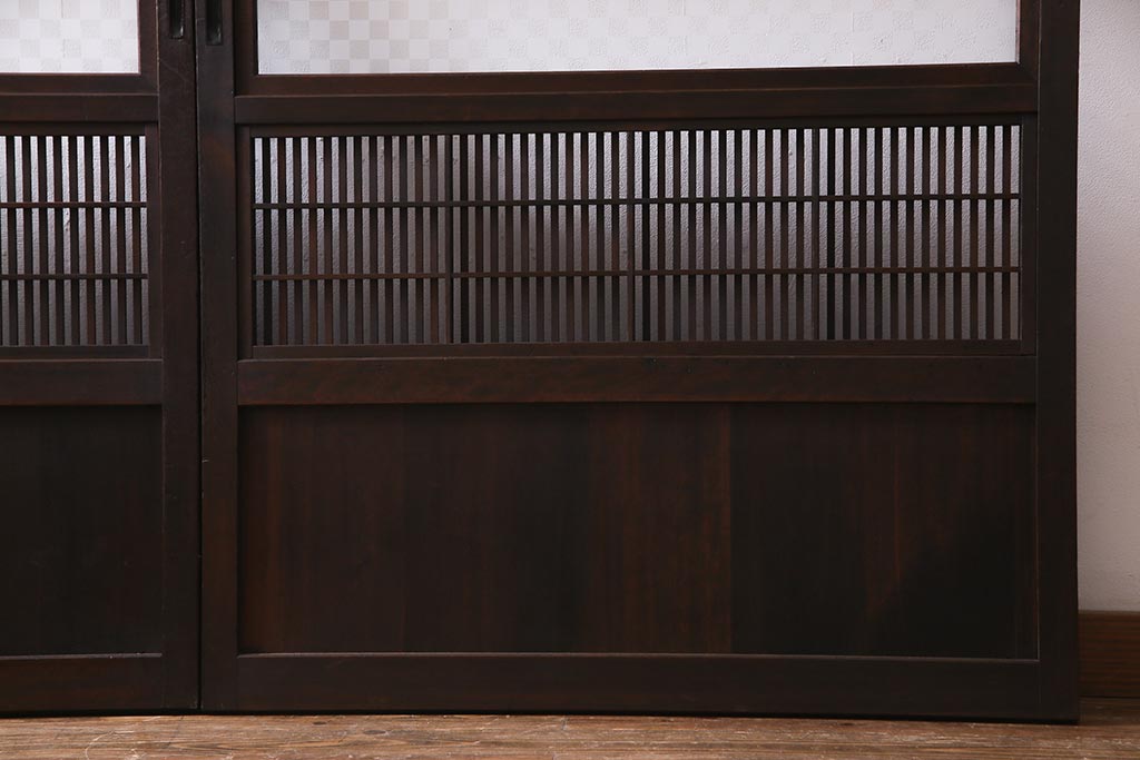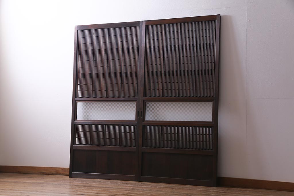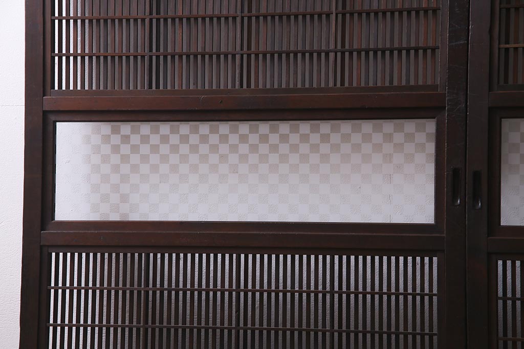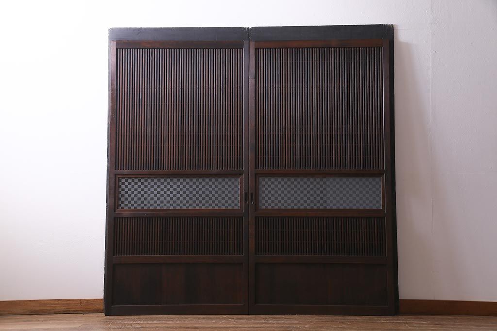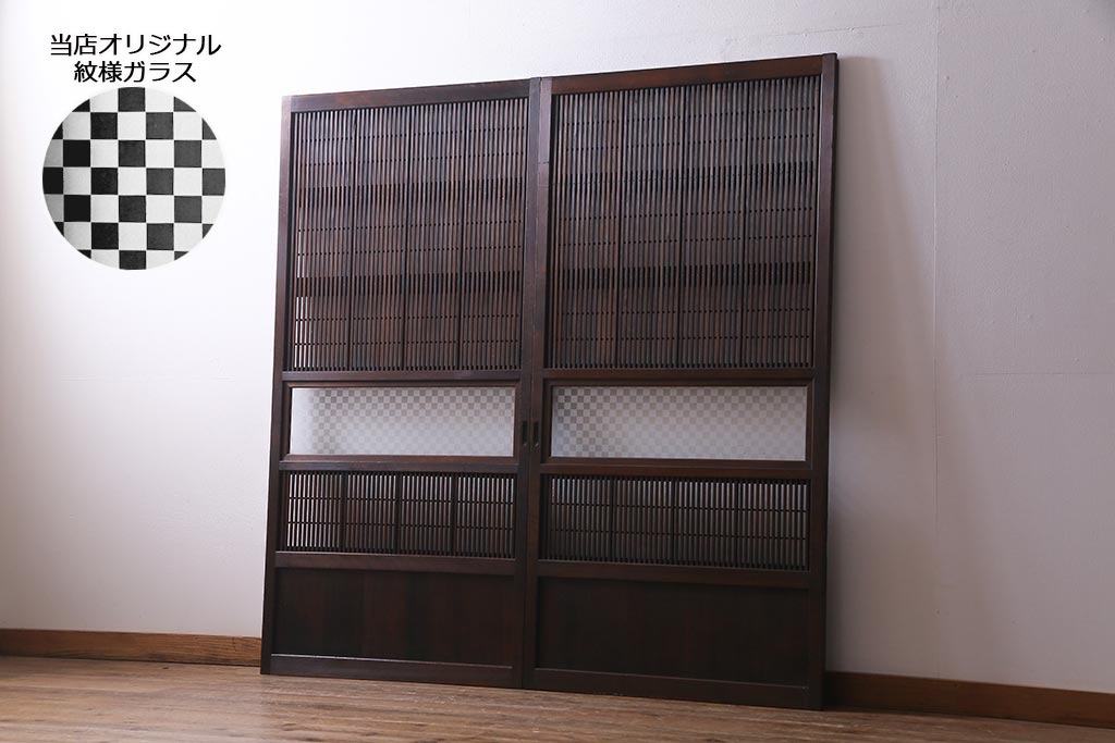 アンティーク建具 裏障子枠付き 当店オリジナルガラス 市松模様がモダンな格子戸2枚セット(建具、引き戸、ガラス帯戸)(R-037673)です。