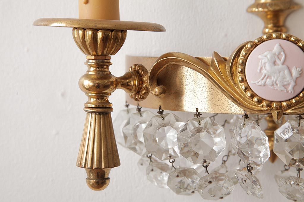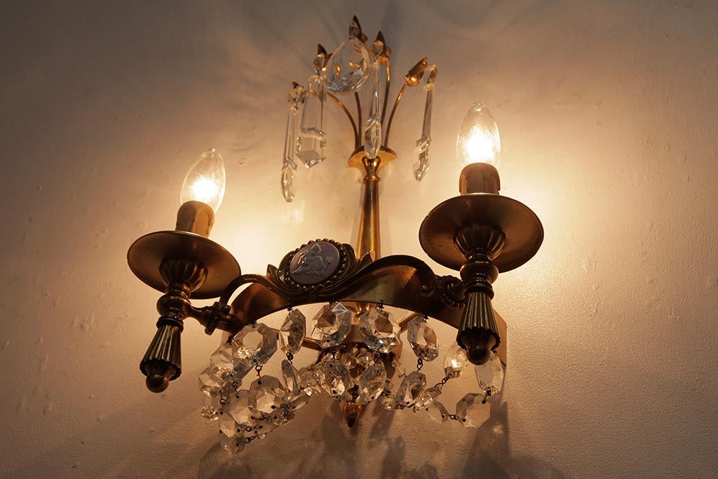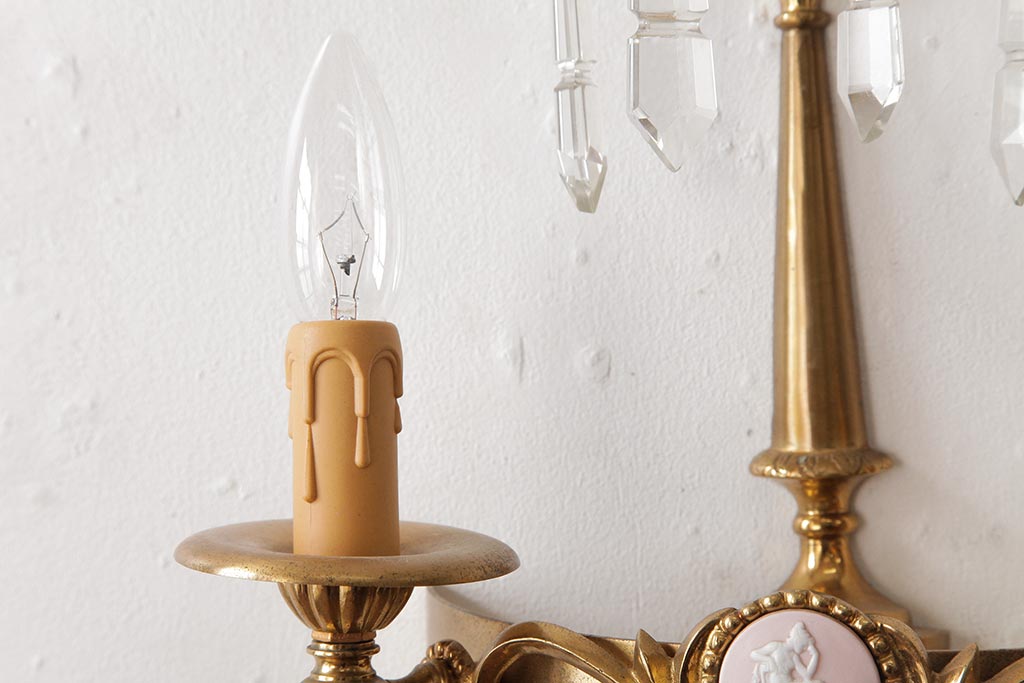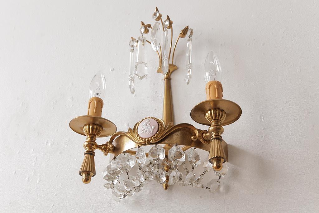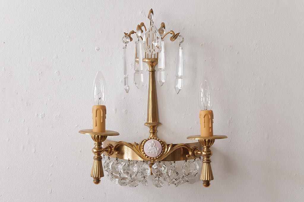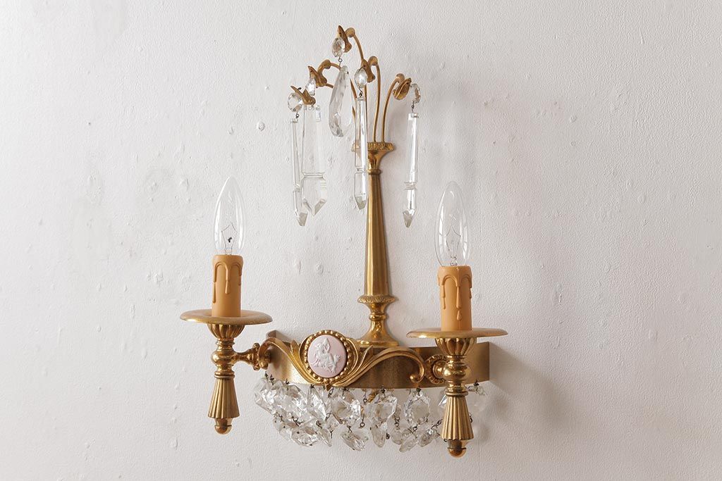 照明・ランプ> ウォールライト > ビンテージ照明 真鍮製 ガラスドロップとカメオがおしゃれなフランスヴィンテージのウォールランプ(壁掛けシャンデリア、壁付け照明)(R-037588)