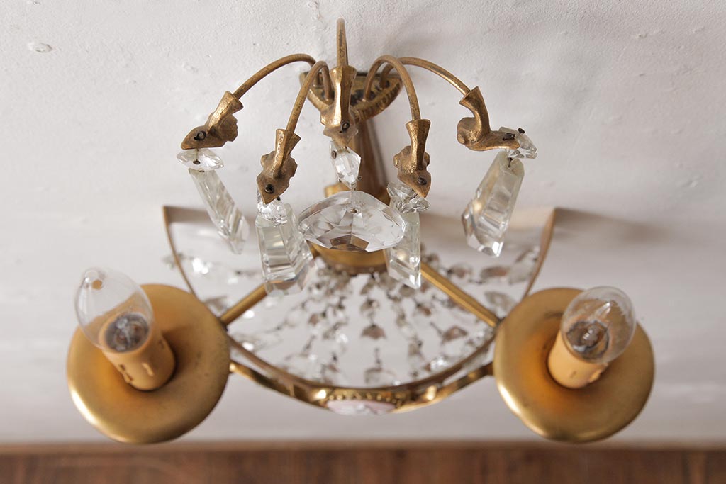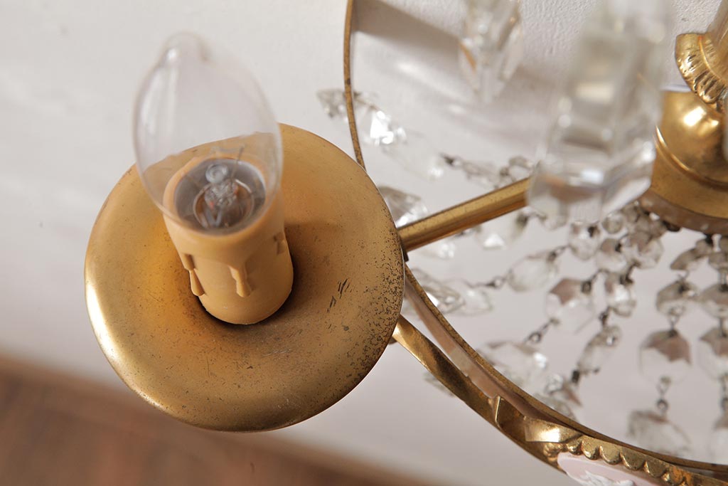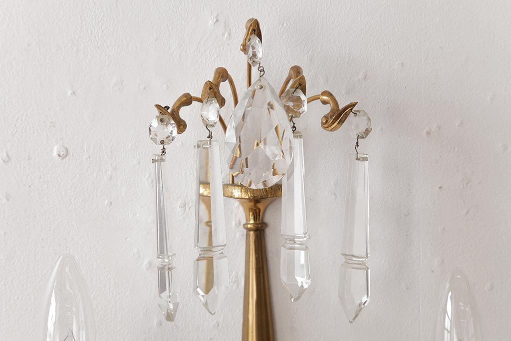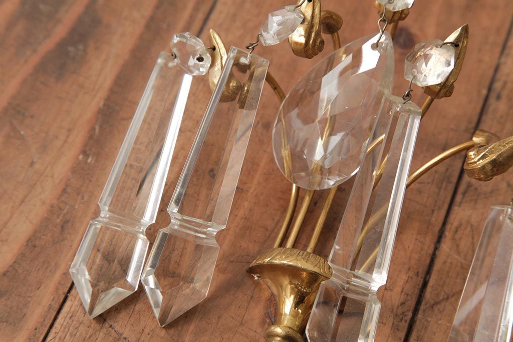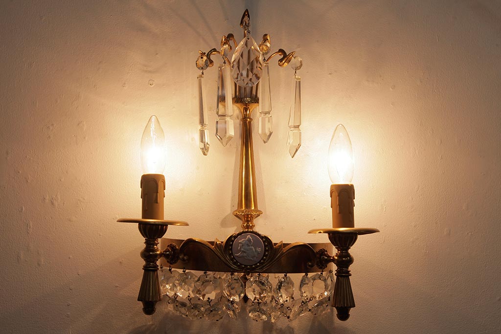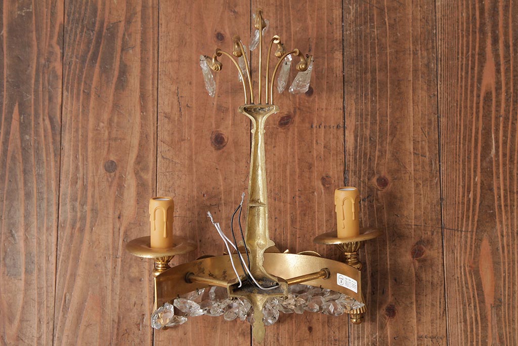 照明・ランプ> ウォールライト > ビンテージ照明 真鍮製 ガラスドロップとカメオがおしゃれなフランスヴィンテージのウォールランプ(壁掛けシャンデリア、壁付け照明)(R-037588)