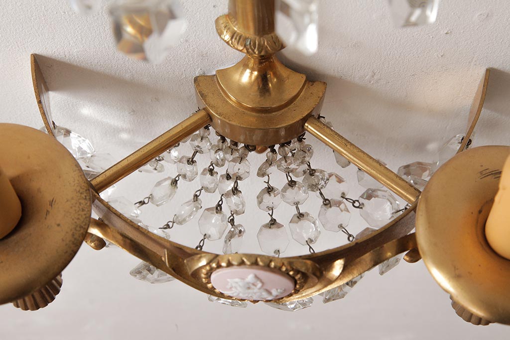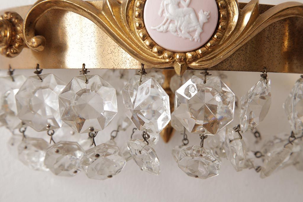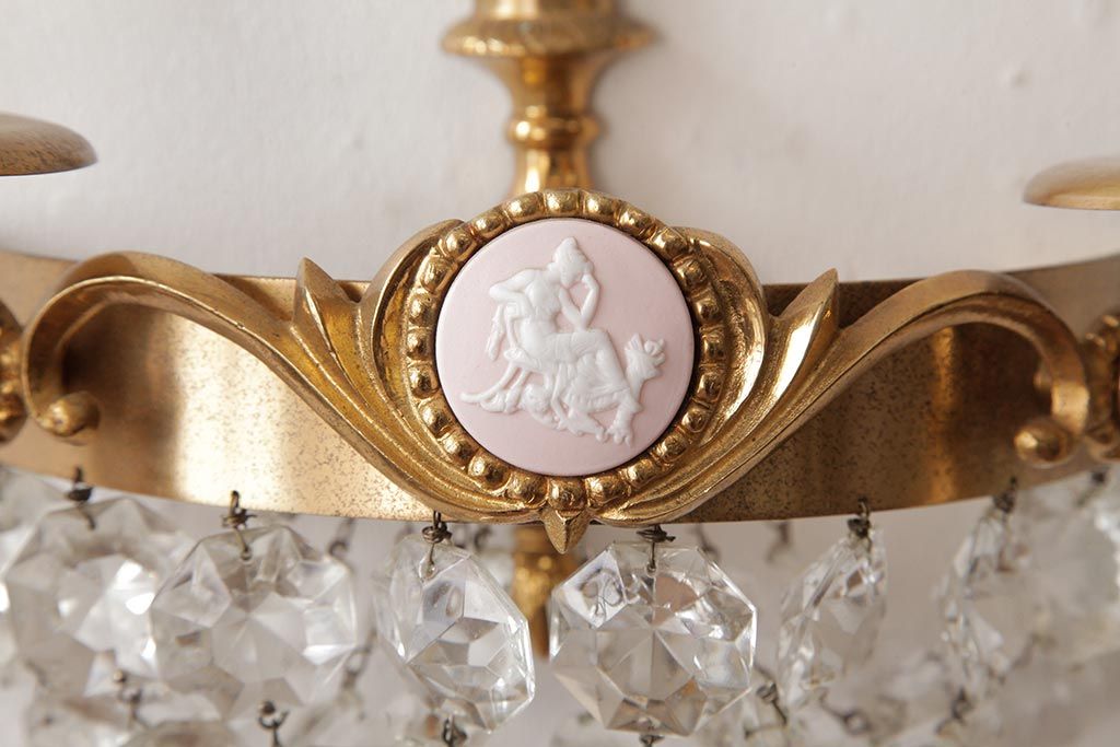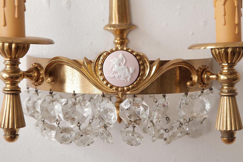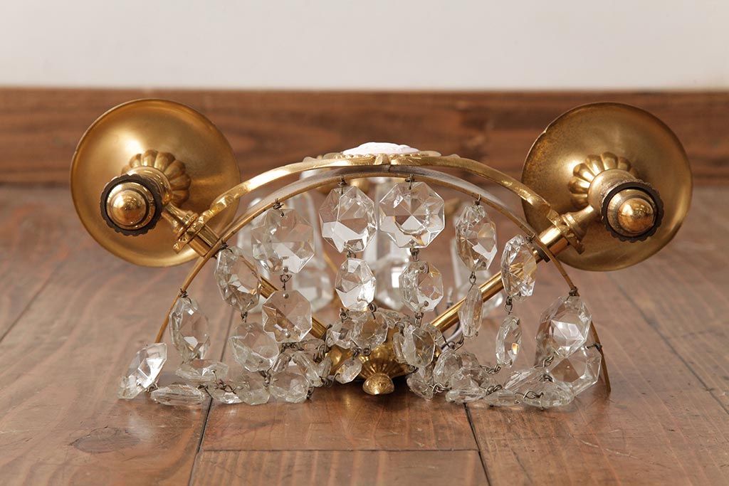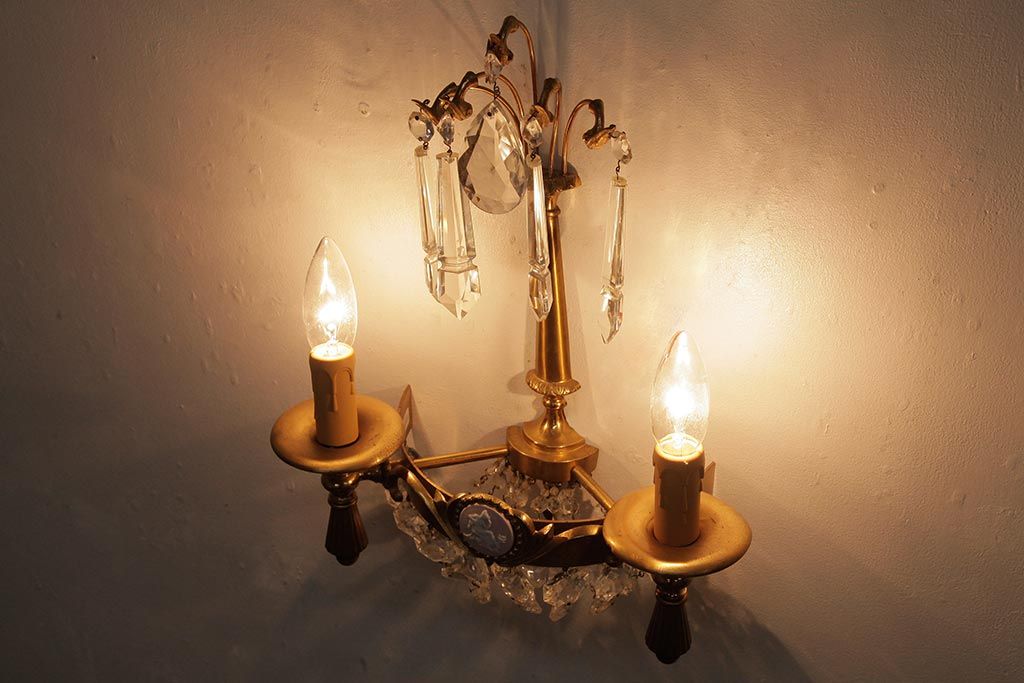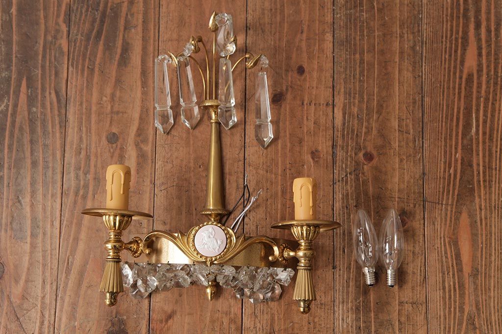 照明・ランプ> シャンデリア > ビンテージ照明 真鍮製 ガラスドロップとカメオがおしゃれなフランスヴィンテージのウォールランプ(壁掛けシャンデリア、壁付け照明)(R-037588)