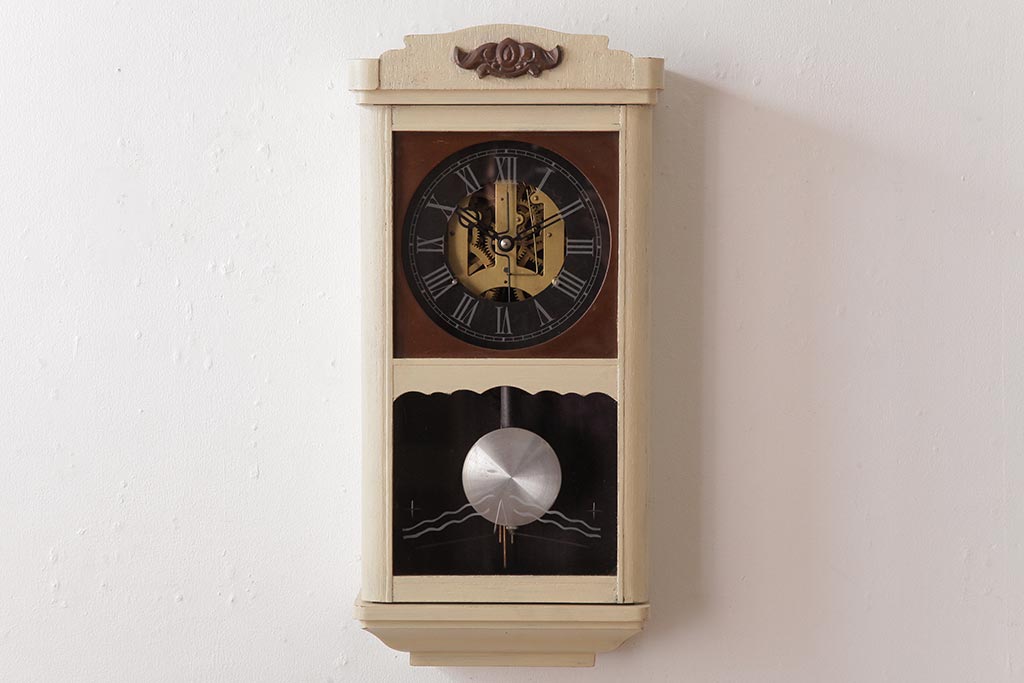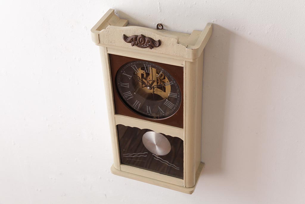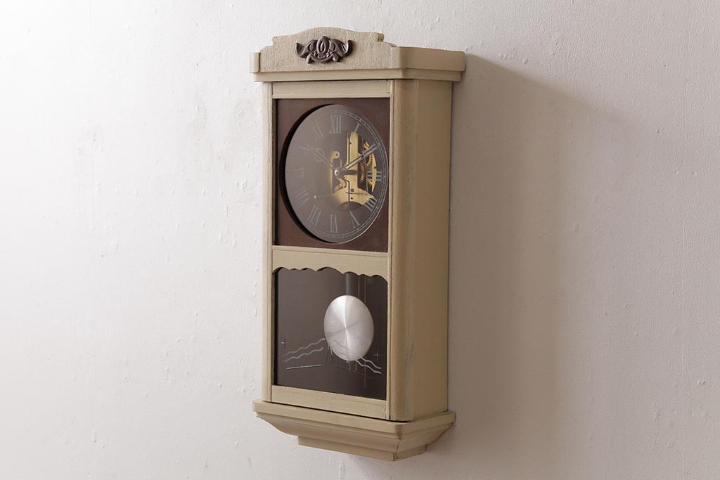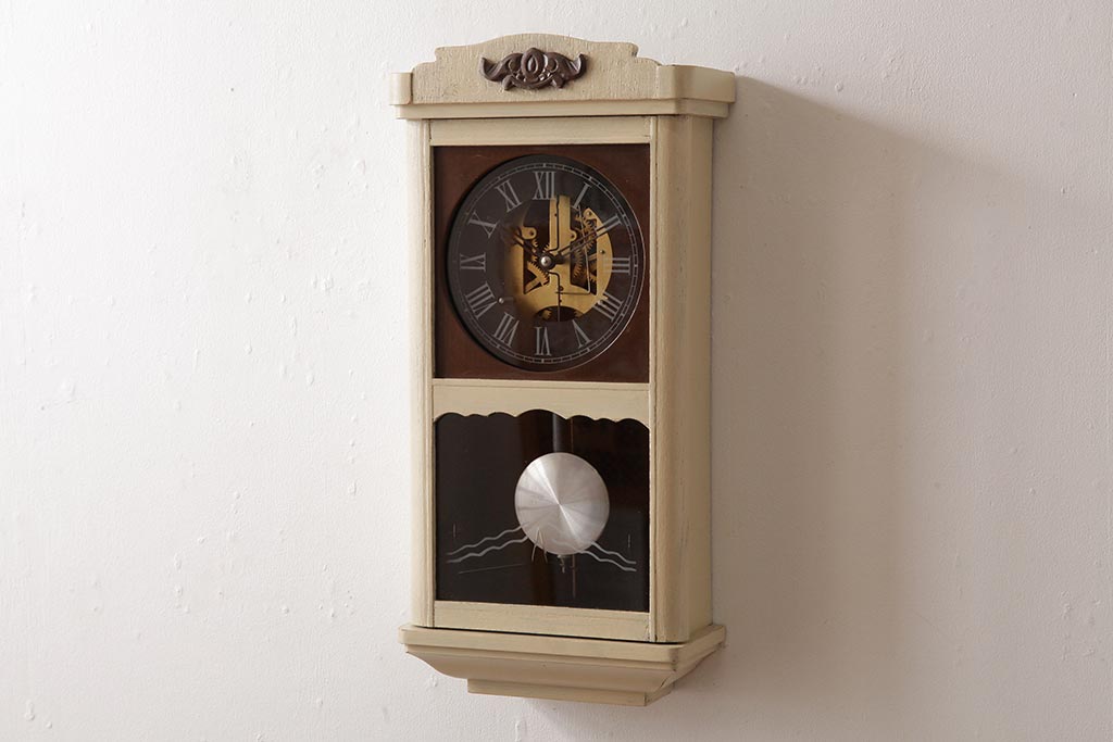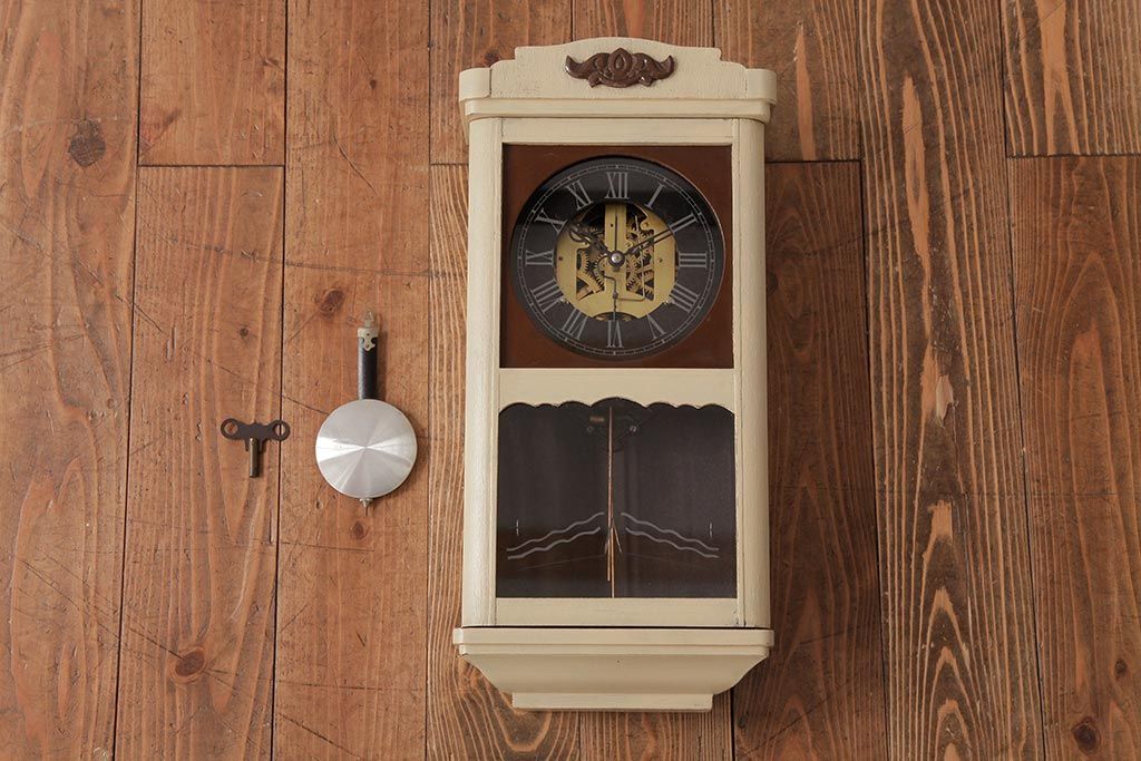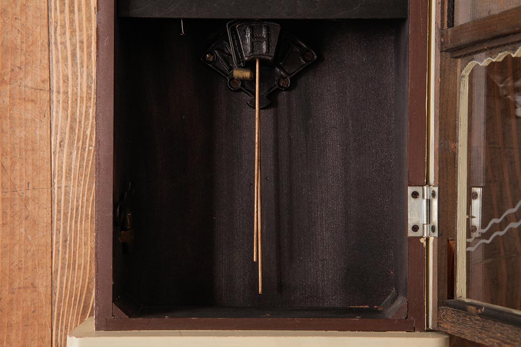 時計> 掛け時計 > ビンテージ雑貨 ペイント 堀田時計店 N.H.T スケルトン仕様のレトロシックなゼンマイ式柱時計(振り子時計、壁掛け時計)(R-037668)