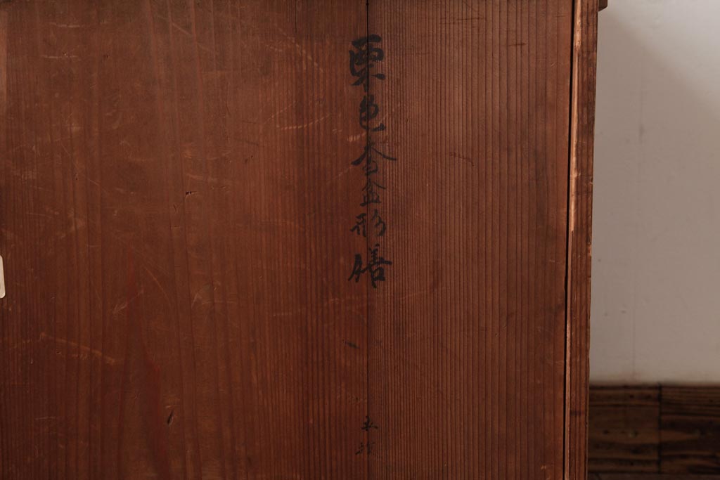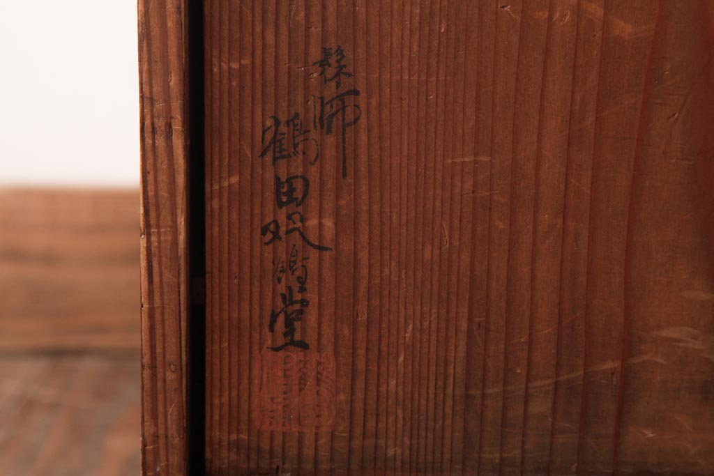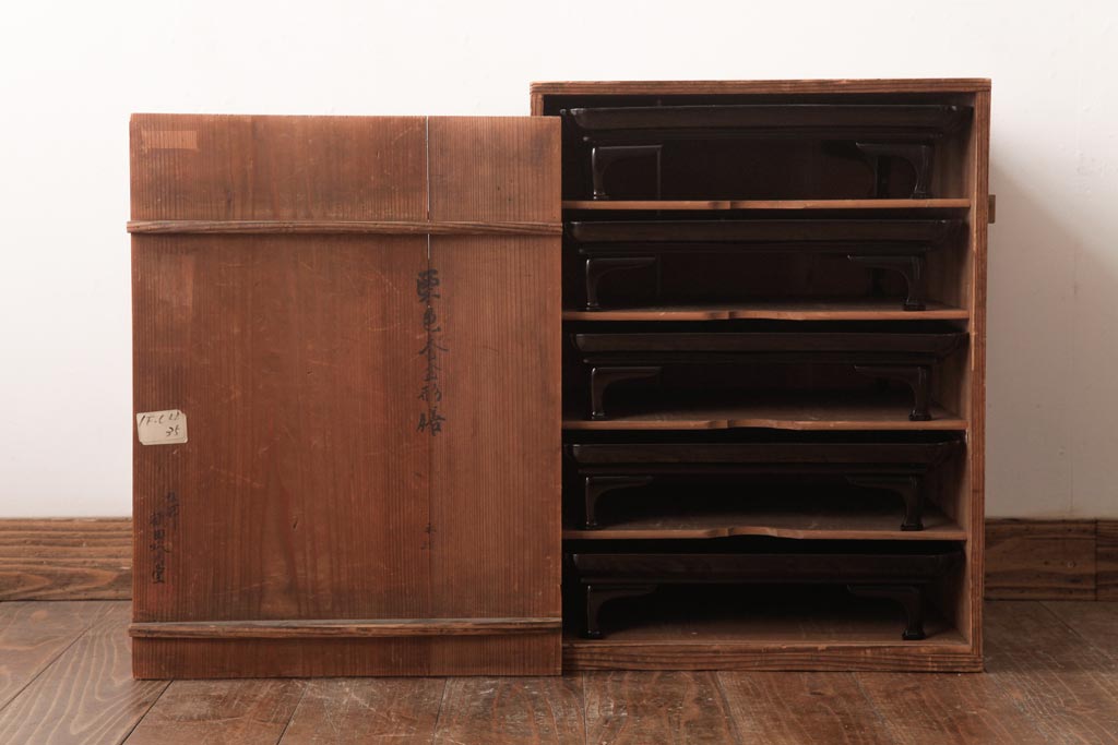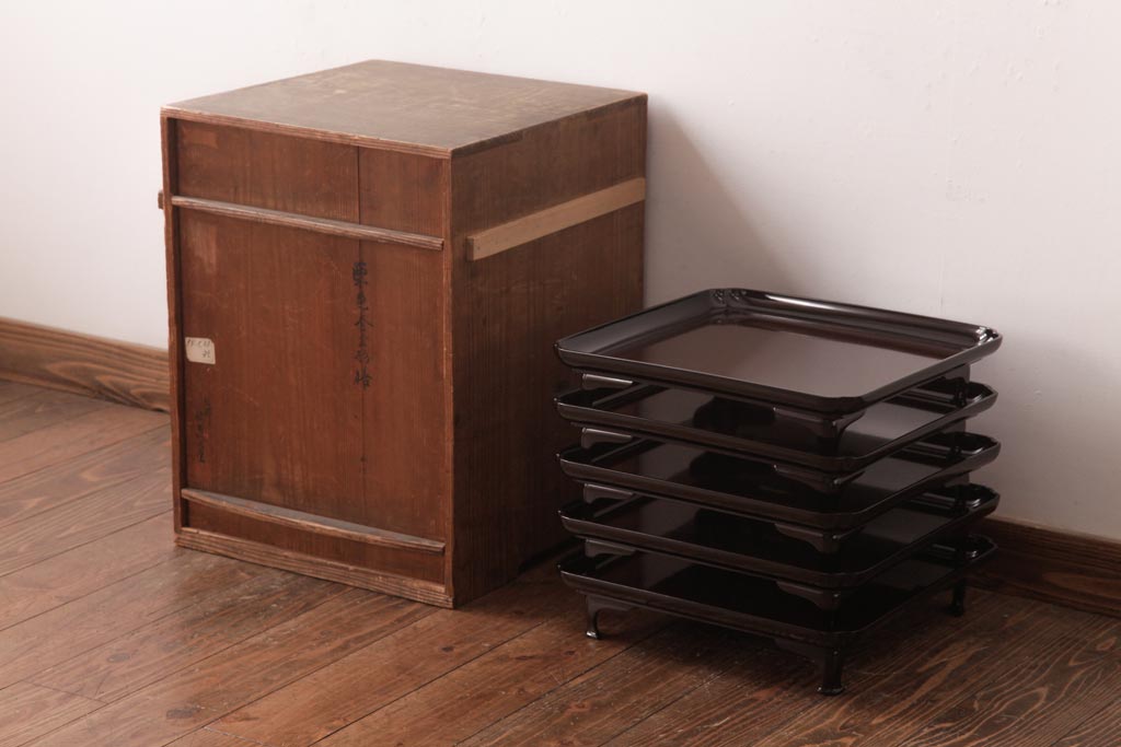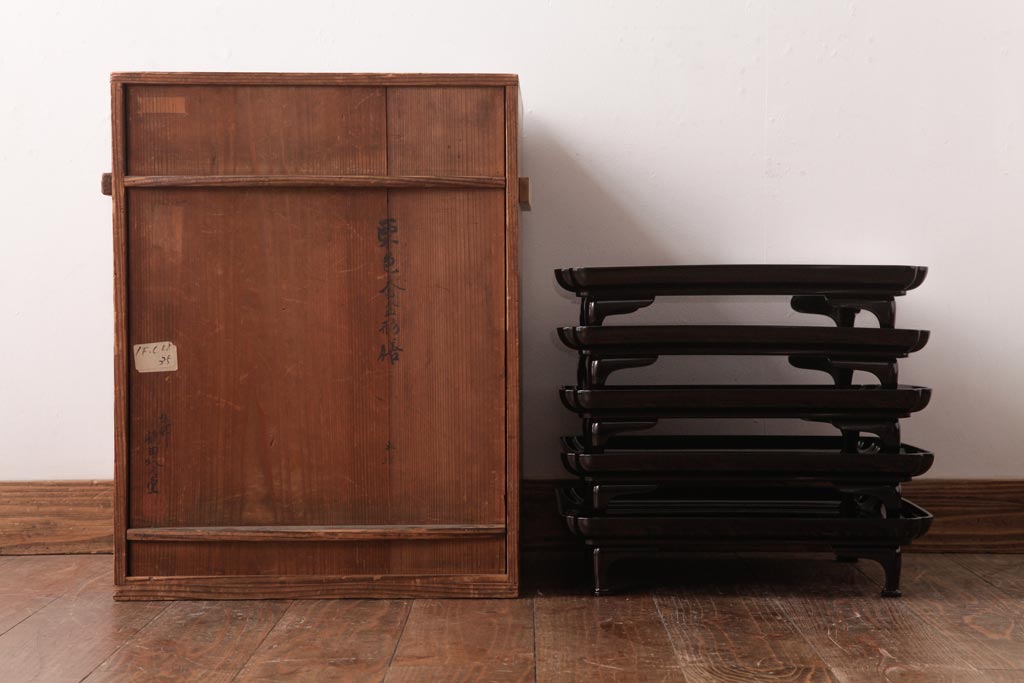 ラフジュ工房> 骨董・美術品> 骨董-漆器 > アンティーク雑貨 鶴田双鶴銅 栗色香盆形木製膳5客セット・箱付き(お膳、漆器、脚付膳、和食器)(R-036260)
