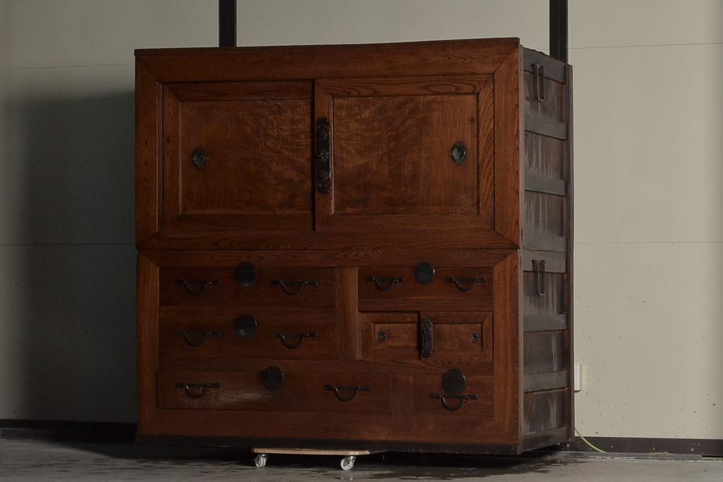 アンティーク家具 六尺 前面ケヤキ材 極太框 上質な空間を演出する収納箪笥(夜具箪笥、水屋箪笥、布団箪笥、キャビネット、収納棚、戸棚)(R-036651)