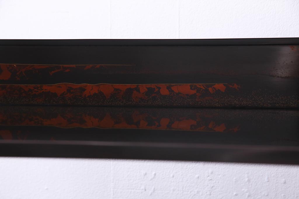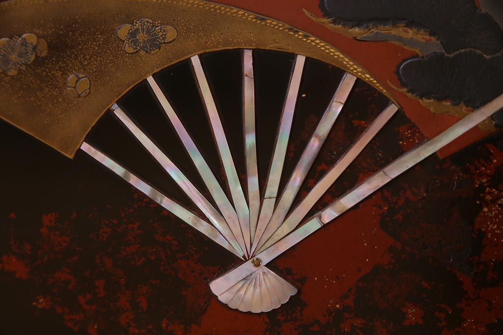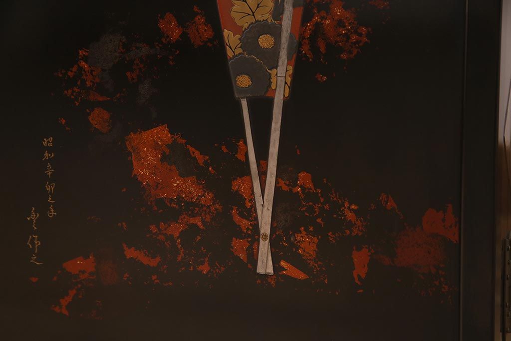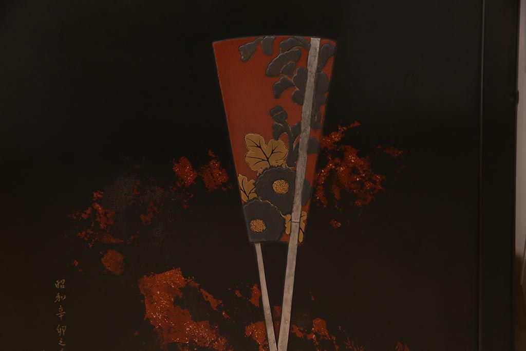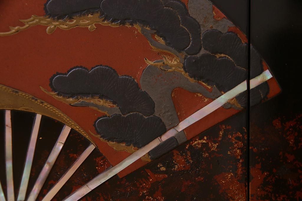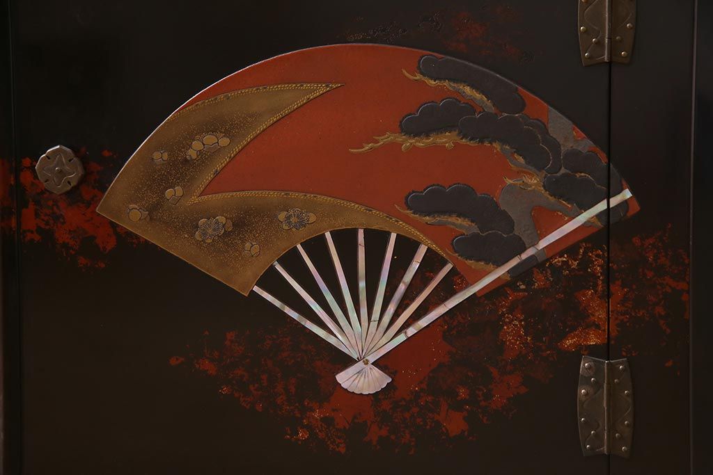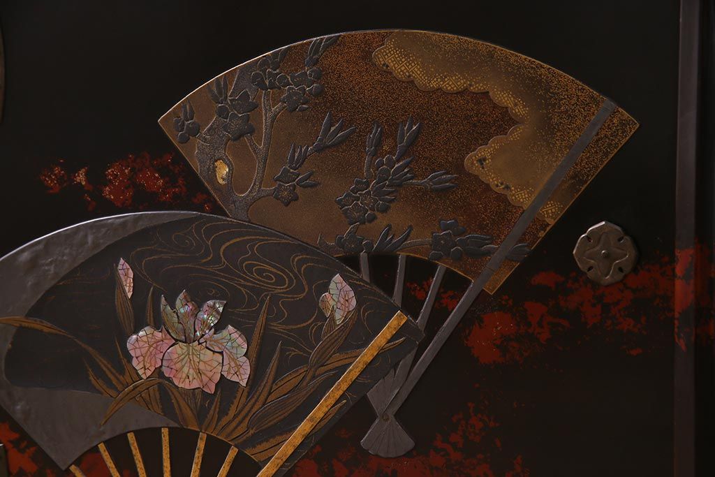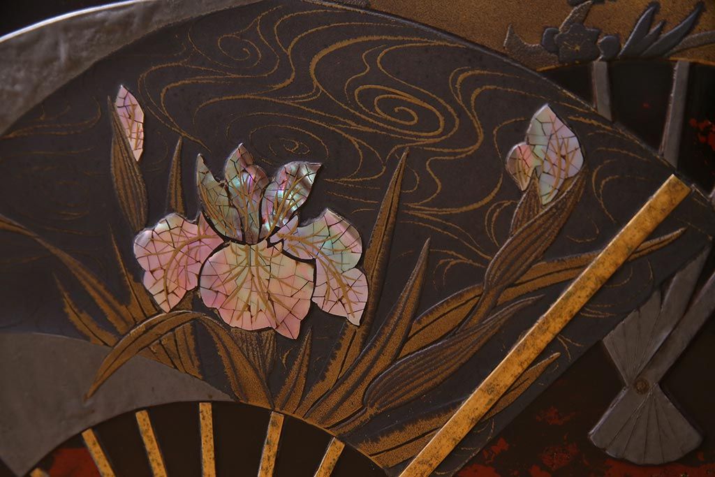赤や金、鈍色、螺鈿細工で扇や菖蒲、松などが描かれており
