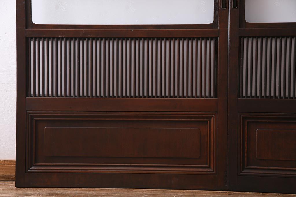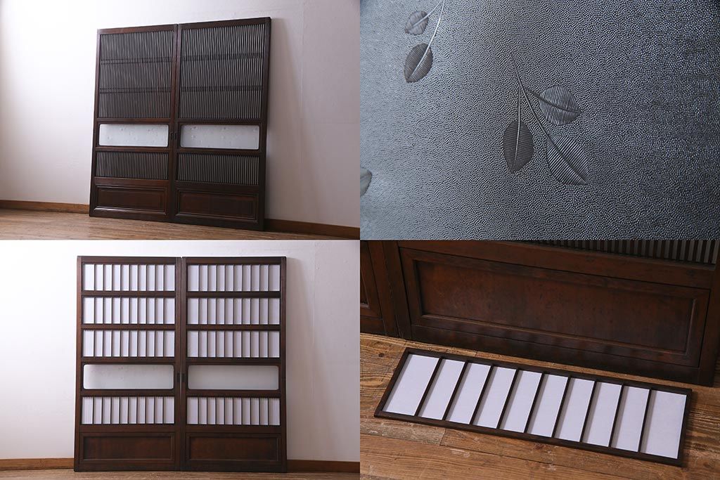ドア・建具> 2枚・3枚セット > アンティーク建具 和製アンティーク 大正昭和初期 裏障子付き 小さな葉っぱ模様のガラスと細かな縦桟が目を引く格子戸2枚セット(引き戸、障子戸、建具)(R-037744)
