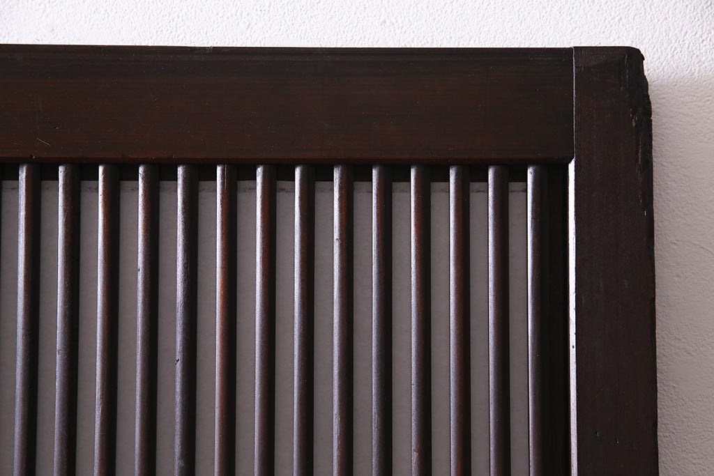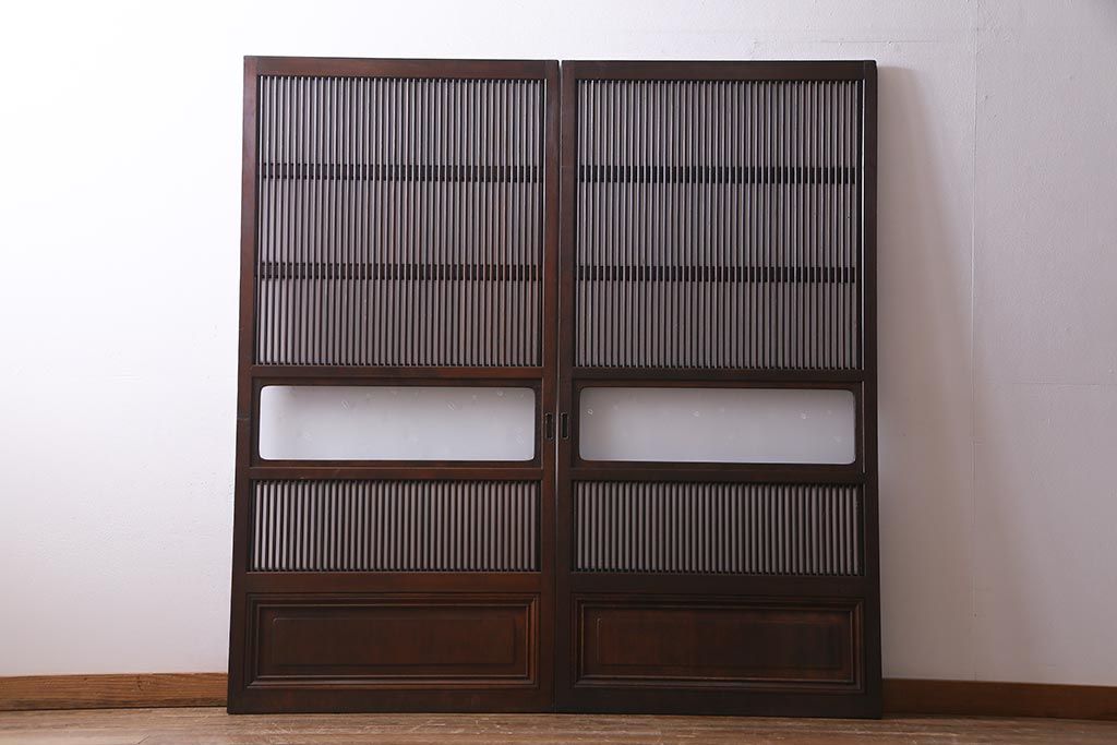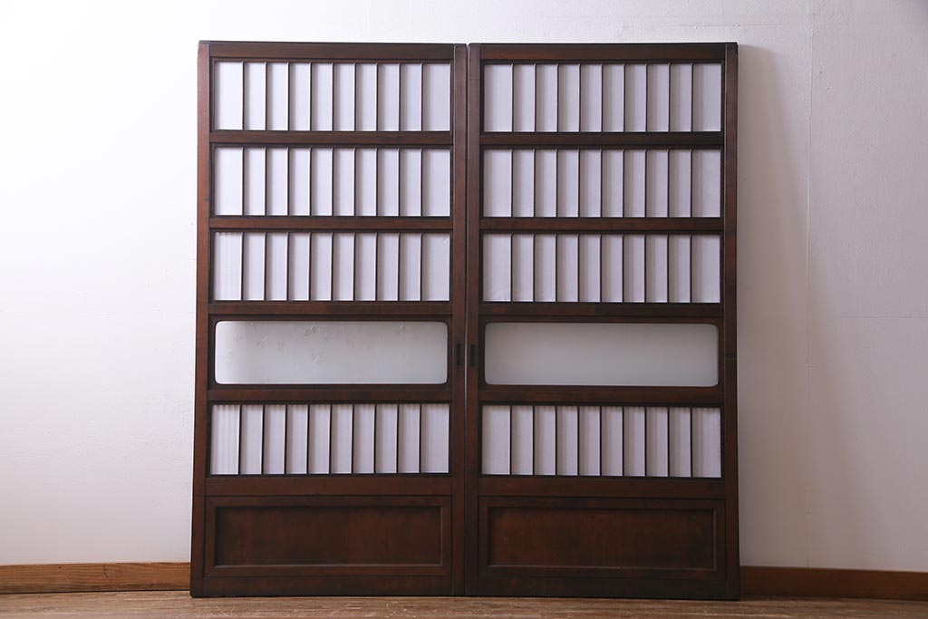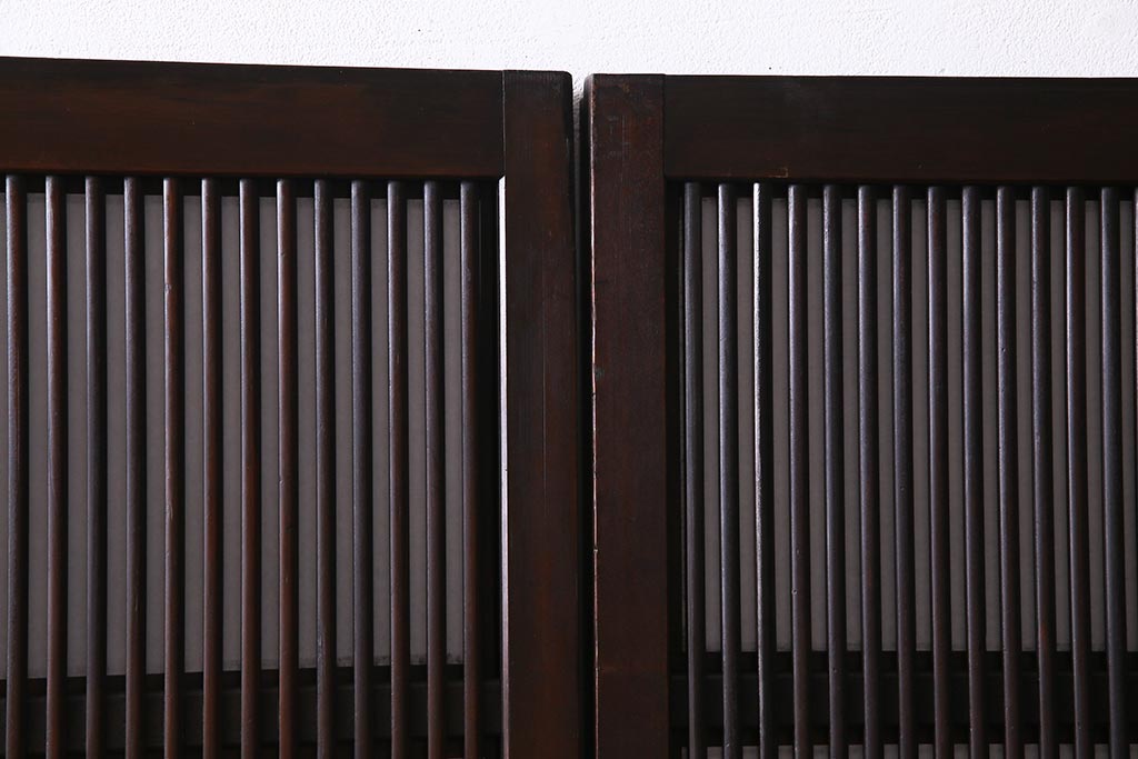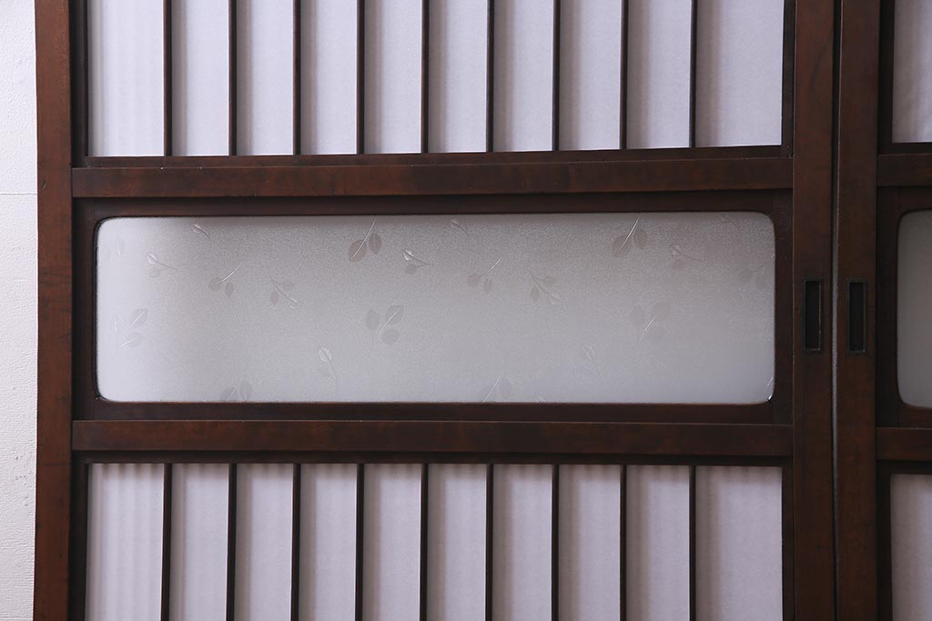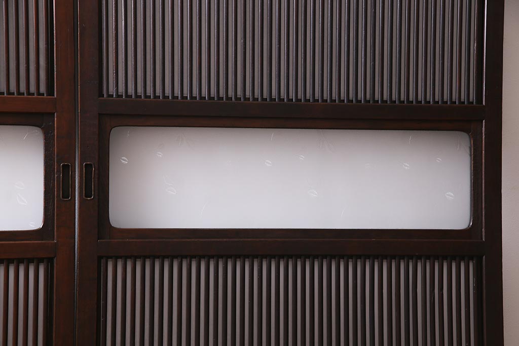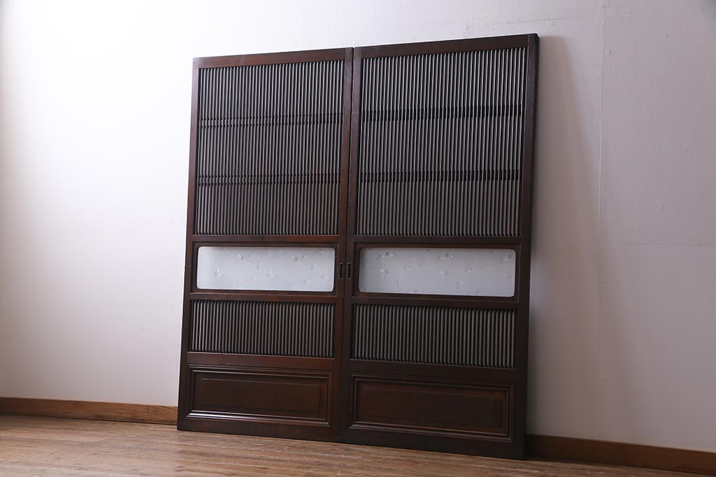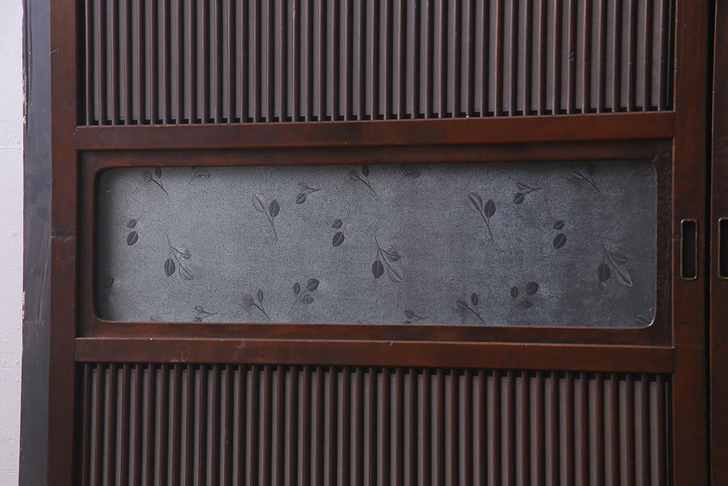 ドア・建具> 格子戸 > アンティーク建具 和製アンティーク 大正昭和初期 裏障子付き 小さな葉っぱ模様のガラスと細かな縦桟が目を引く格子戸2枚セット(引き戸、障子戸、建具)(R-037744)