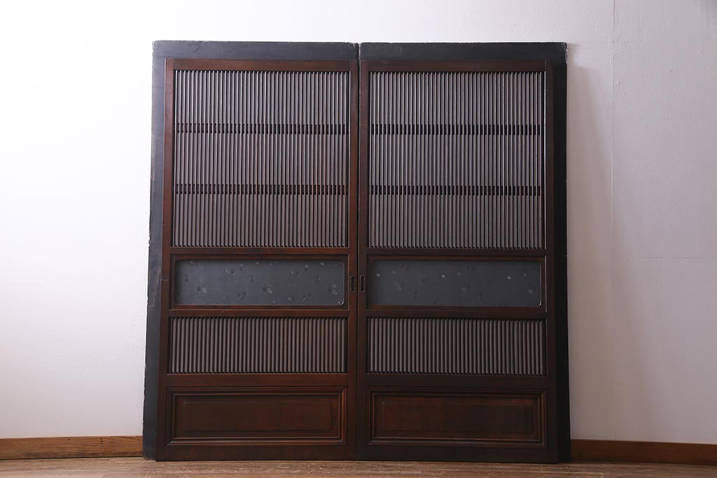 アンティーク建具 和製アンティーク 大正昭和初期 裏障子付き 小さな葉っぱ模様のガラスと細かな縦桟が目を引く格子戸2枚セット(引き戸、障子戸、建具)(R-037744)