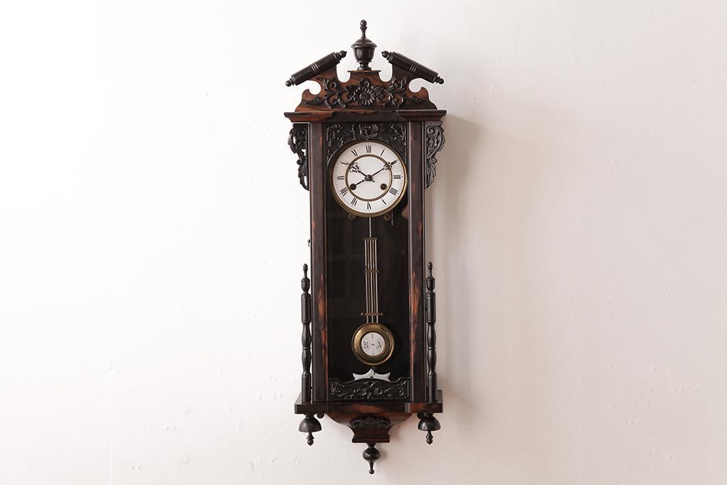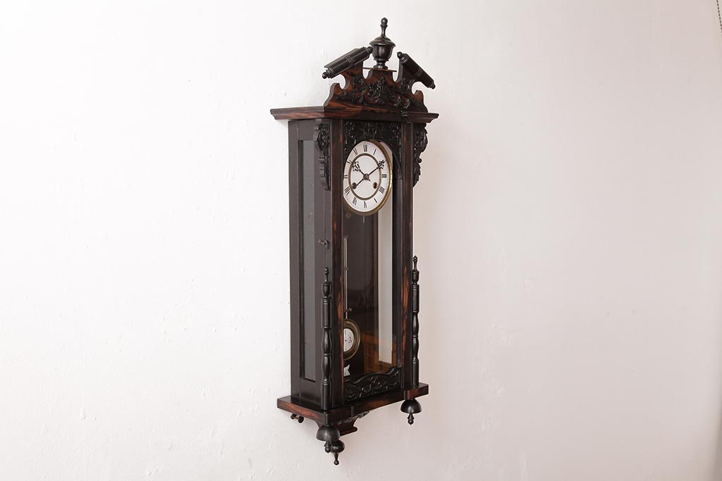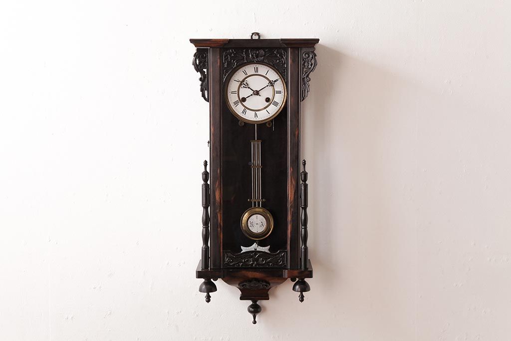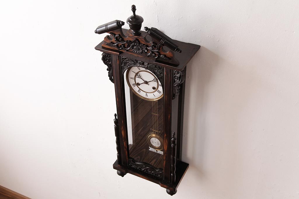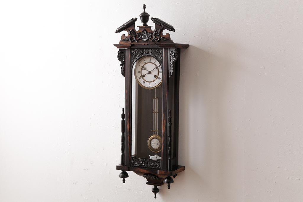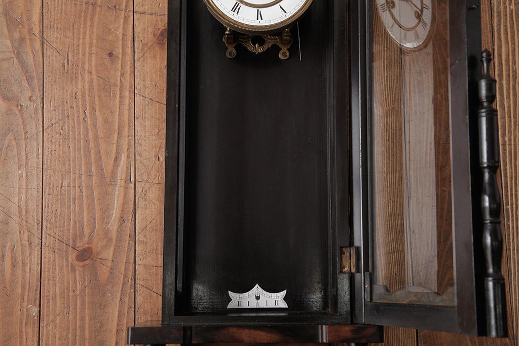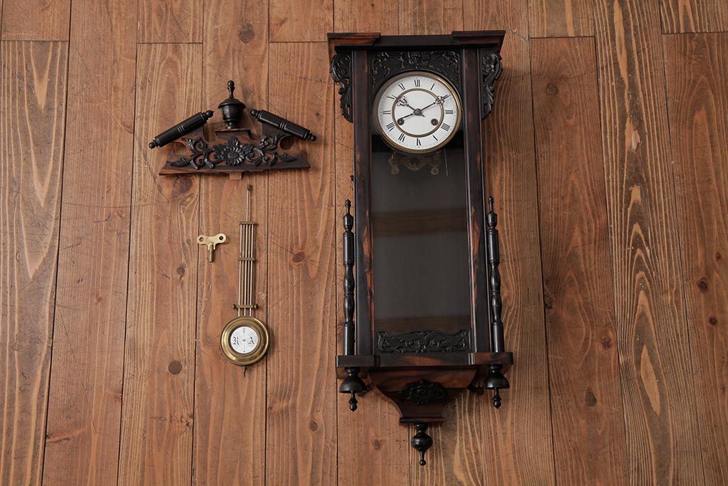 時計> 掛け時計 > アンティーク雑貨 トレードマーク・トンボ 手巻き式 ホーロー文字盤(琺瑯) 黒柿スリゲル掛け時計(ユンハンス風、柱時計、振り子時計)(R-037699)