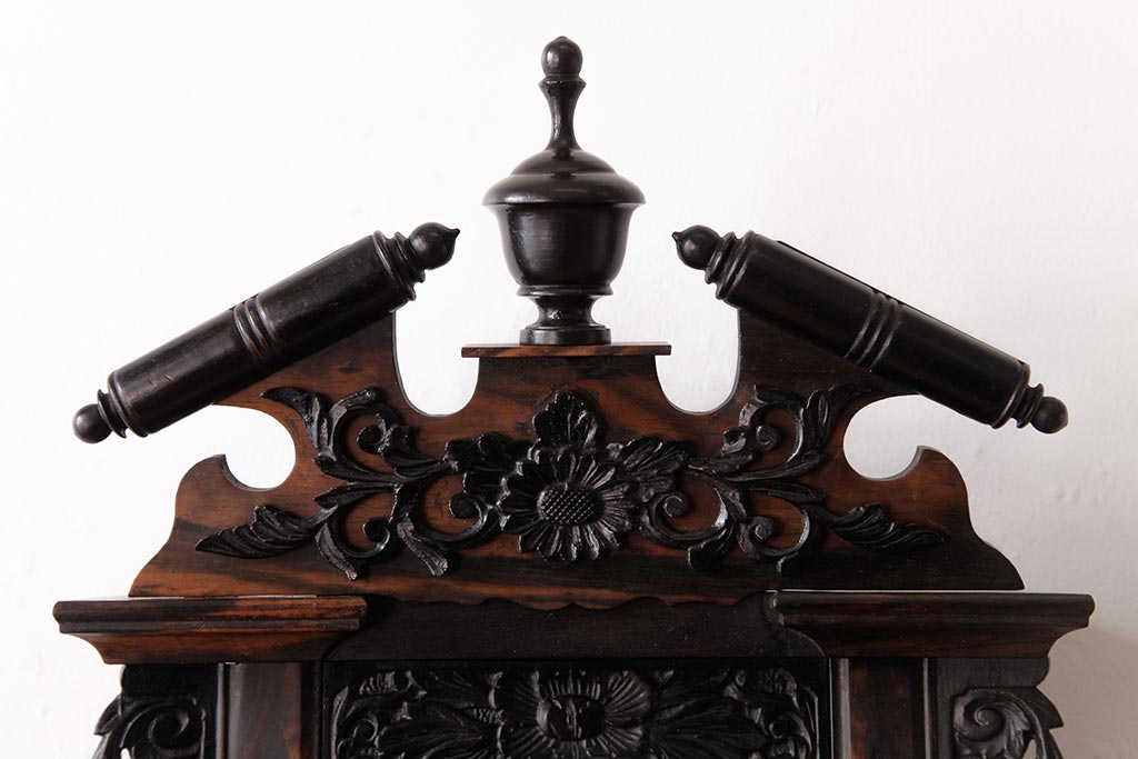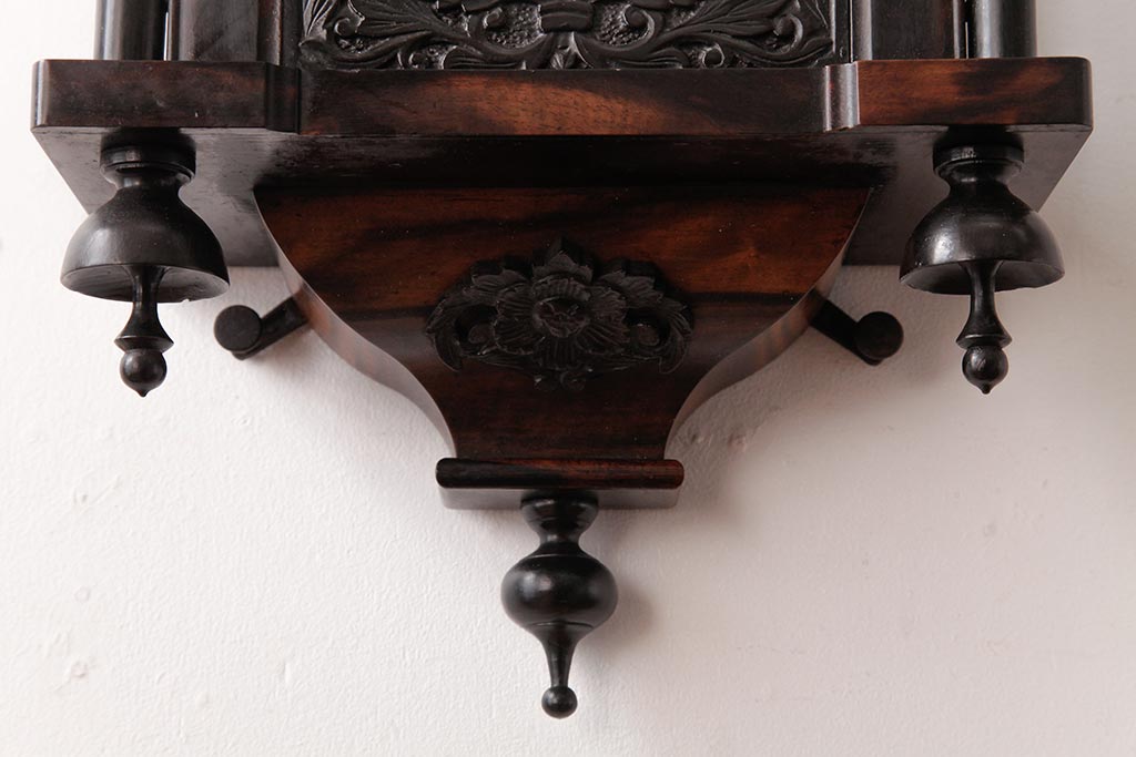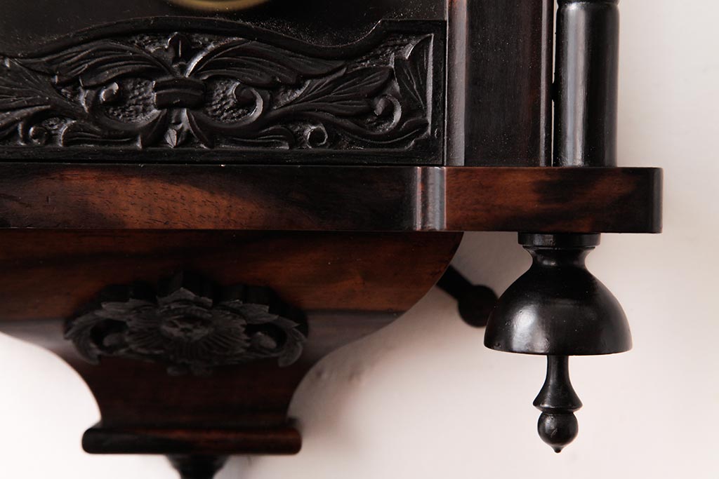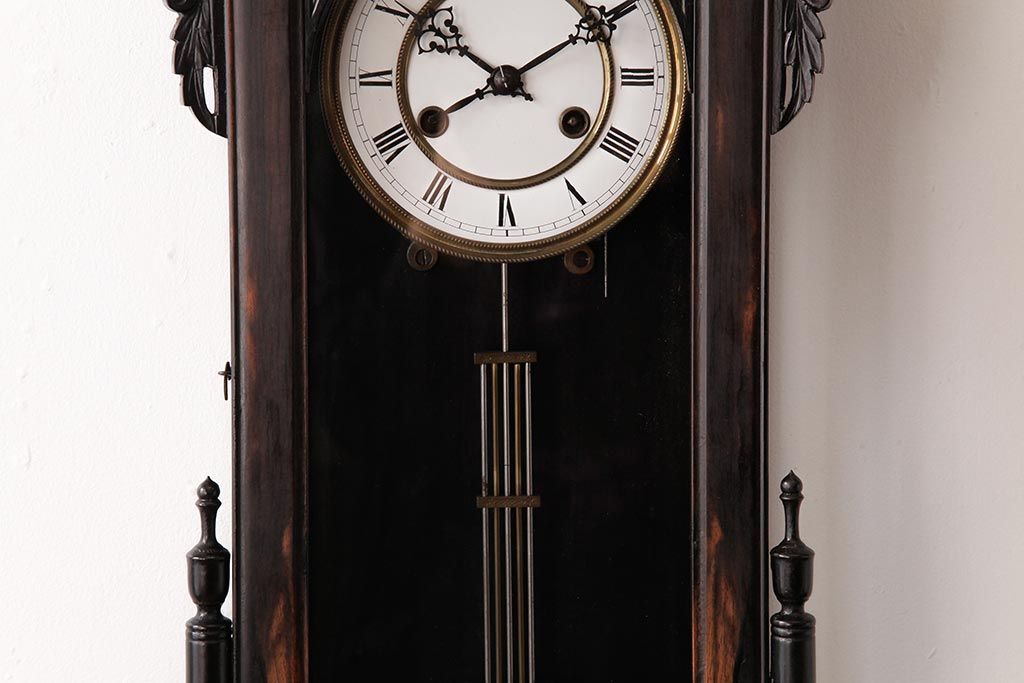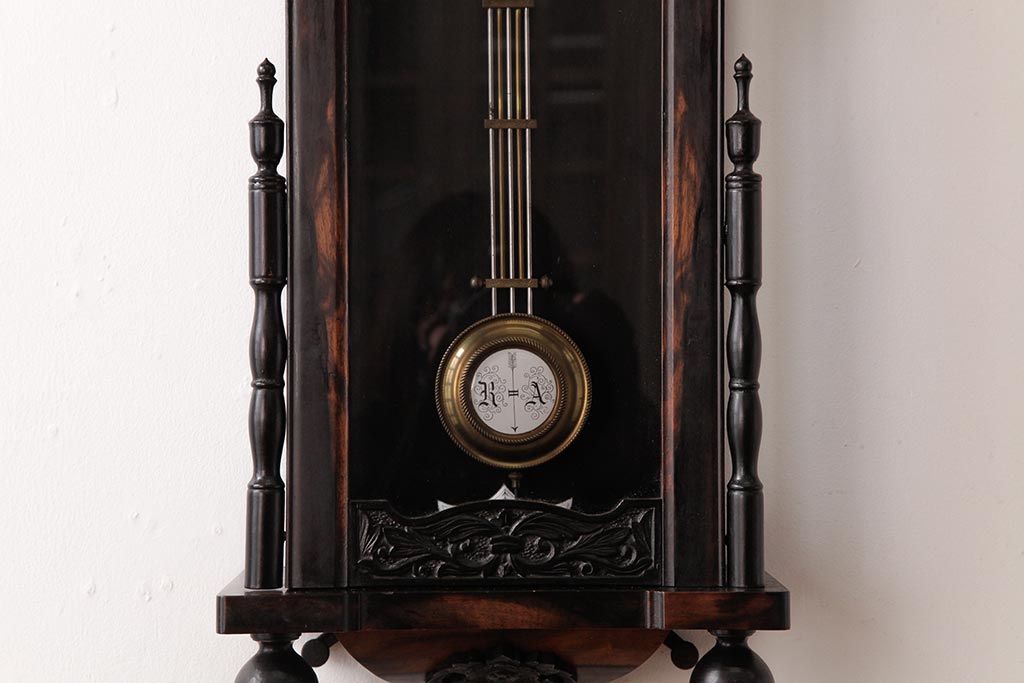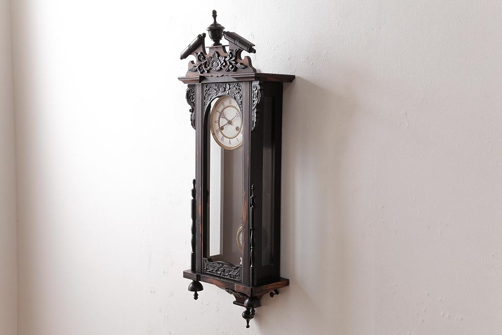 時計> 掛け時計 > アンティーク雑貨 トレードマーク・トンボ 手巻き式 ホーロー文字盤(琺瑯) 黒柿スリゲル掛け時計(ユンハンス風、柱時計、振り子時計)(R-037699)