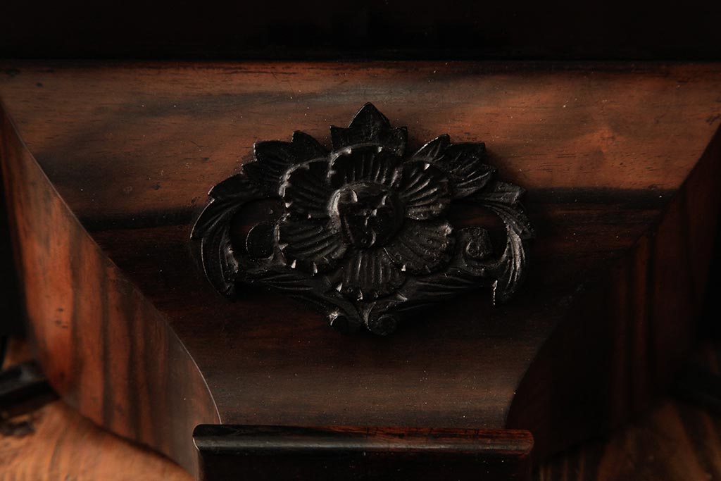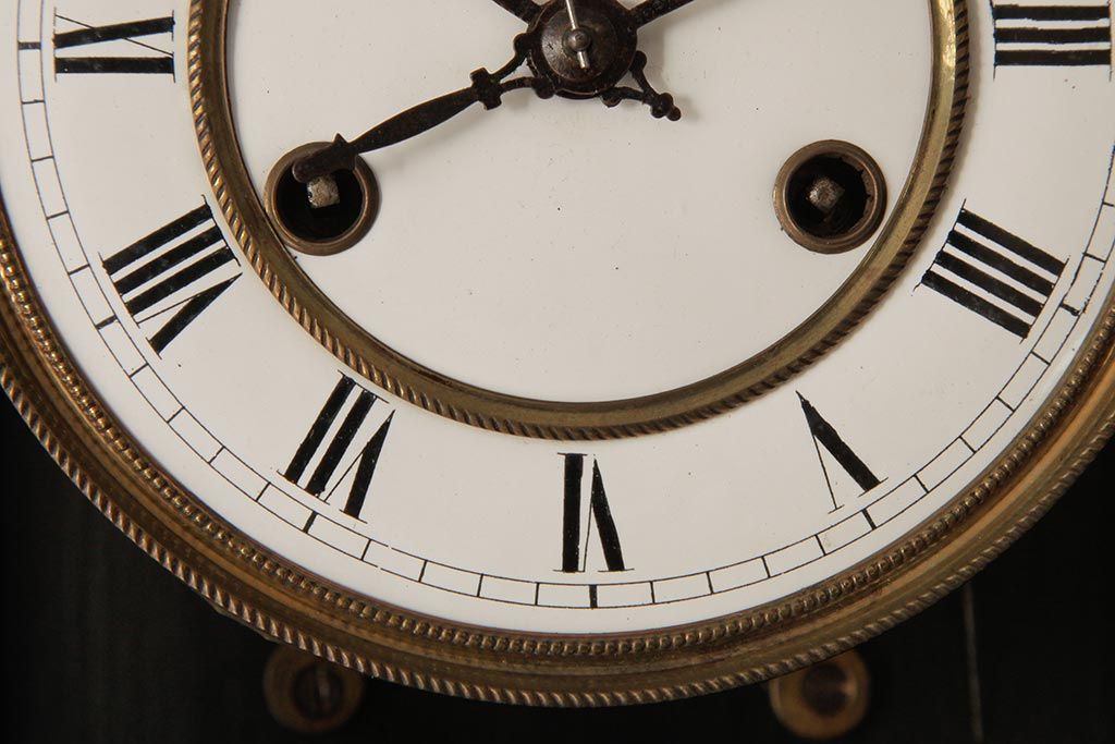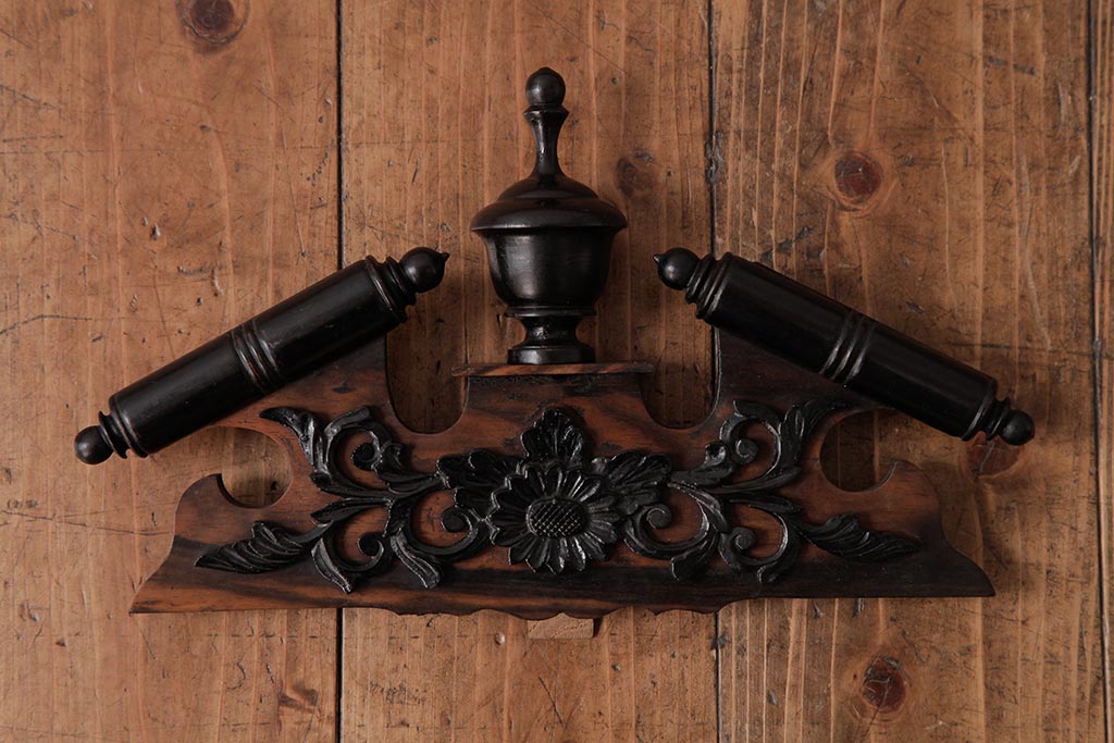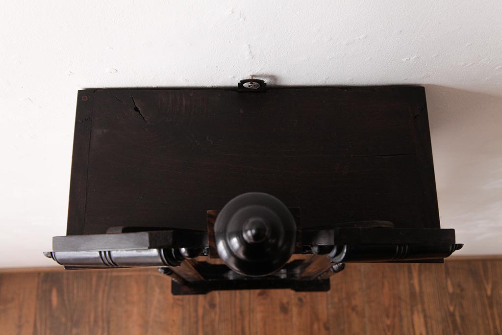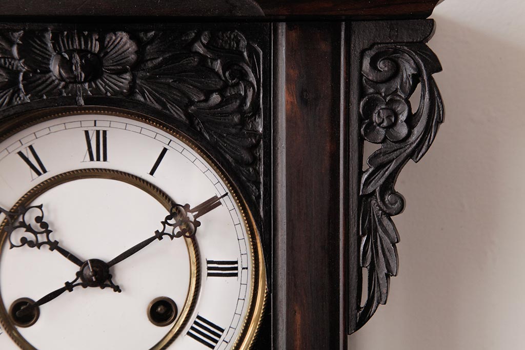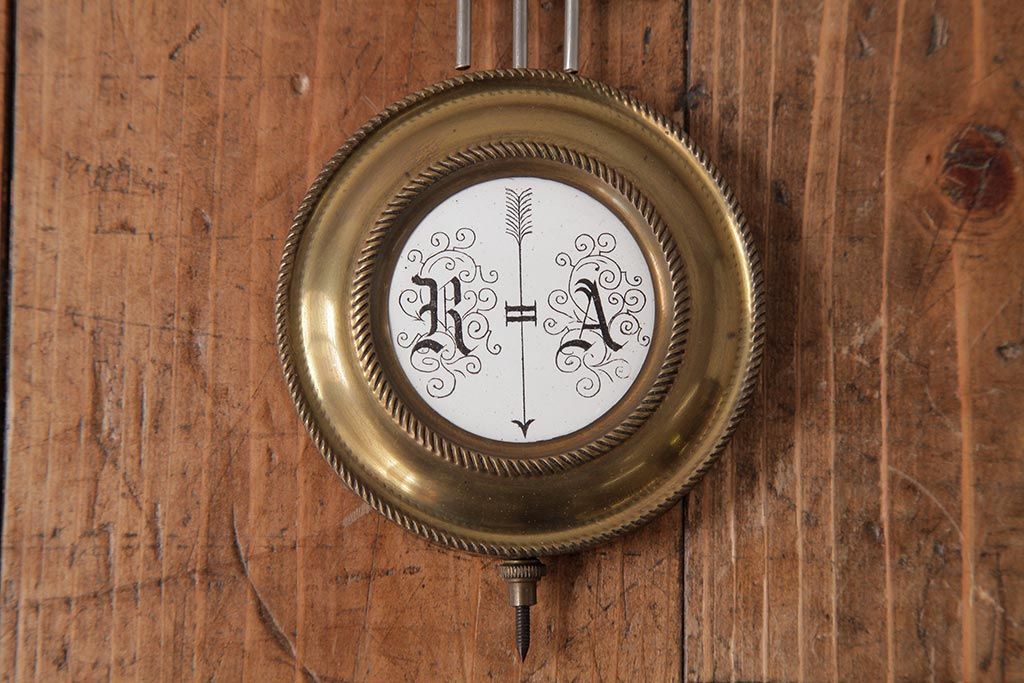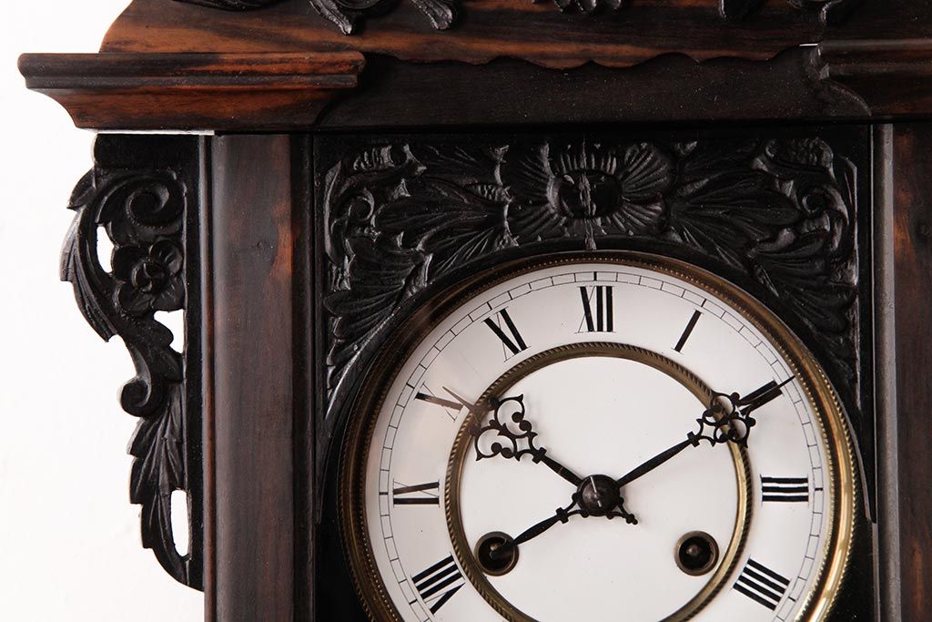 時計> 掛け時計 > アンティーク雑貨 トレードマーク・トンボ 手巻き式 ホーロー文字盤(琺瑯) 黒柿スリゲル掛け時計(ユンハンス風、柱時計、振り子時計)(R-037699)