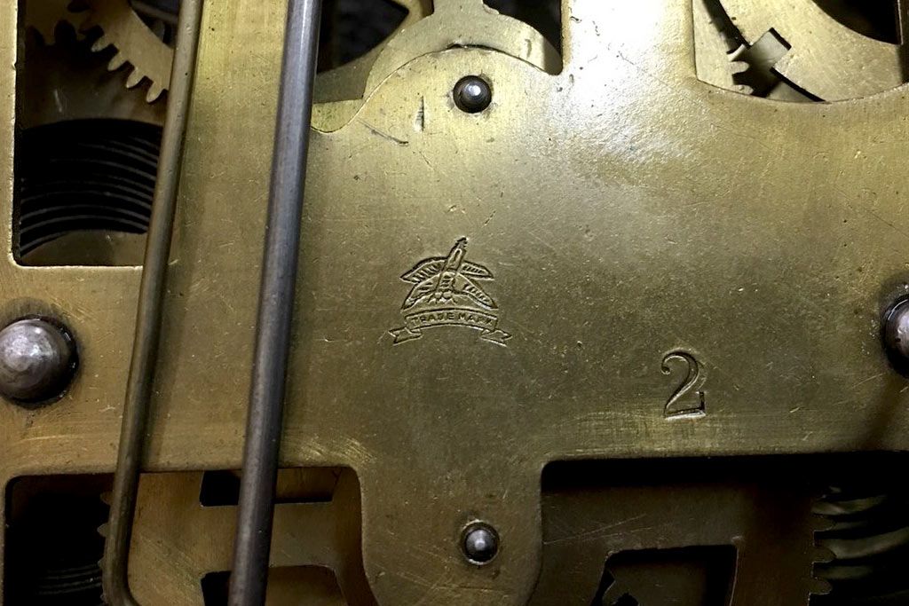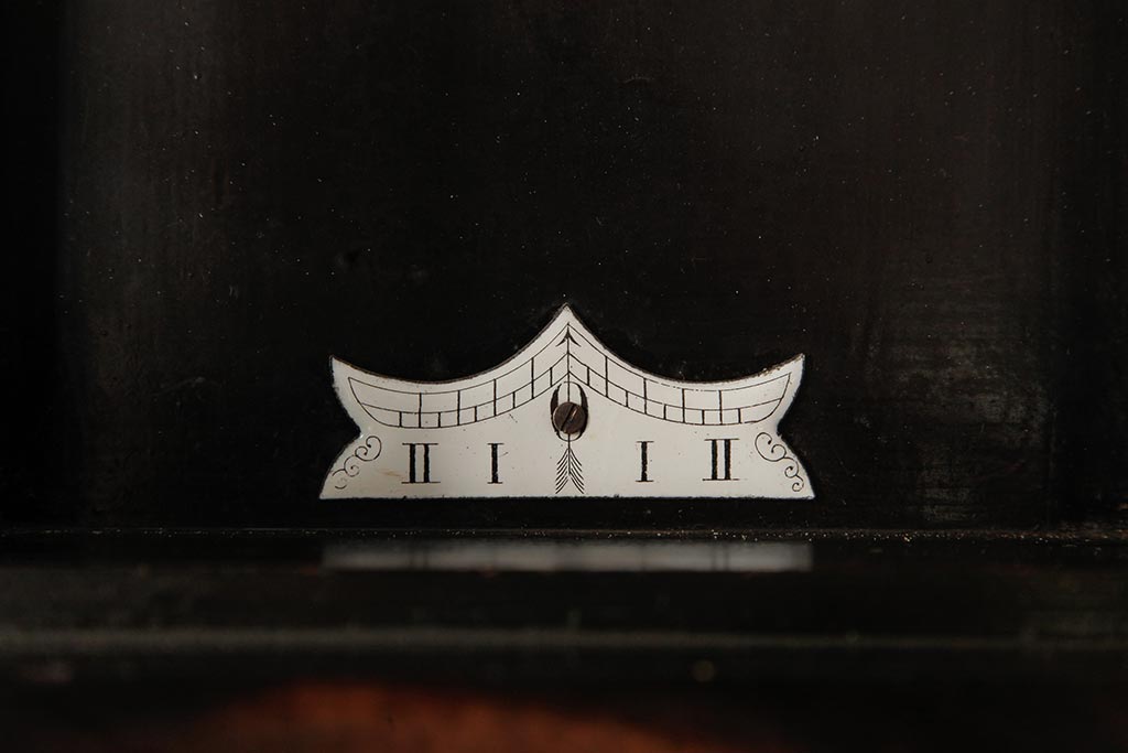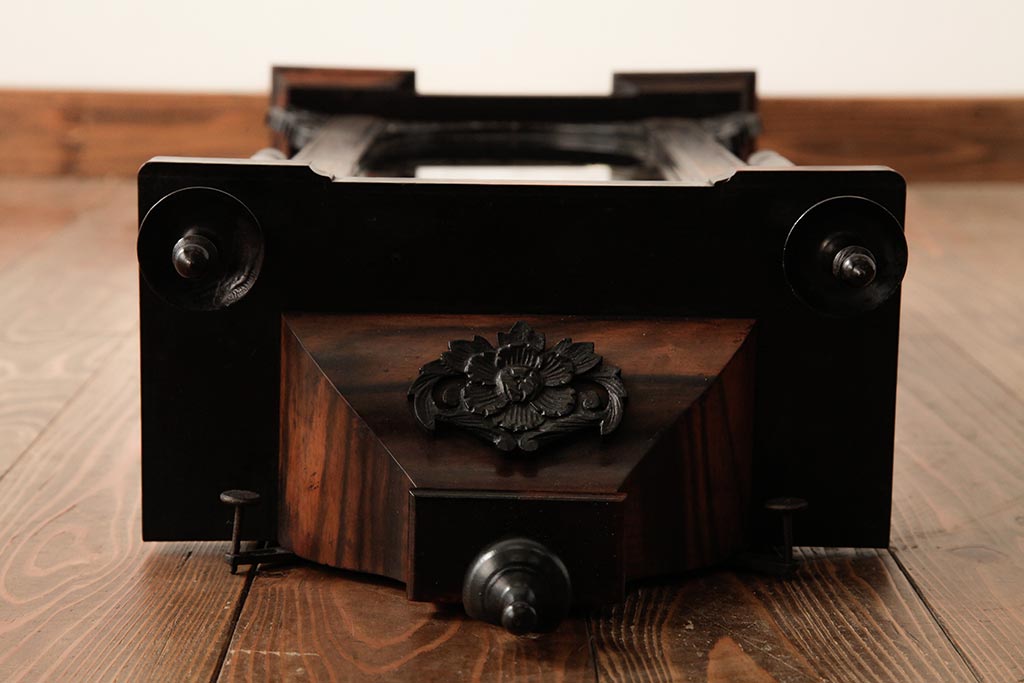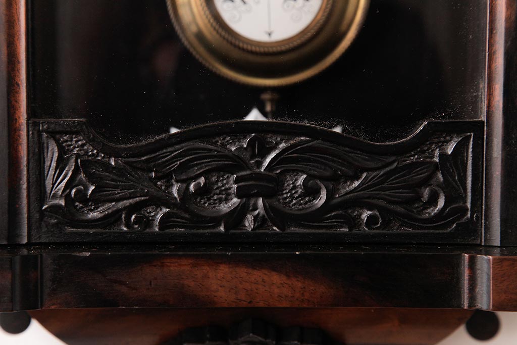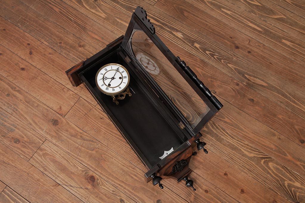 アンティーク雑貨 トレードマーク・トンボ 手巻き式 ホーロー文字盤(琺瑯) 黒柿スリゲル掛け時計(ユンハンス風、柱時計、振り子時計)(R-037699)