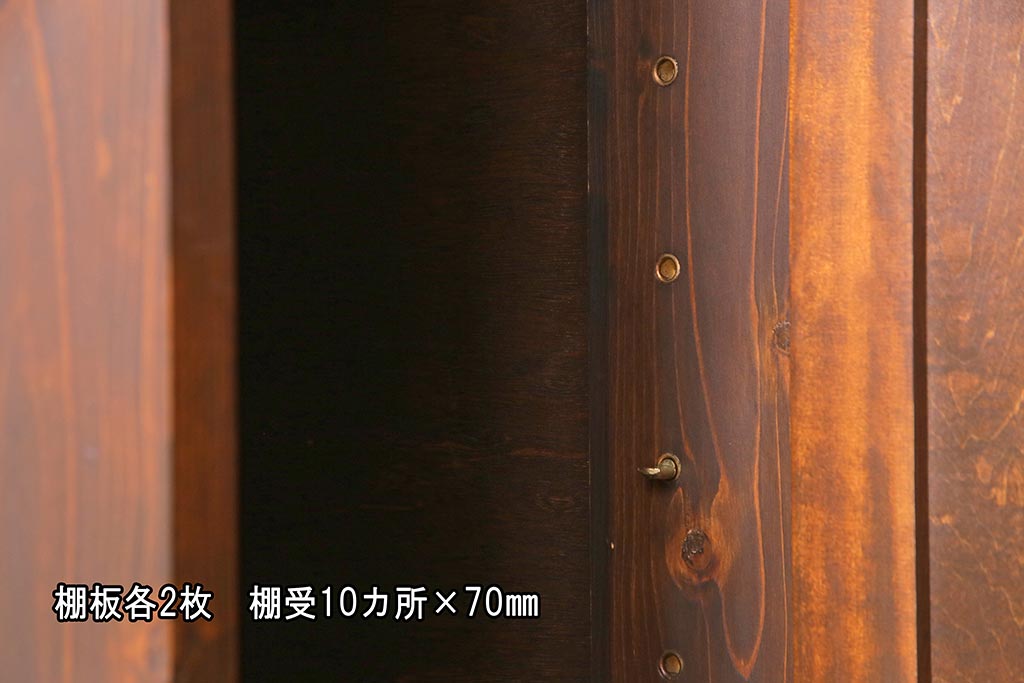 棚受けは各10ヶ所、70mmピッチで調整できます。棚幅サイズのものが1枚の作りです。