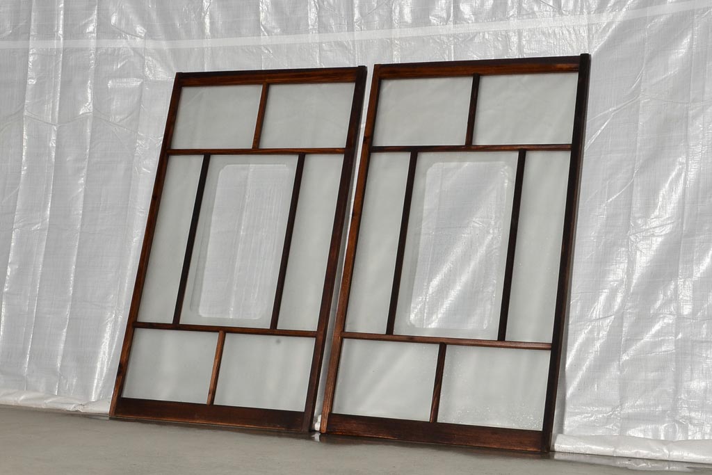 アンティーク建具 シンプルな木製フレームのガラス戸2枚セット(窓、引き戸)(R-036743)です。