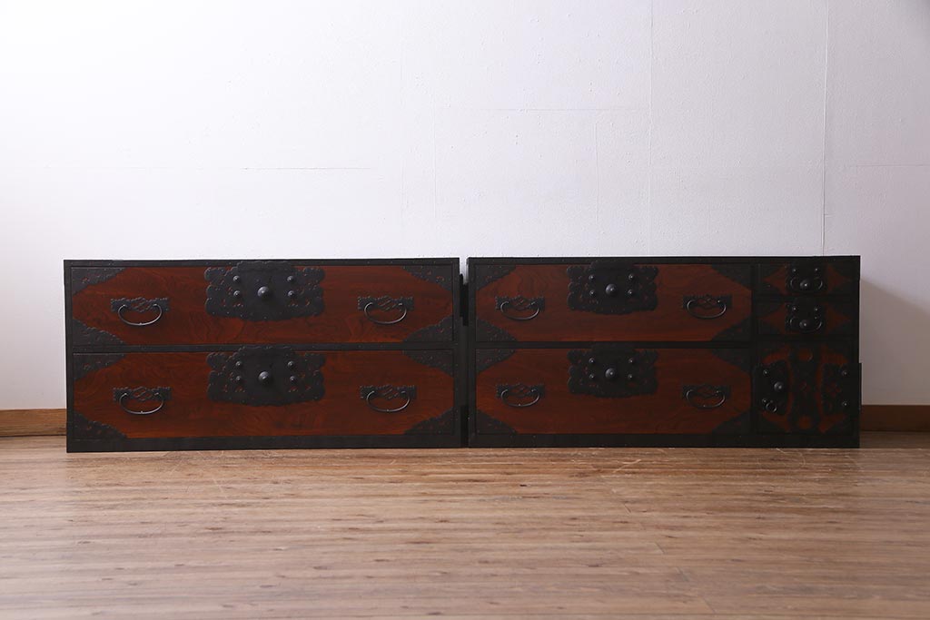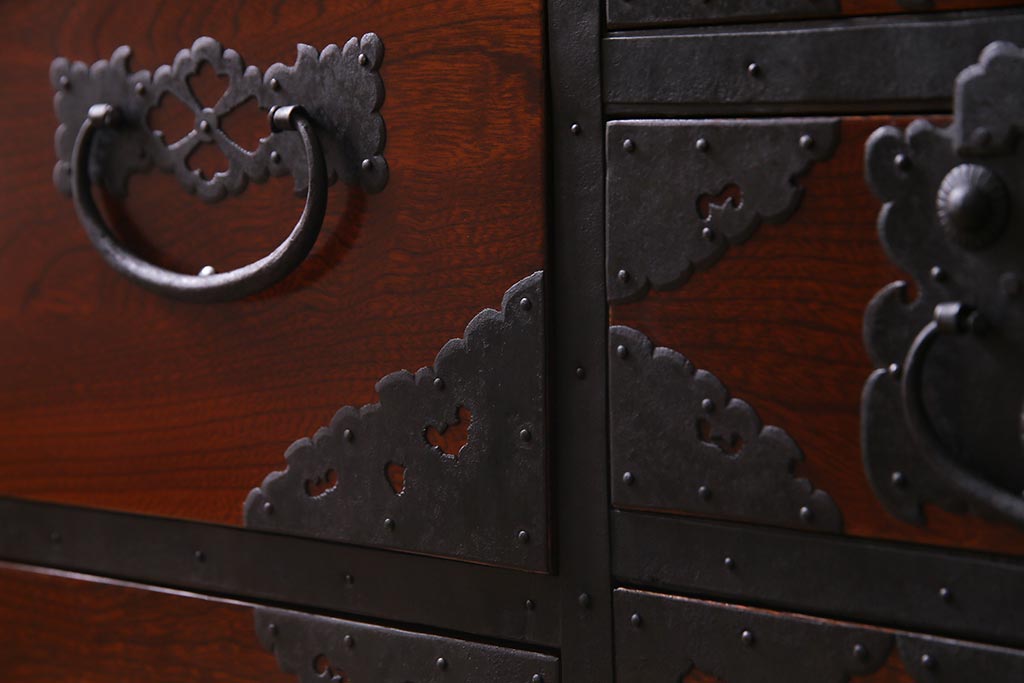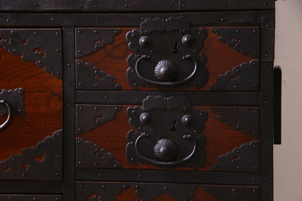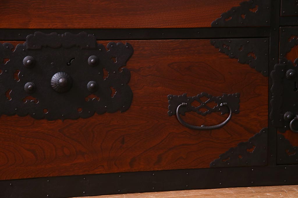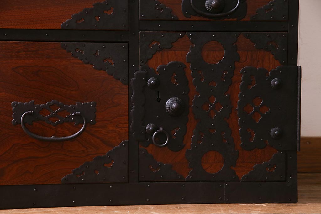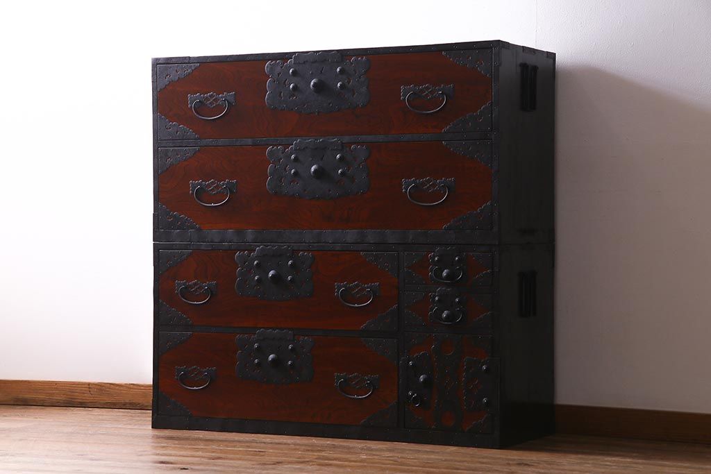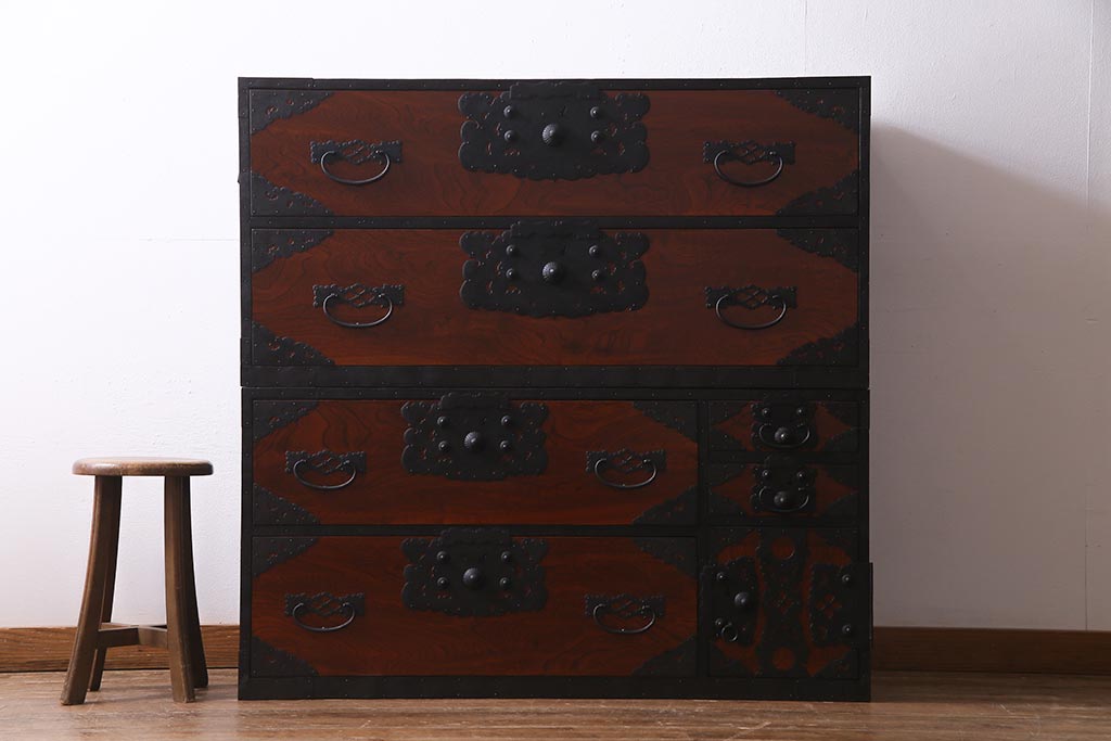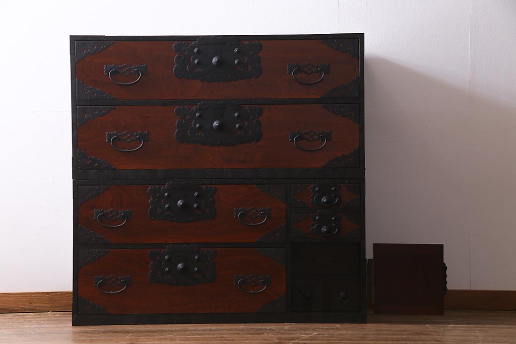 ラフジュ工房> 和箪笥 > アンティーク家具 美品! 前面ケヤキ材・中桐材 かくし付き 重ね佐渡小木箪笥(時代箪笥、衣装箪笥、和タンス、引き出し、桐箪笥、桐たんす)(R-037752)