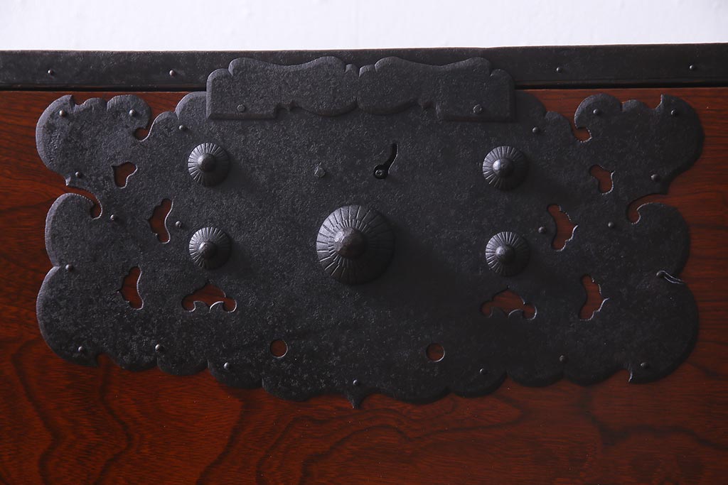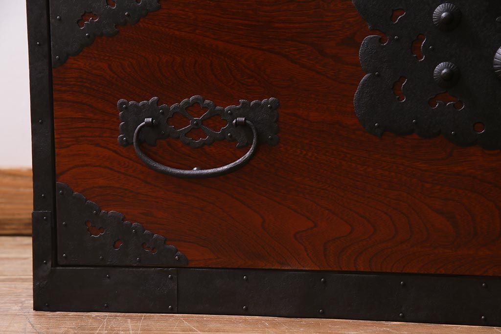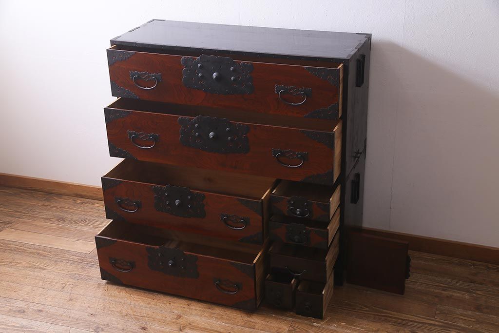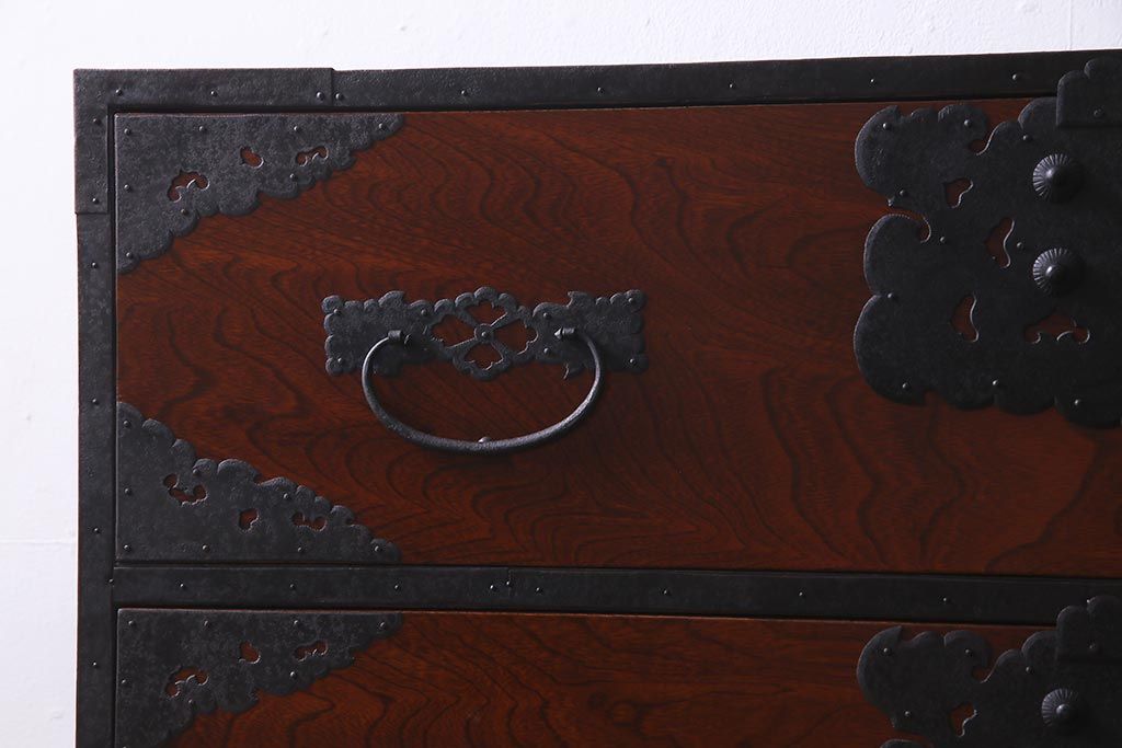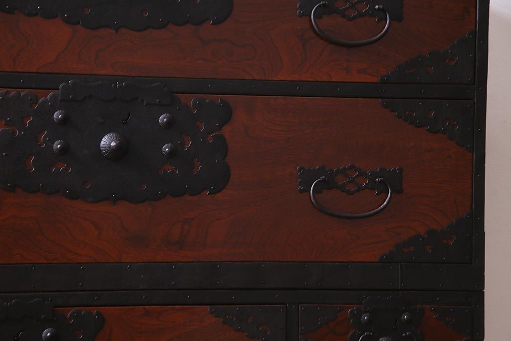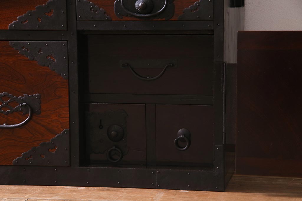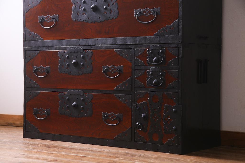 ラフジュ工房> 和箪笥> 衣装箪笥 > アンティーク家具 美品! 前面ケヤキ材・中桐材 かくし付き 重ね佐渡小木箪笥(時代箪笥、衣装箪笥、和タンス、引き出し、桐箪笥、桐たんす)(R-037752)