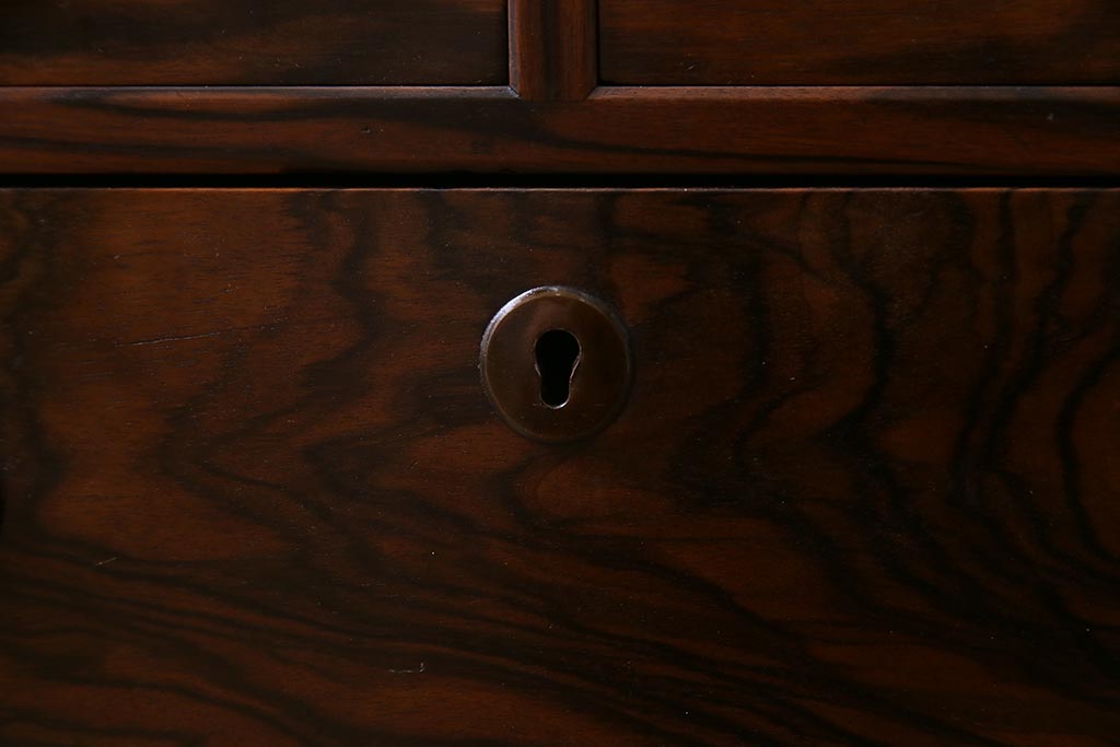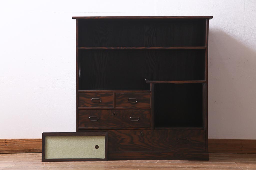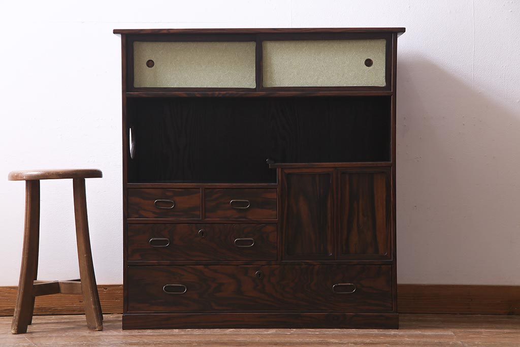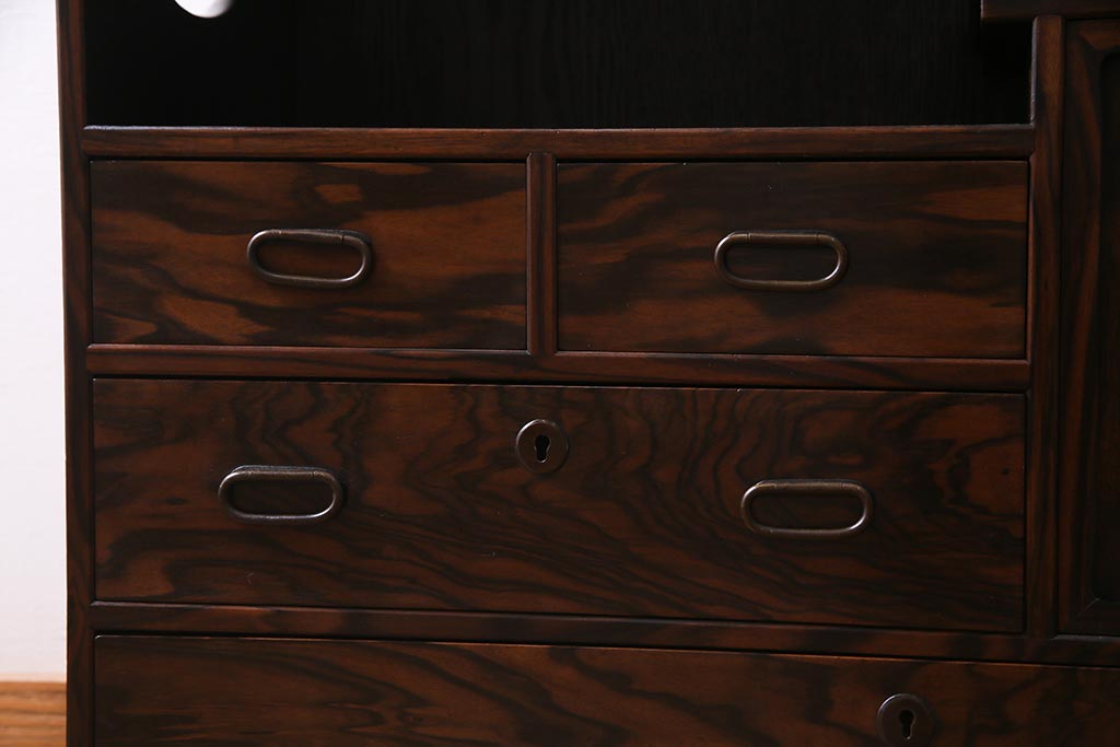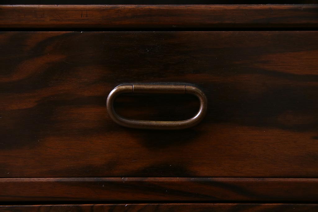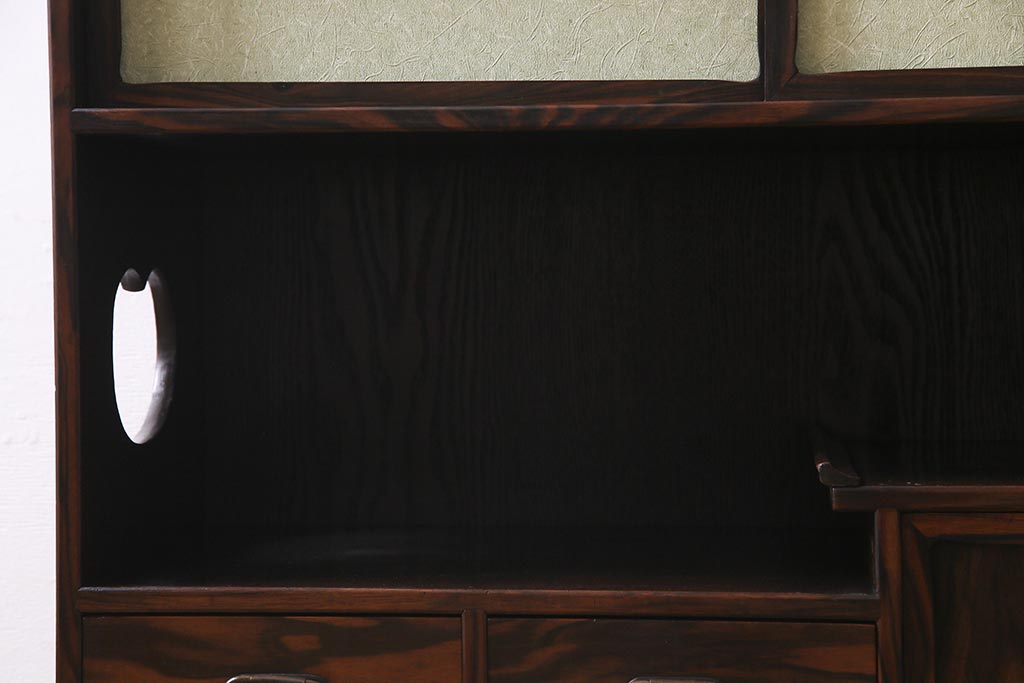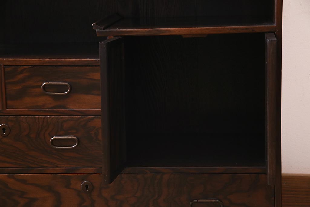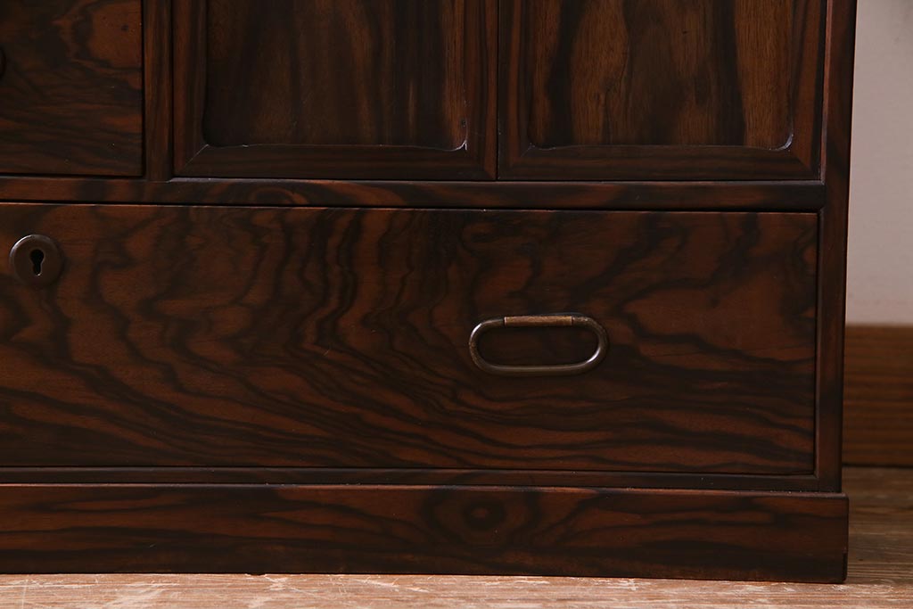 和箪笥 > アンティーク家具 大正昭和初期 縞黒檀・桐材・栓材 銅金具 上手物!上質な作りの茶箪笥(茶棚、収納棚、違い棚、桐箪笥、桐たんす)(R-037806)
