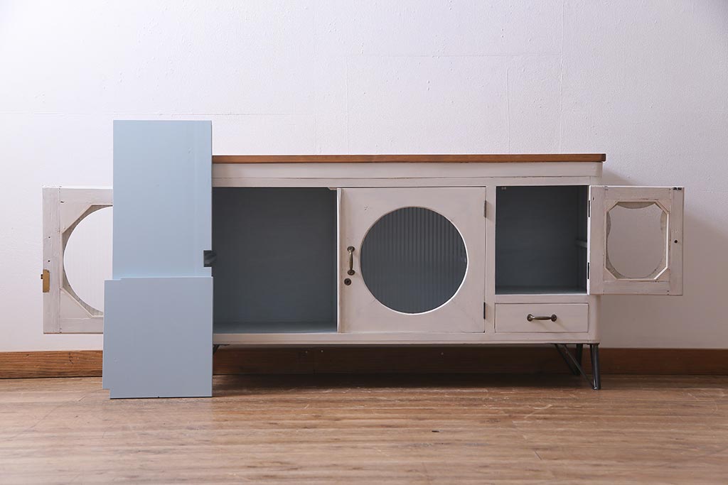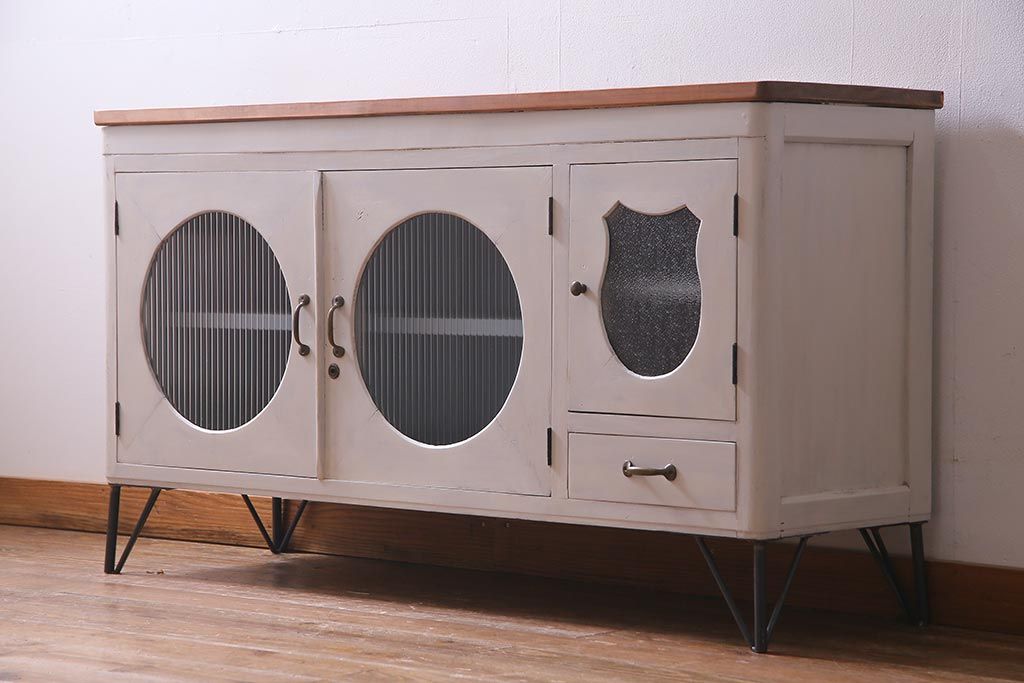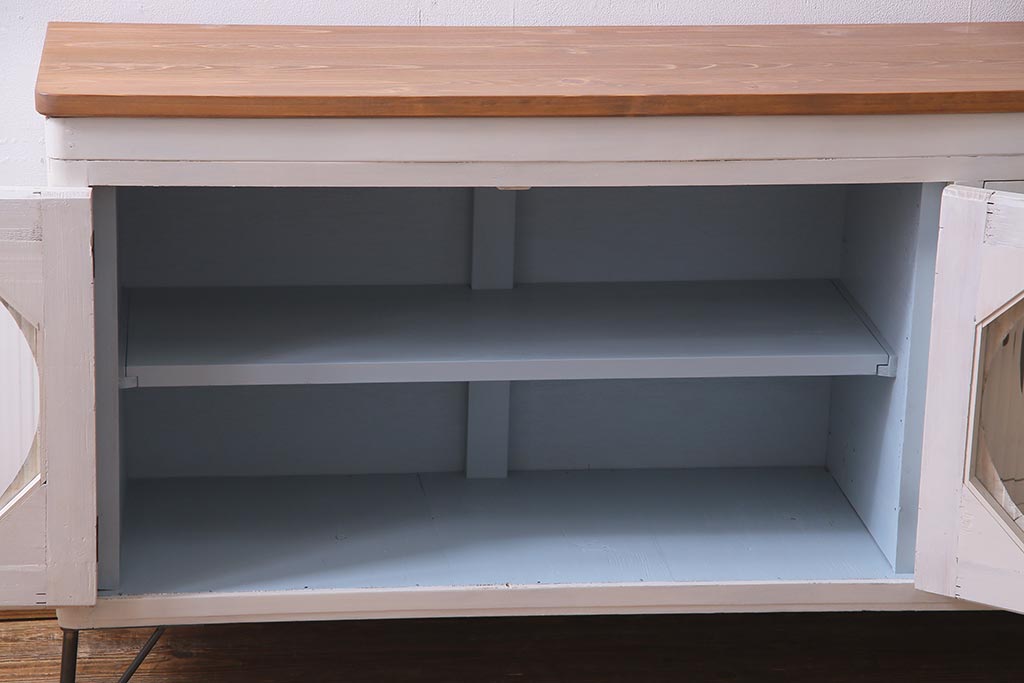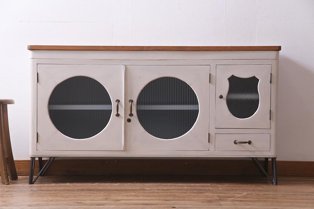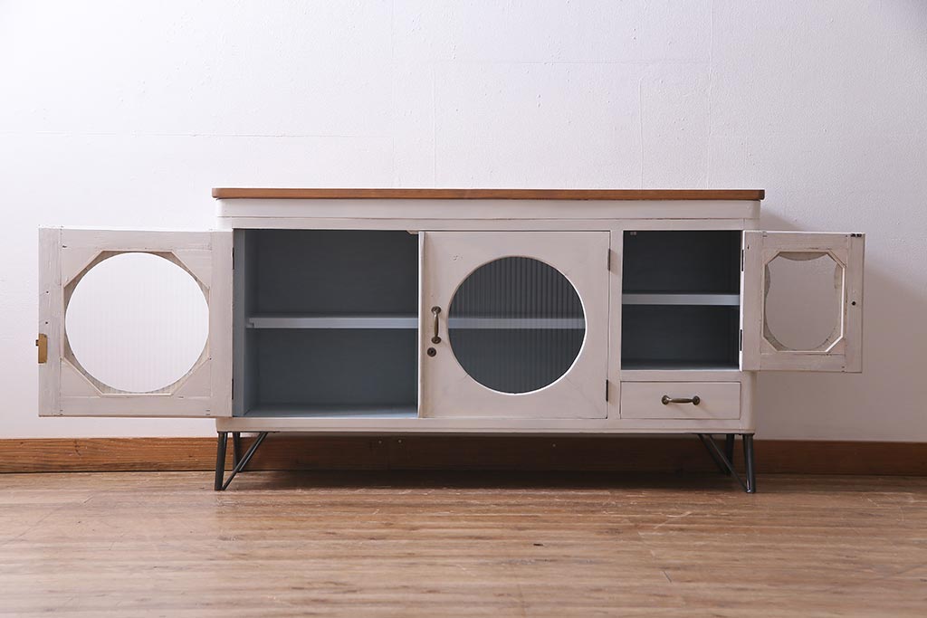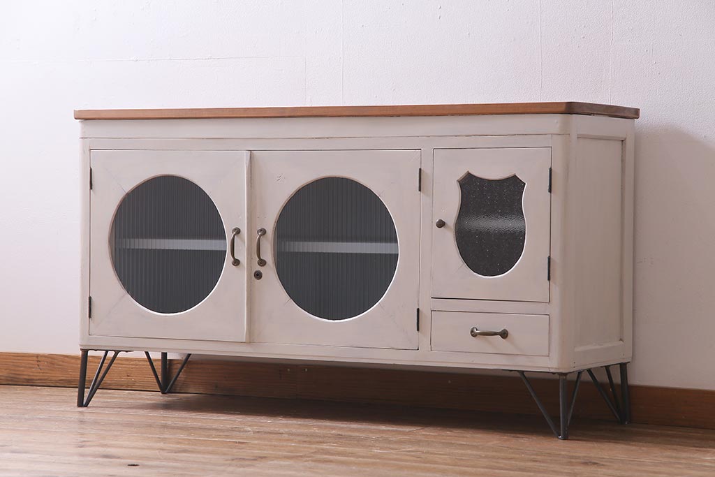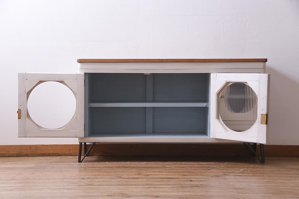アンティーク家具 リメイク ダイヤガラス・モールガラス 丸窓 アンティークペイントがおしゃれな鉄脚付きテレビ台(収納棚、キャビネット、リビングボード)(R-037869)