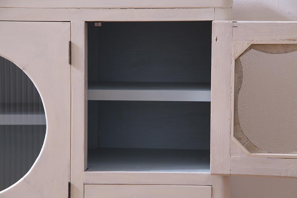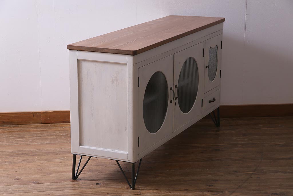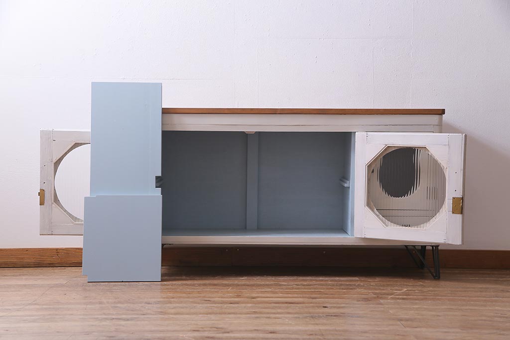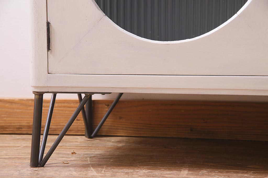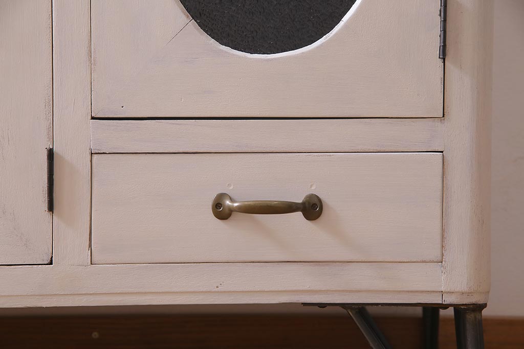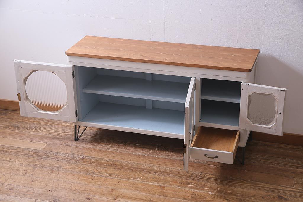 アンティーク家具 リメイク ダイヤガラス・モールガラス 丸窓 アンティークペイントがおしゃれな鉄脚付きテレビ台(収納棚、キャビネット、リビングボード)(R-037869)