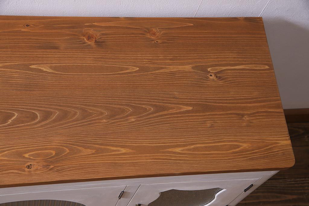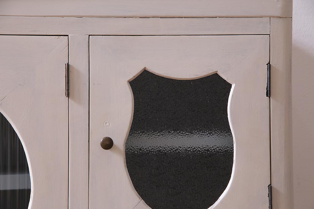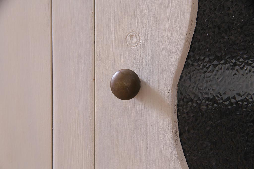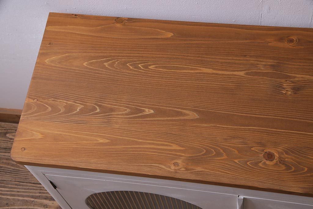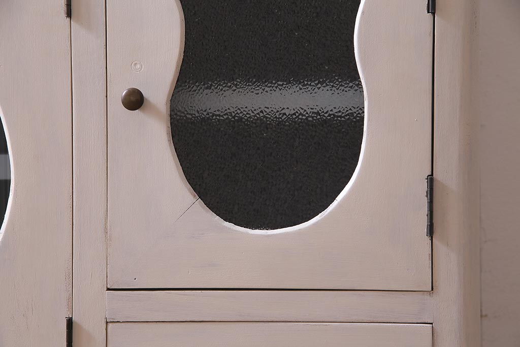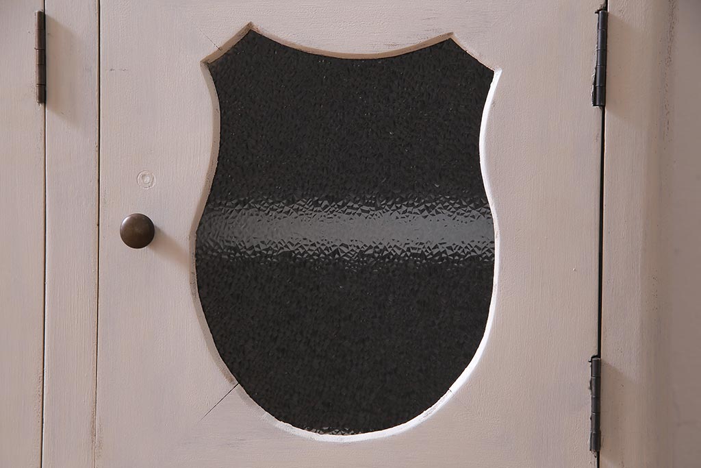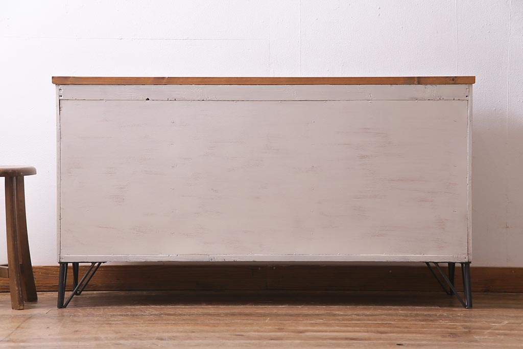 アンティーク家具 リメイク ダイヤガラス・モールガラス 丸窓 アンティークペイントがおしゃれな鉄脚付きテレビ台(収納棚、キャビネット、リビングボード)(R-037869)