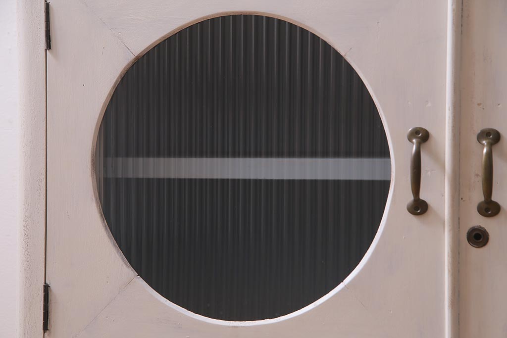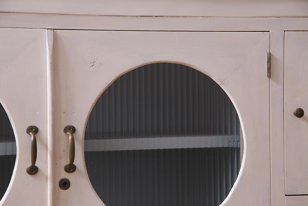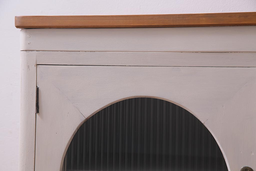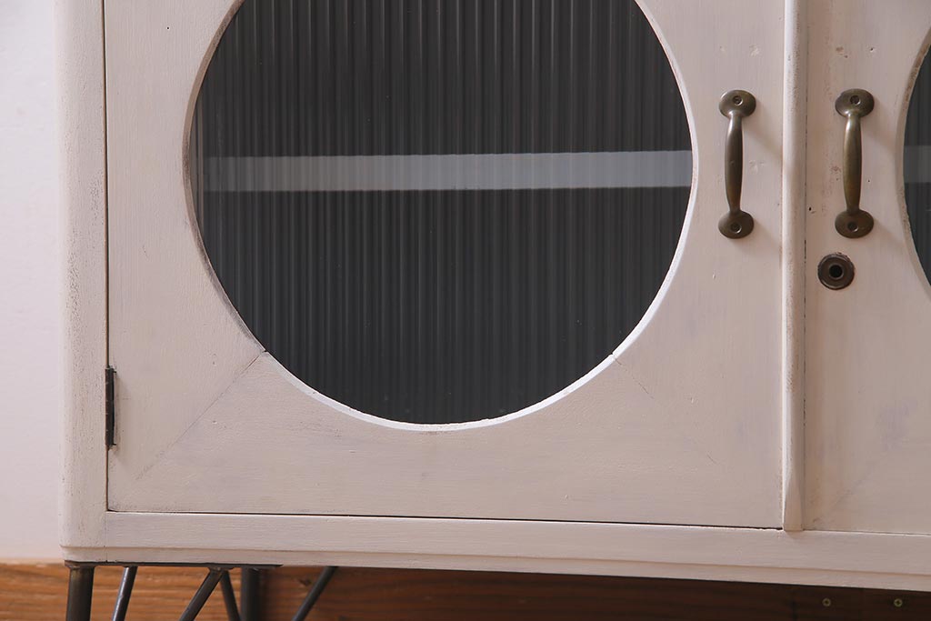 ラフジュ工房> キャビネット・戸棚> テレビ台・ローボード > アンティーク家具 リメイク ダイヤガラス・モールガラス 丸窓 アンティークペイントがおしゃれな鉄脚付きテレビ台(収納棚、キャビネット、リビングボード)(R-037869)