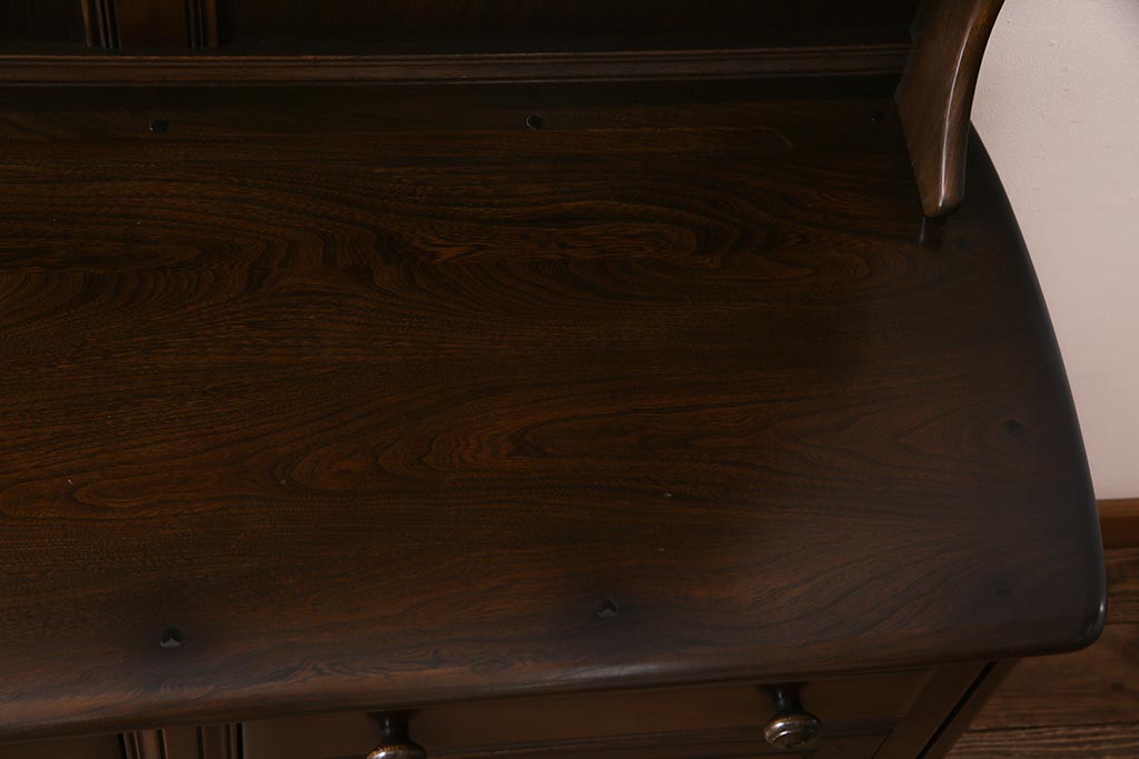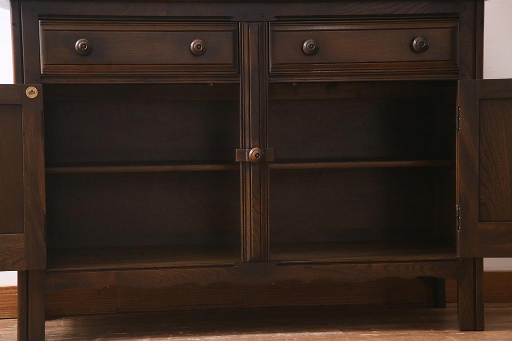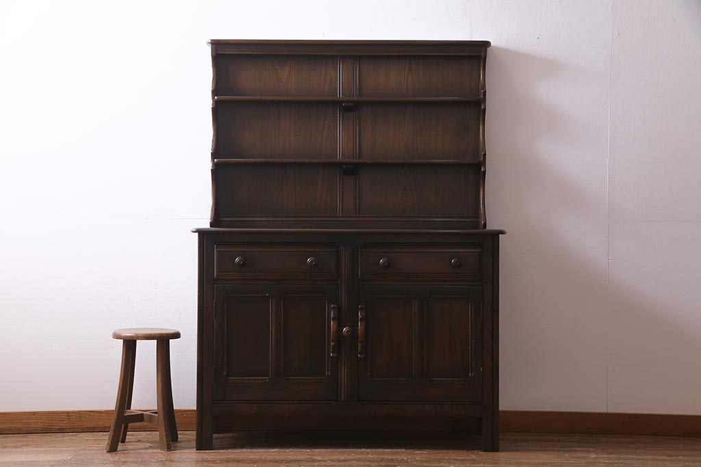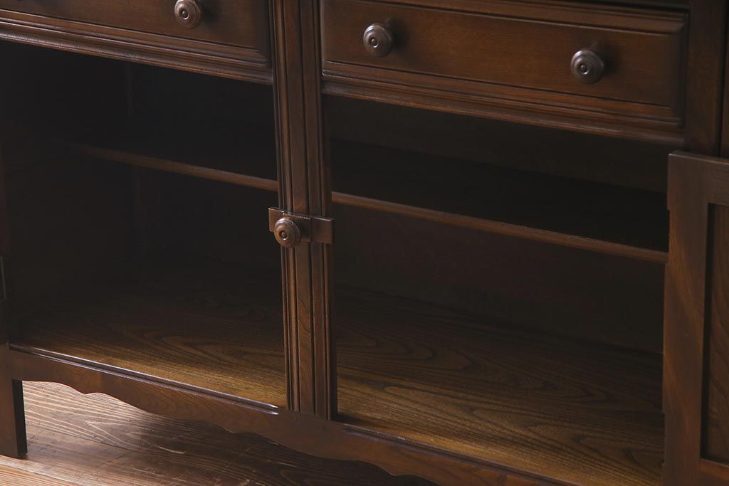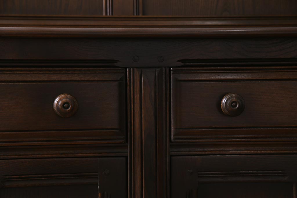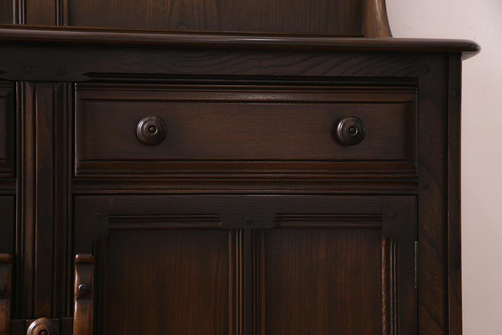 ラフジュ工房> キャビネット・戸棚> 食器棚・カップボード > ヴィンテージ家具 イギリスビンテージ ERCOL(アーコール) Old Colonial(オールドコロニアル) ニレ材 気品と風格が漂うカップボード(食器棚、飾り棚、オープンラック、収納棚)(R-037854)