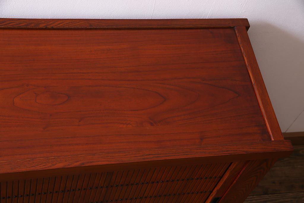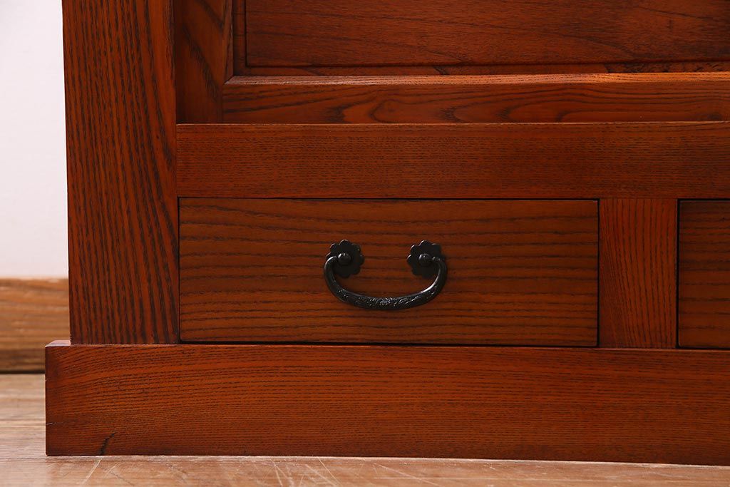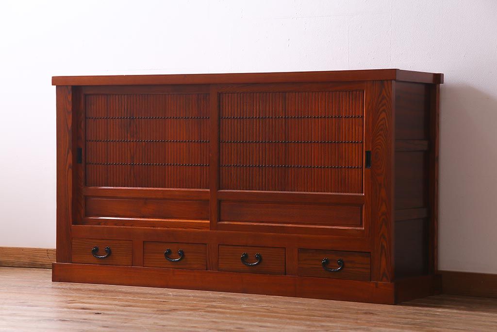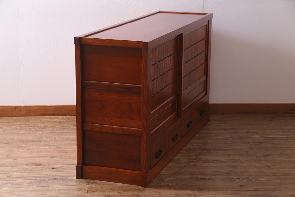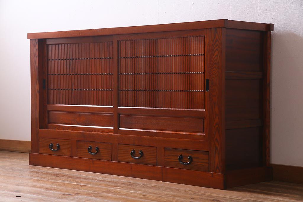 和箪笥 > 新古品 民芸家具 ニレ無垢材 5尺 重厚感と上品さを醸し出す水屋箪笥(収納棚、キャビネット)(R-037855)