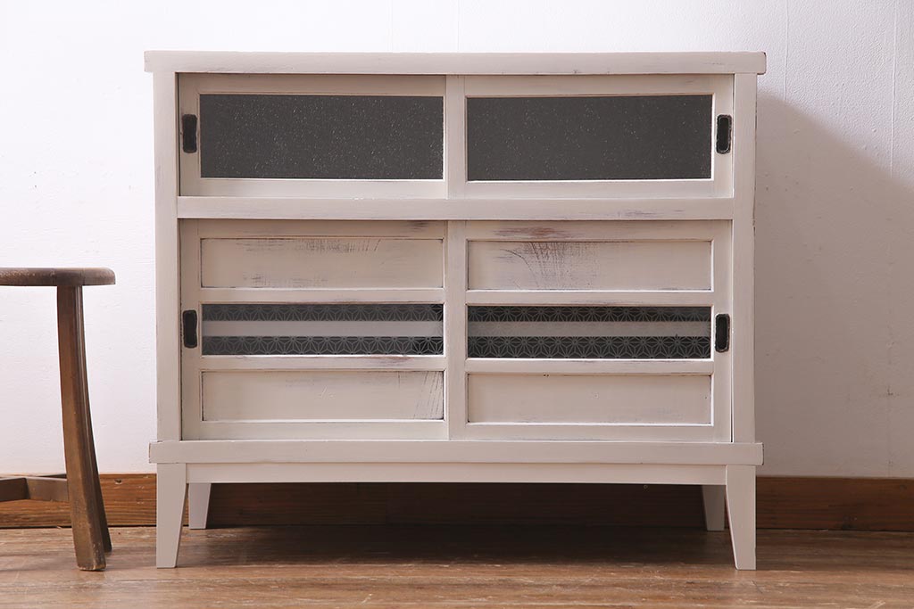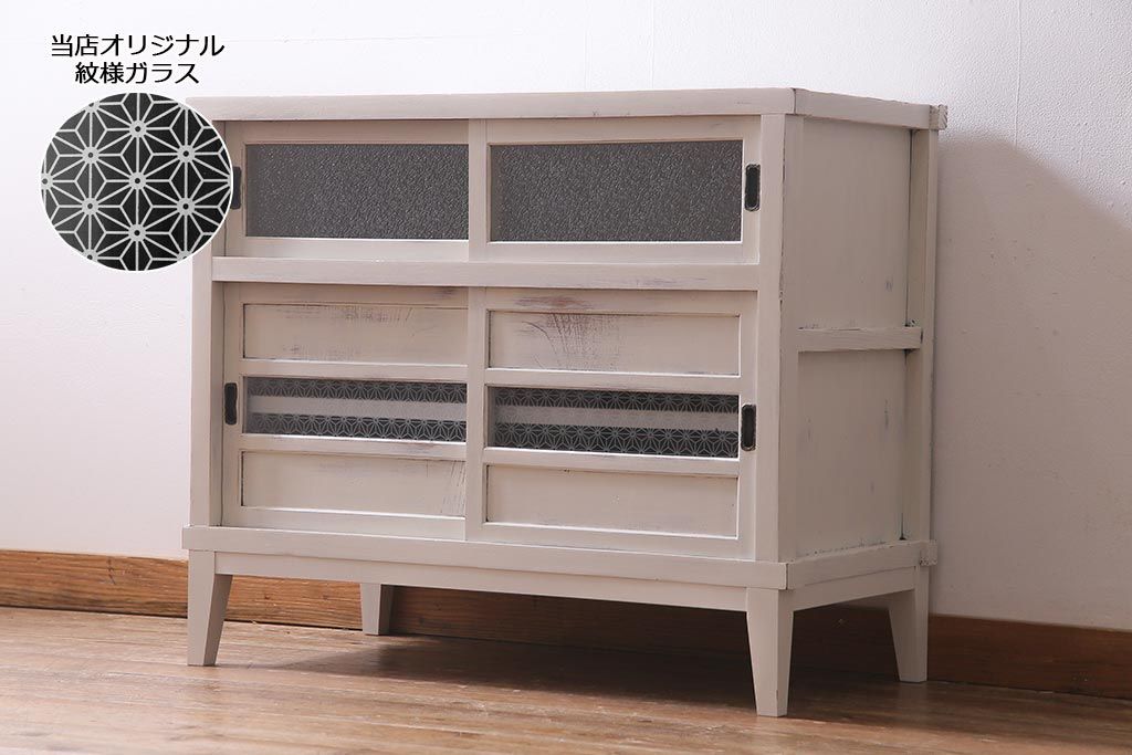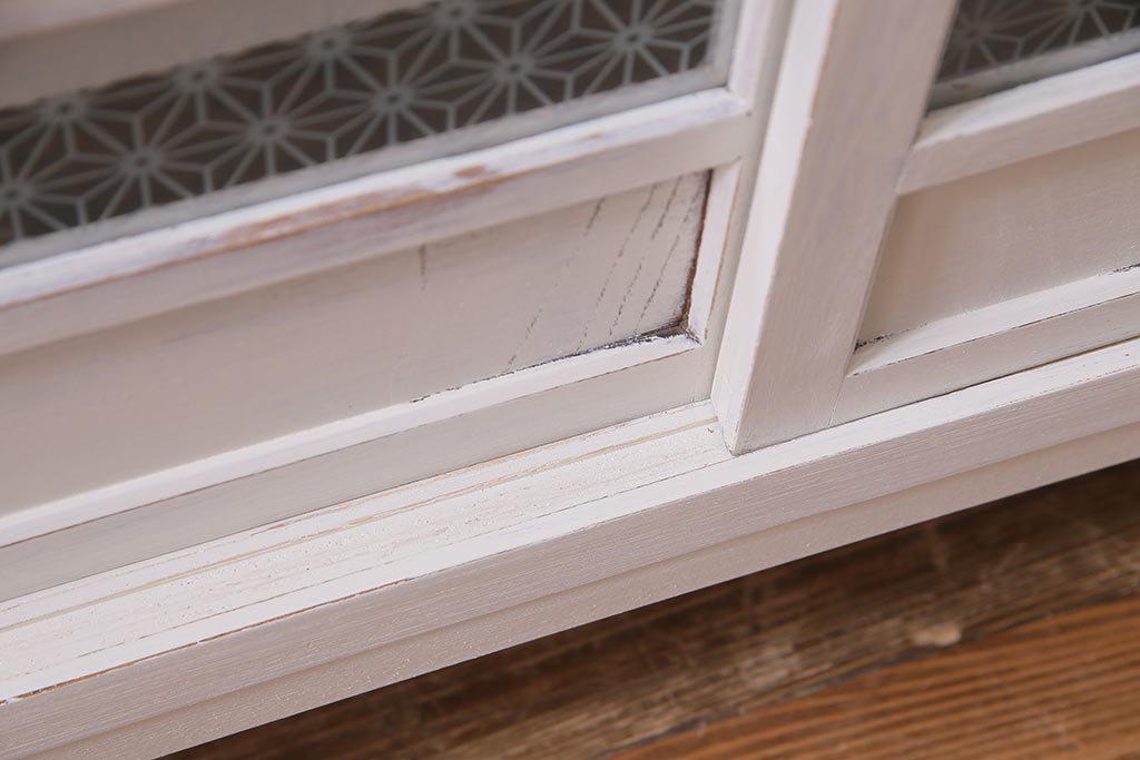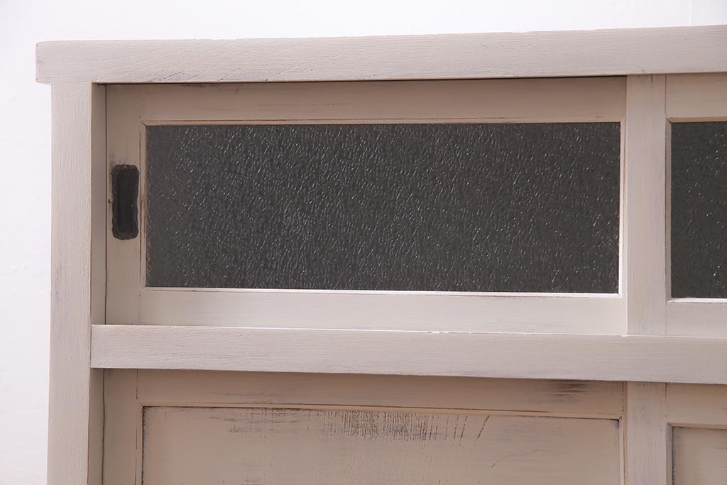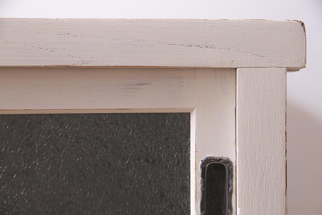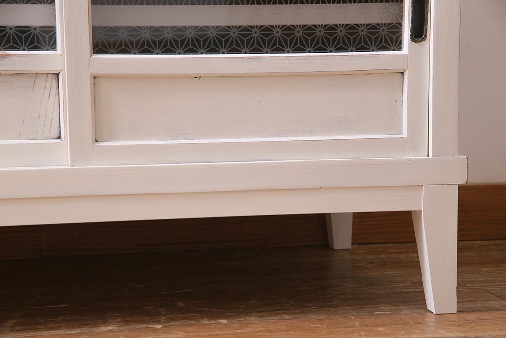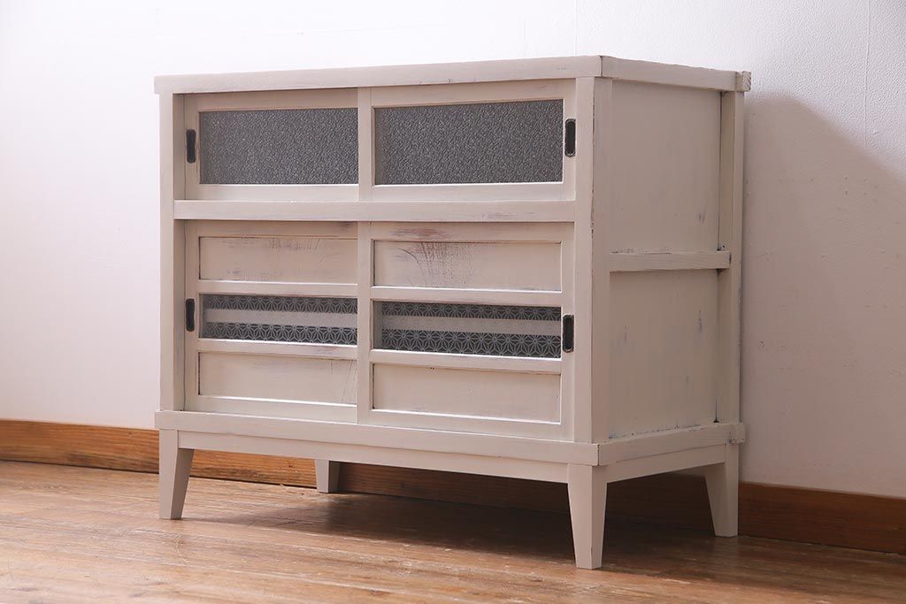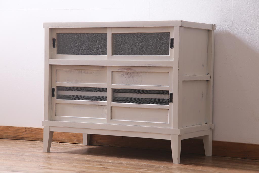 アンティーク家具 昭和初期 脚付きリメイク ダイヤガラス・当店オリジナルガラス シャビーな雰囲気のペイントがお洒落なキャビネット(収納棚、戸棚、リビングボード)(R-037917)