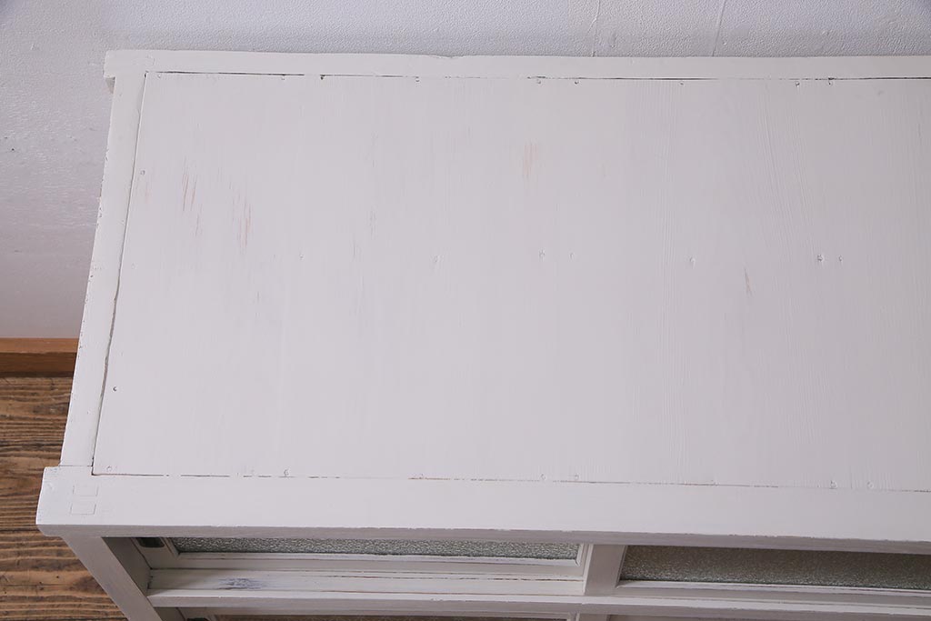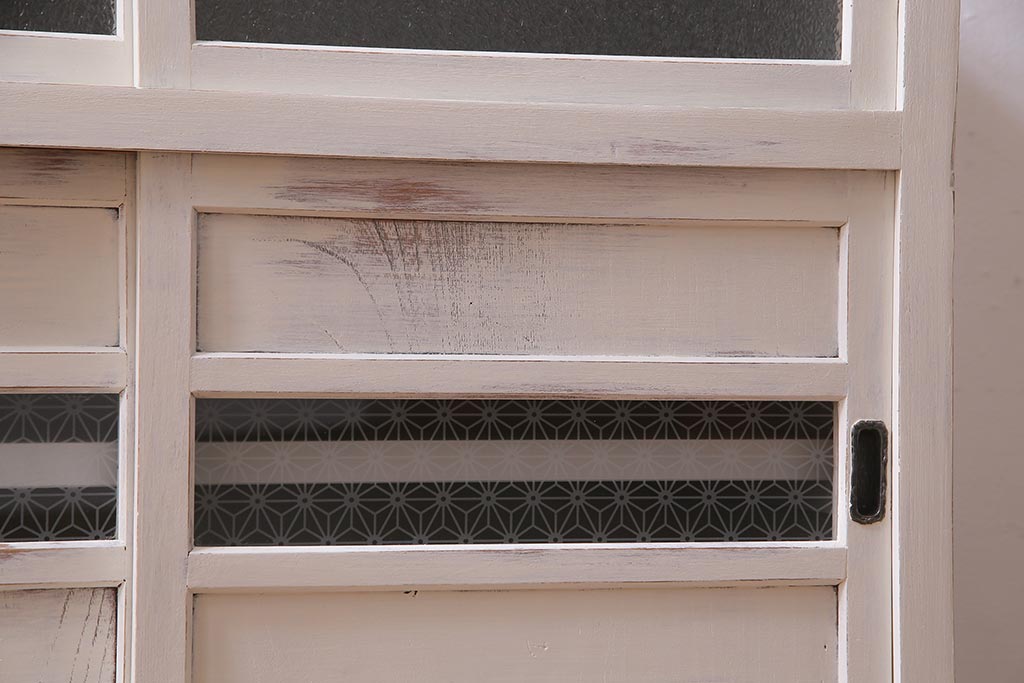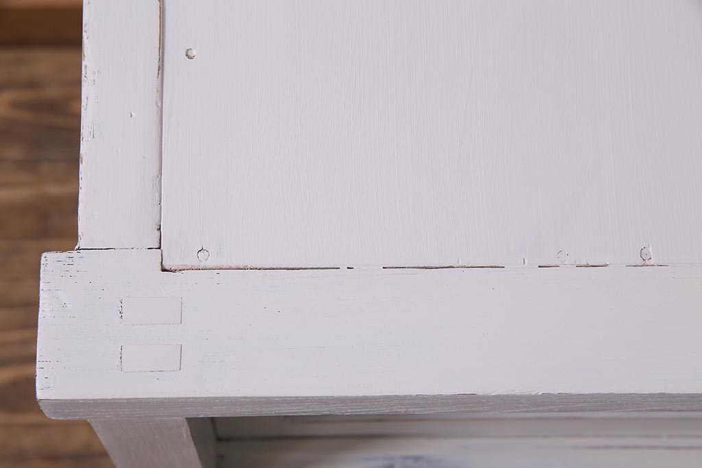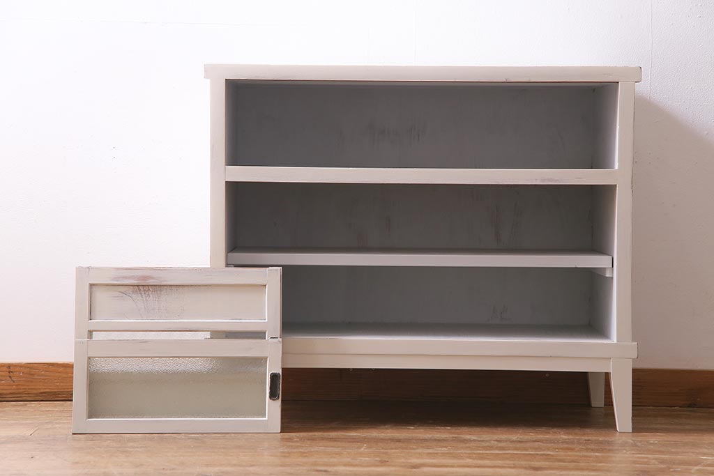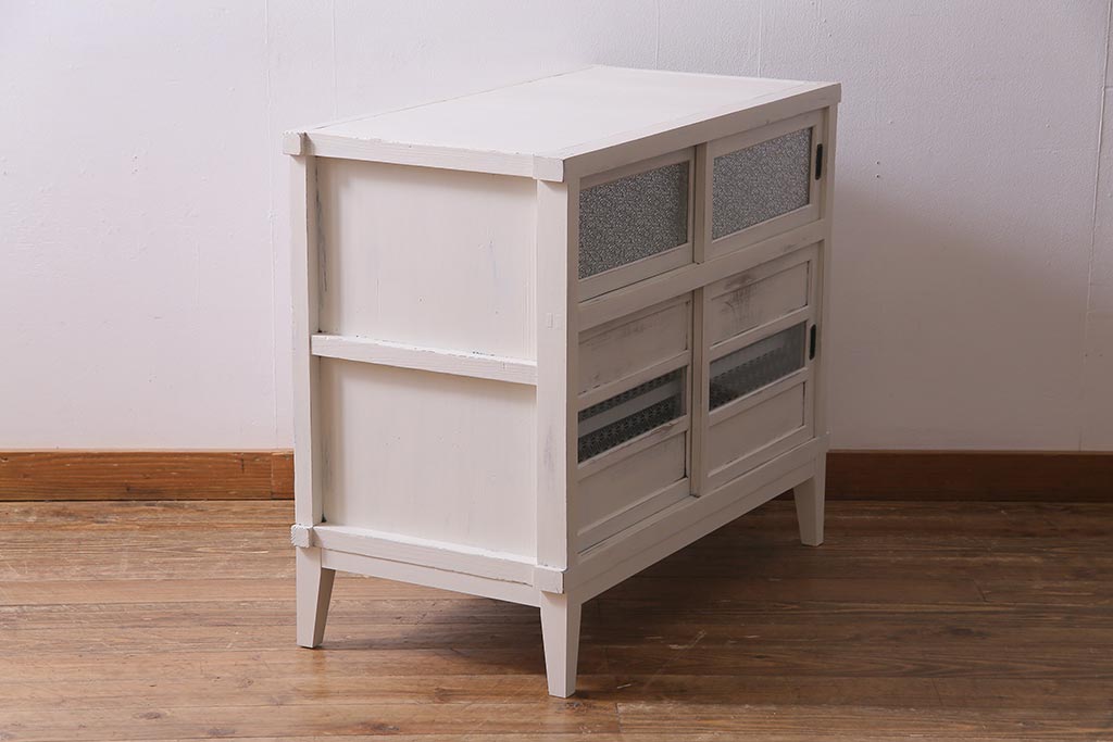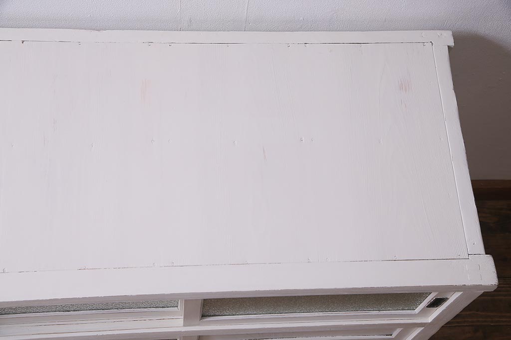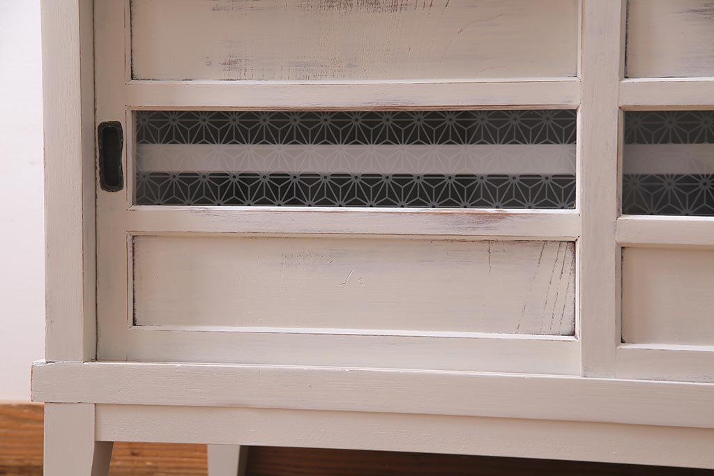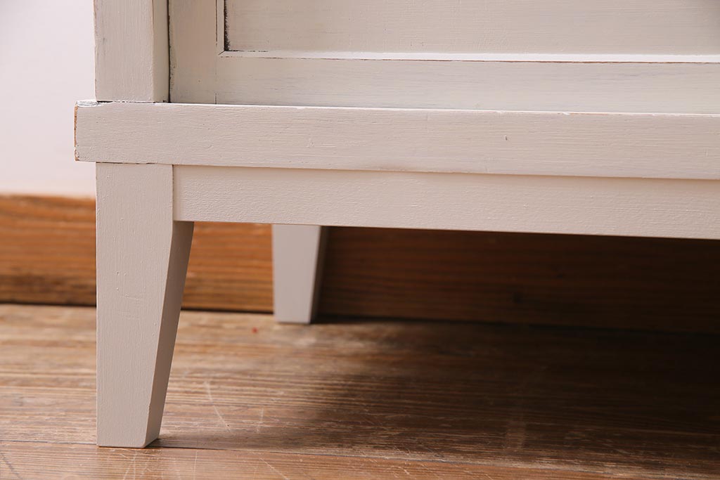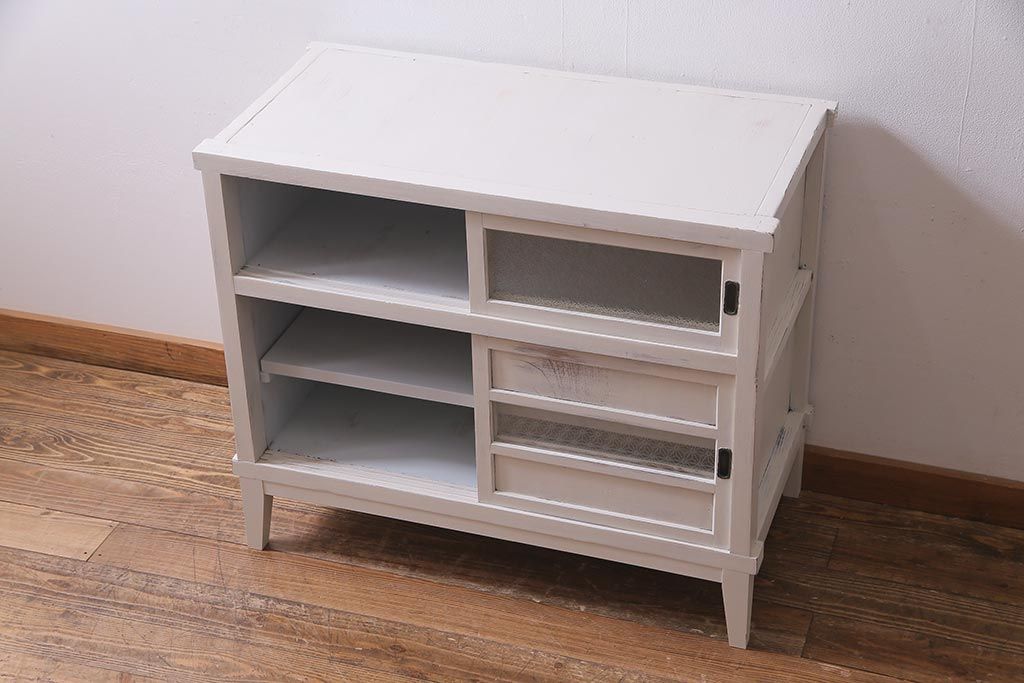 アンティーク家具 昭和初期 脚付きリメイク ダイヤガラス・当店オリジナルガラス シャビーな雰囲気のペイントがお洒落なキャビネット(収納棚、戸棚、リビングボード)(R-037917)