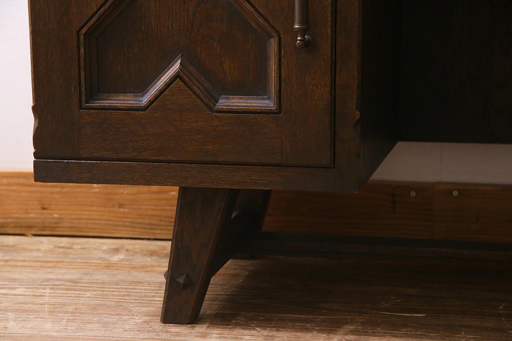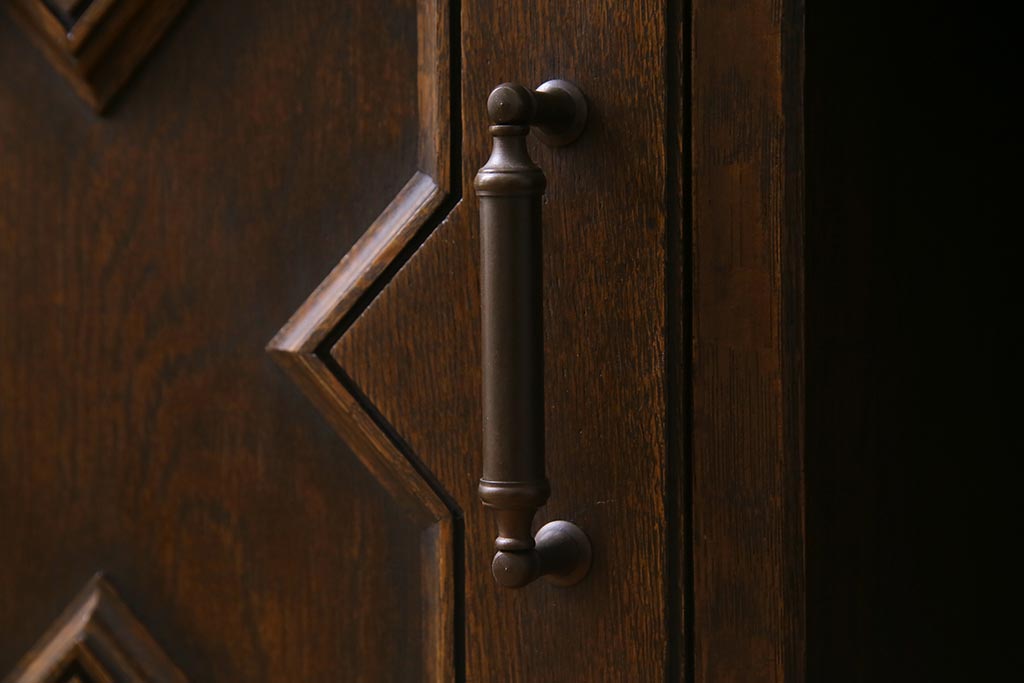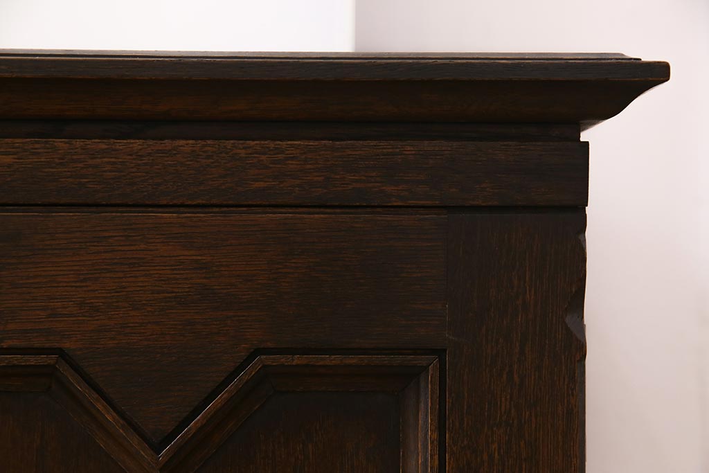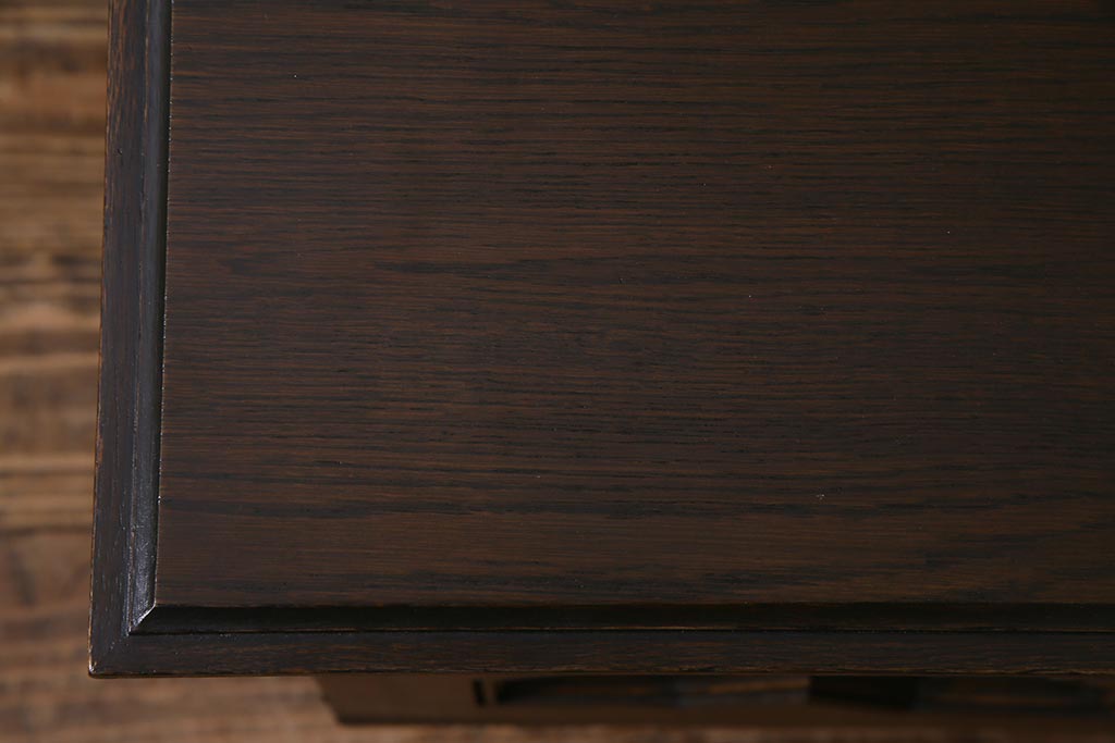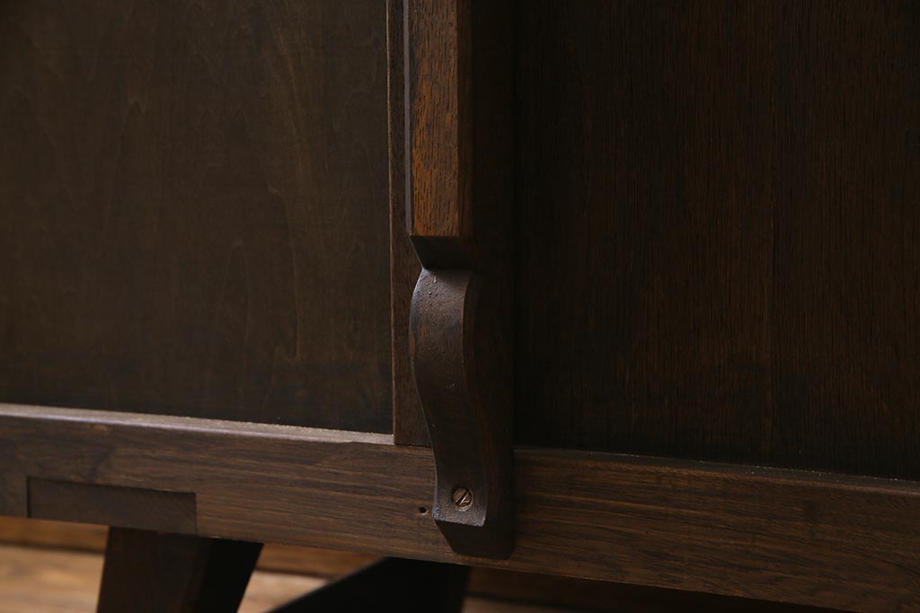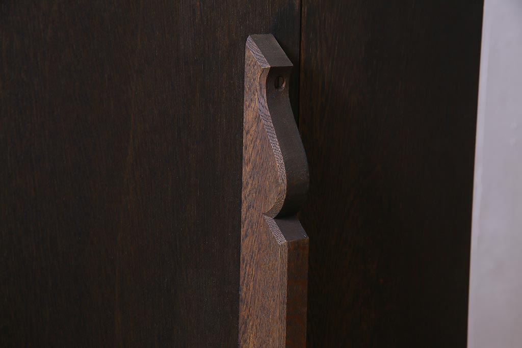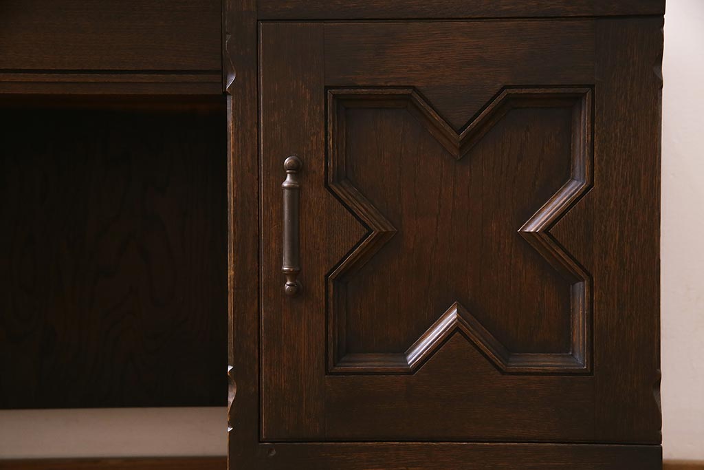 - 深い茶色が特徴的なこちらのお品ですが、家具表面には「墨ぼかし」という独自の技術を施し、濃淡のある独特の色合を作りだしております。木の温もりを感じる、シックで落ち着いた雰囲気を醸し出していますよね。また、両サイドにあるクロスの彫刻は、戦前から戦後にかけて永田良介商店のデザイナーたちが確立したもので、中世ヨーロッパのゴシック様式の流れを組むチューダースタイルを取り入れてデザインされております。西洋の伝統的なスタイルを取り入れながらも、和の雰囲気に馴染むデザインが魅力的ですよね。和・洋どちらのお部屋にも合わせていただける和洋折衷な一品となっております。