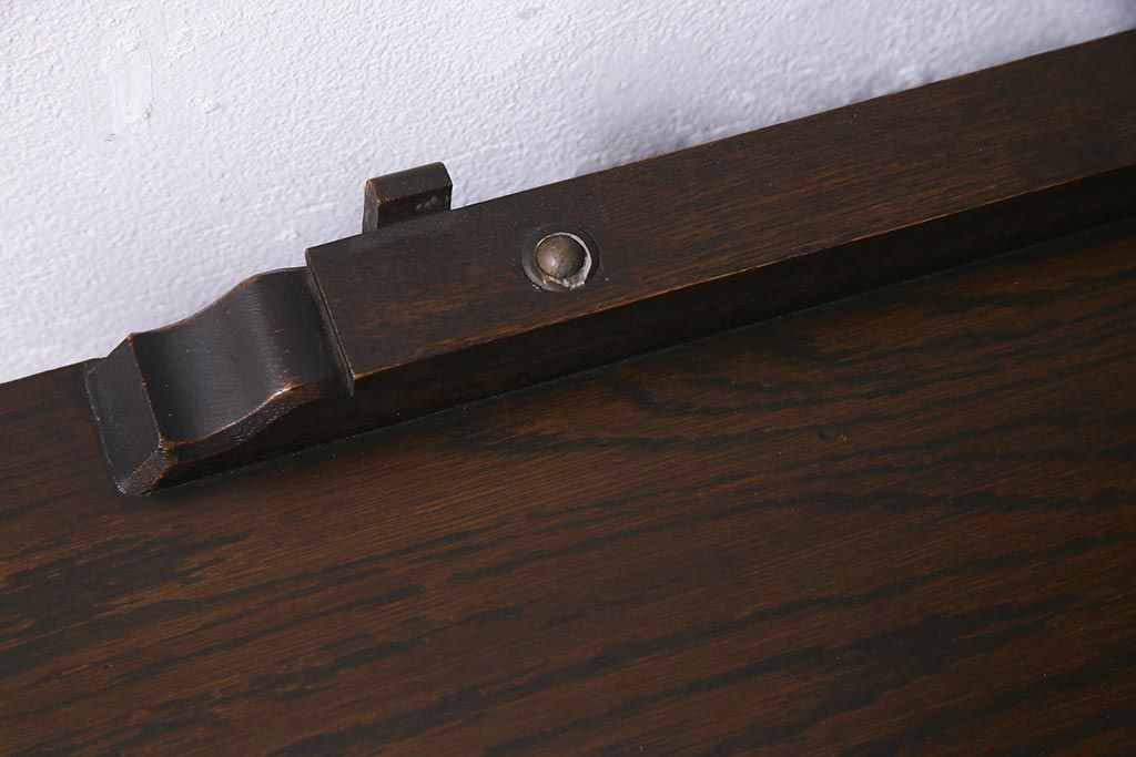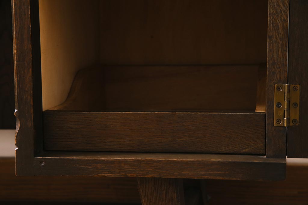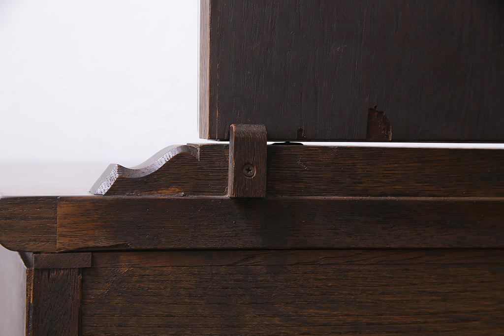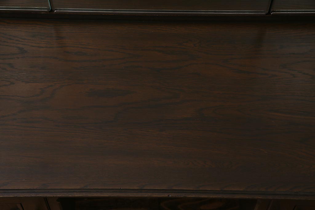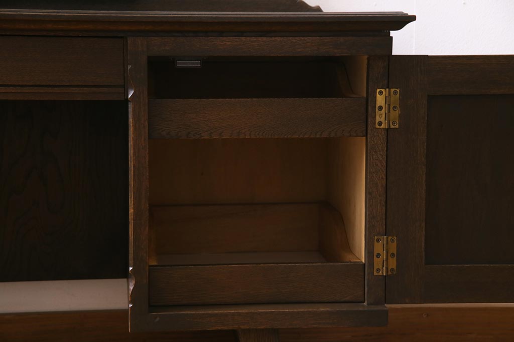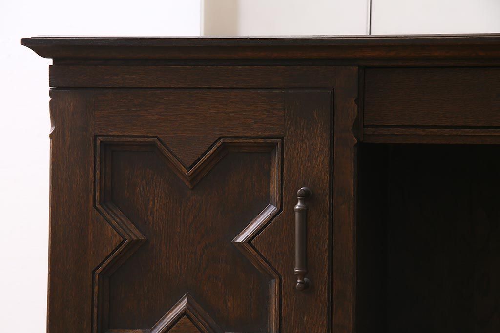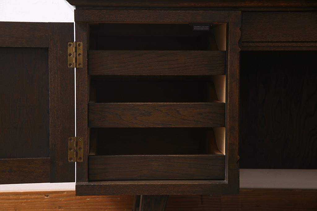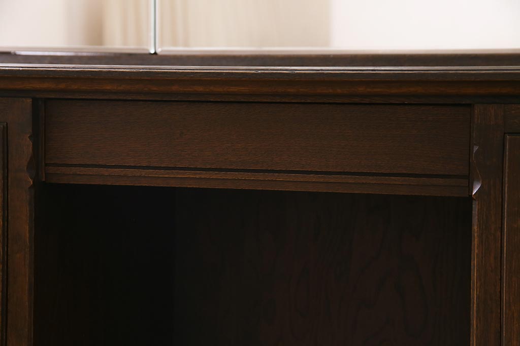 - 深い茶色が特徴的なこちらのお品ですが、家具表面には「墨ぼかし」という独自の技術を施し、濃淡のある独特の色合を作りだしております。木の温もりを感じる、シックで落ち着いた雰囲気を醸し出していますよね。また、両サイドにあるクロスの彫刻は、戦前から戦後にかけて永田良介商店のデザイナーたちが確立したもので、中世ヨーロッパのゴシック様式の流れを組むチューダースタイルを取り入れてデザインされております。西洋の伝統的なスタイルを取り入れながらも、和の雰囲気に馴染むデザインが魅力的ですよね。和・洋どちらのお部屋にも合わせていただける和洋折衷な一品となっております。
