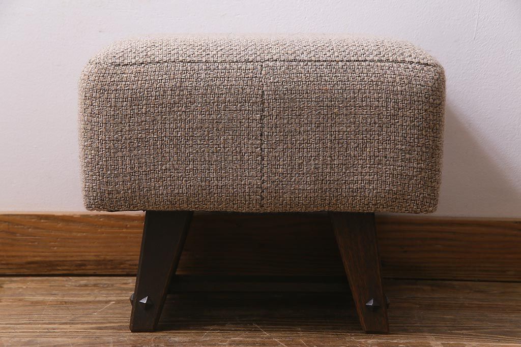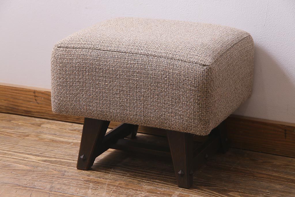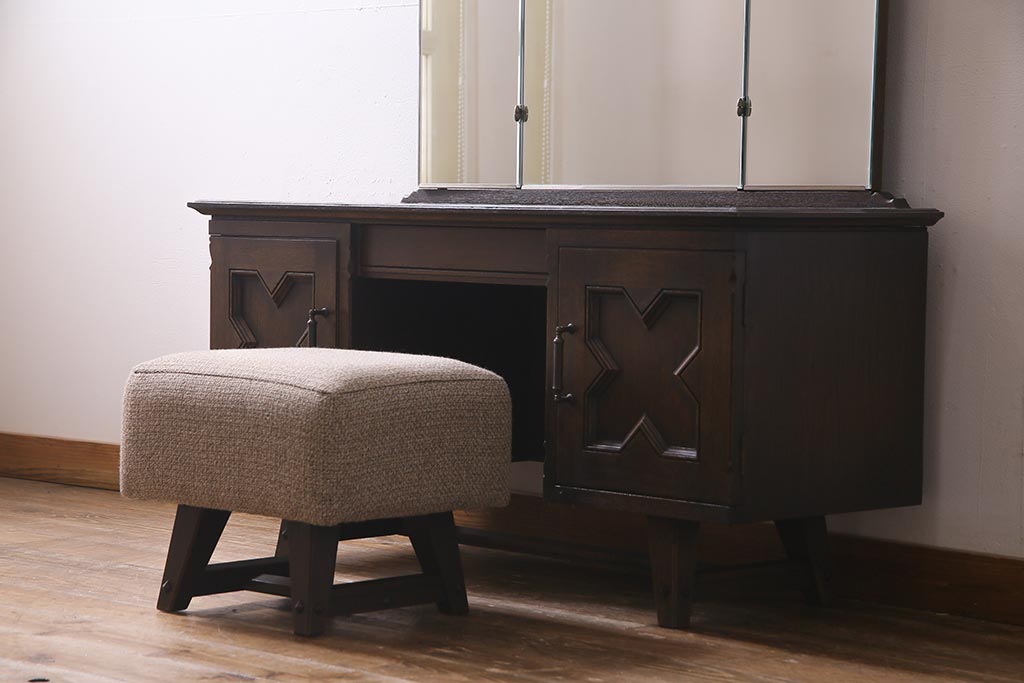 コロンとしたフォルムが可愛いスツールもついております。座面生地とクッション(座面内スポンジ)は当店にて張り替えておりますので、これから先も長くお使いいただけます。また、座面生地は優しいベージュ色なので、ドレッサーの濃い茶の色合いとあいまって、あたたかみのある雰囲気の空間を演出してくれますよ。