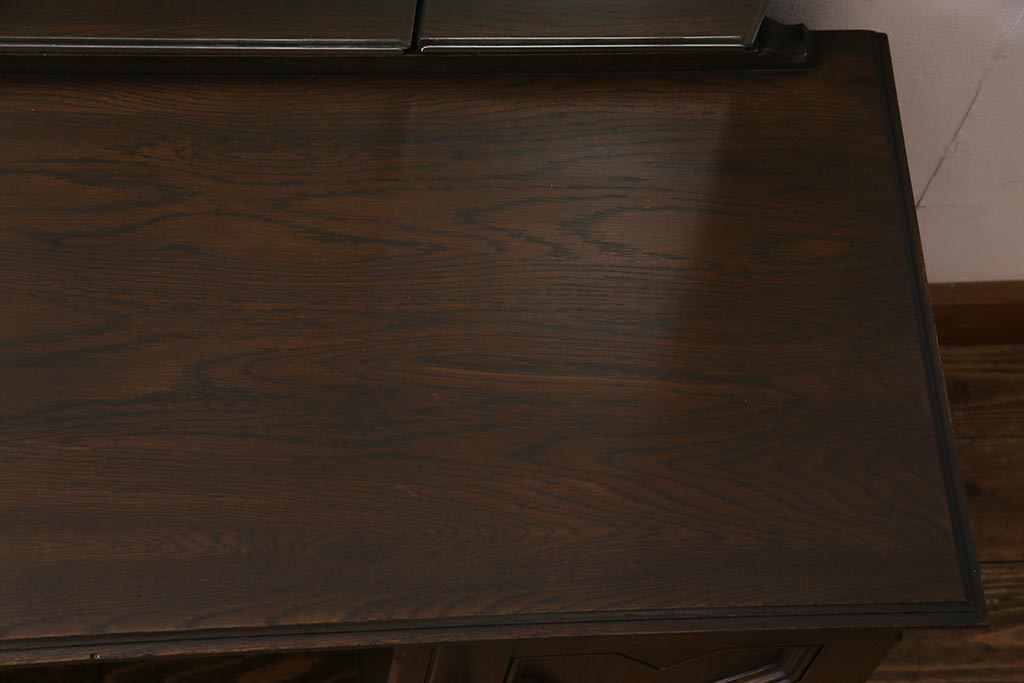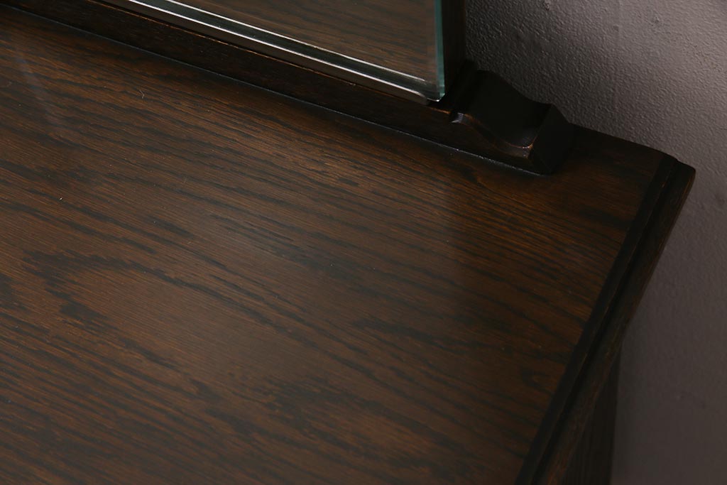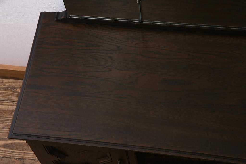 まるでイギリスアンティーク家具のような上品な佇まいが魅力の老舗家具ブランド「永田良介商店」のヴィンテージドレッサーです。濃淡のある独特の色合いや、クロスのようなダイナミックな装飾が、クラシカルな雰囲気を高めていますね。見た目に美しいだけでなく、実用面でも優れたお品になっております。シックなお部屋作りにいかがでしょうか。