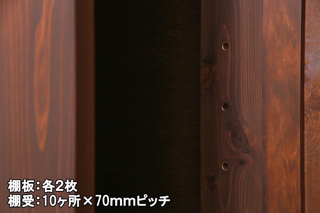 棚板は取り外しできます。棚板は各2枚あります。棚受けは各10ヶ所、70mmピッチで調整できます。棚幅サイズのものが1枚の作りです。