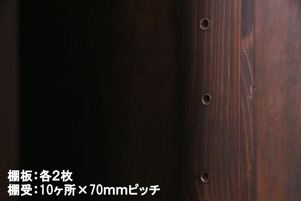 棚受けは各10ヶ所、70mmピッチで調整できます。棚幅サイズのものが1枚の作りです。
