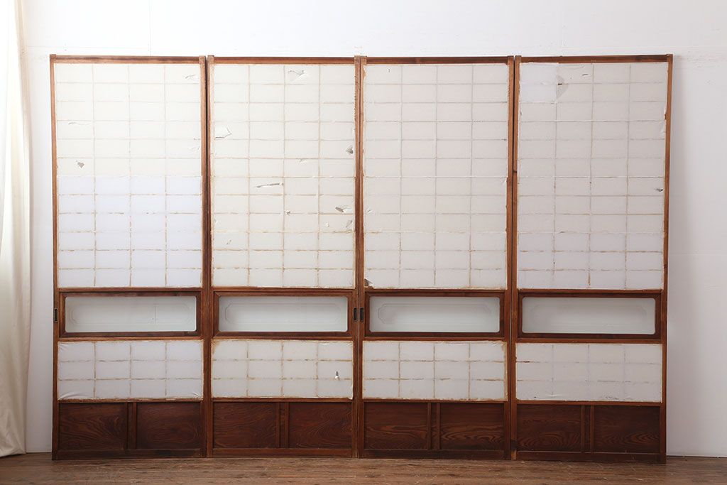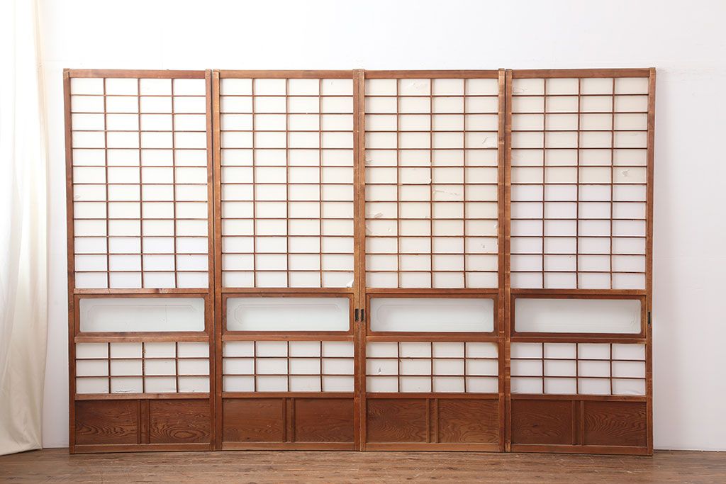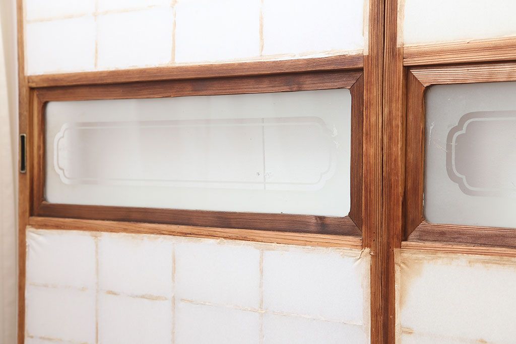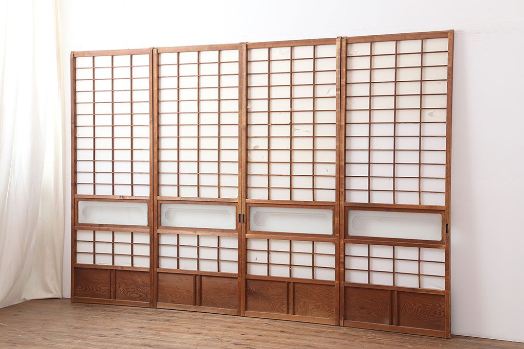 アンティーク建具 昭和初期 横額 木目が目を引く障子戸4枚セット(引き戸、ガラス帯戸)(R-037012)