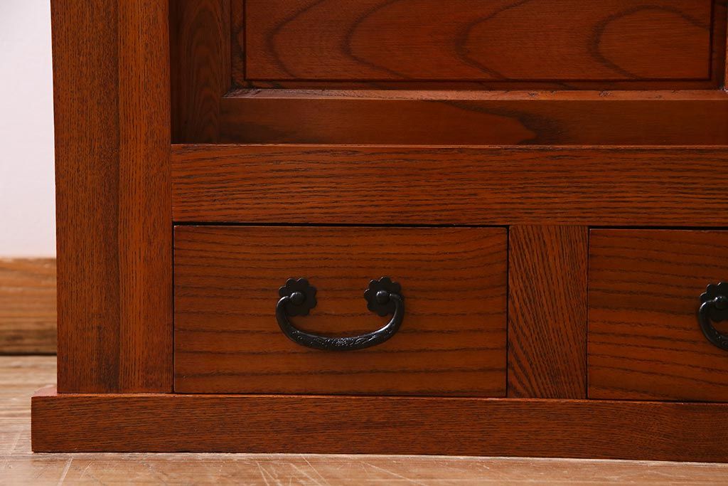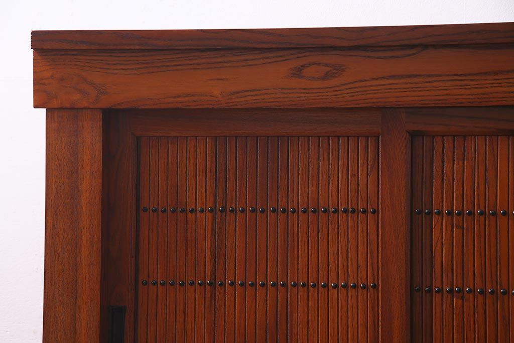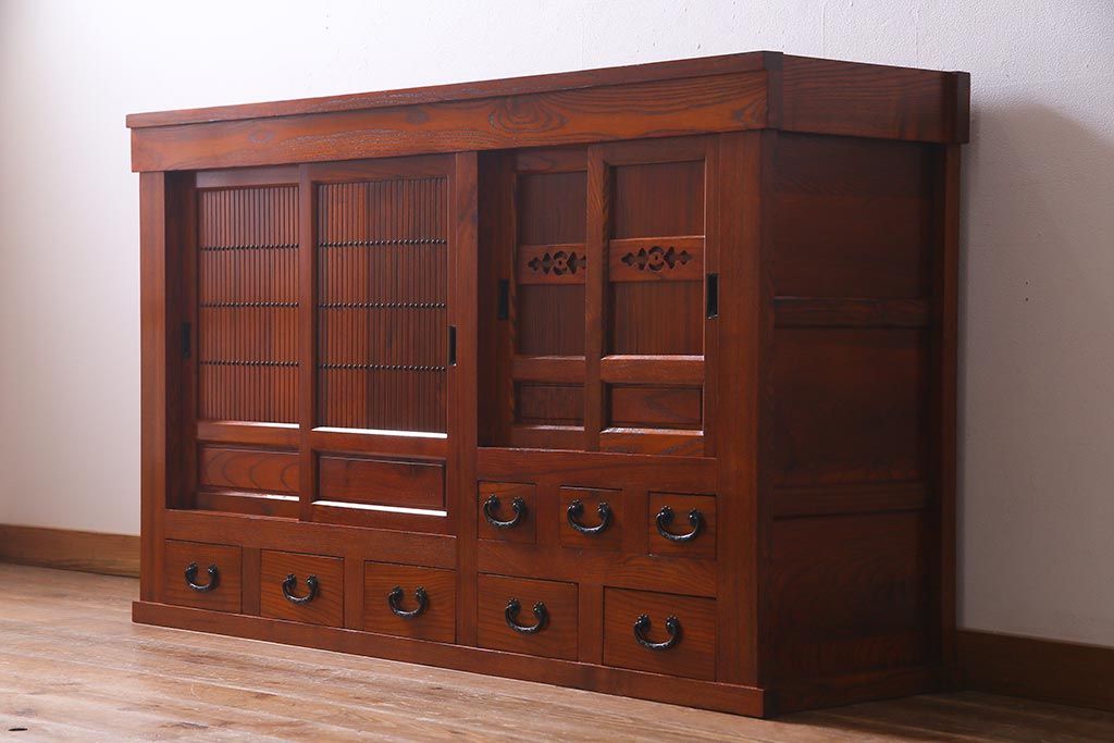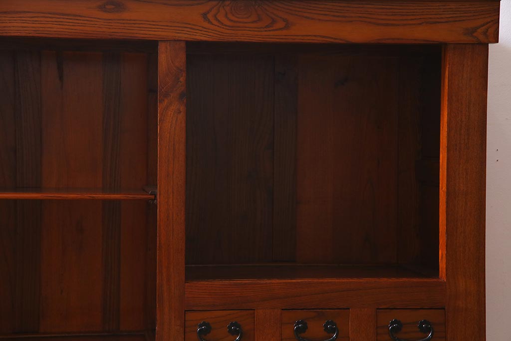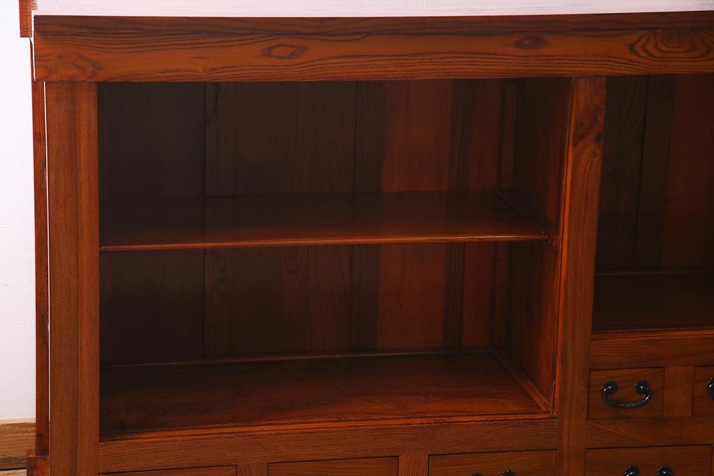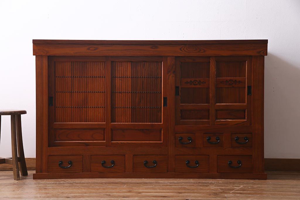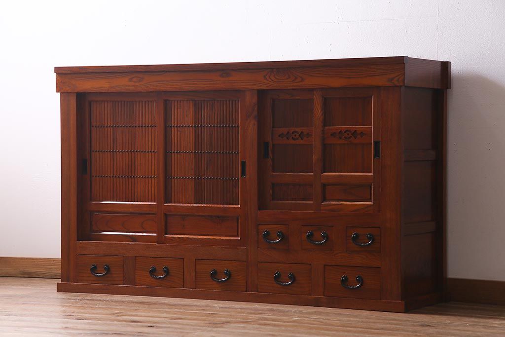 和箪笥 > 新古品 民芸家具 ニレ無垢材 5尺 重厚感と上品さを醸し出す水屋箪笥(収納棚、キャビネット)(R-037990)