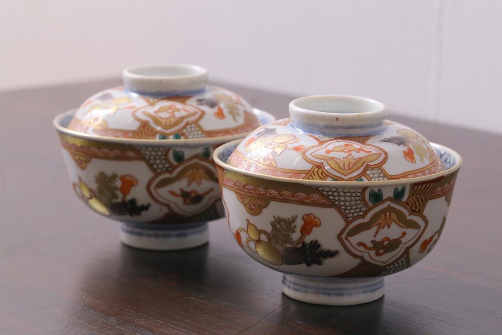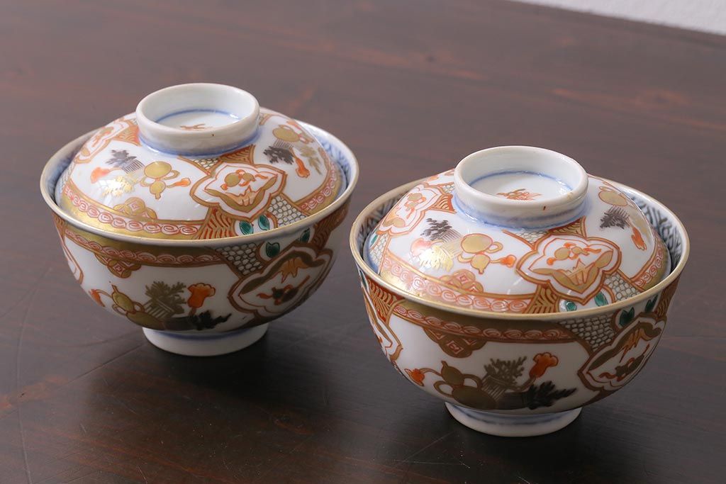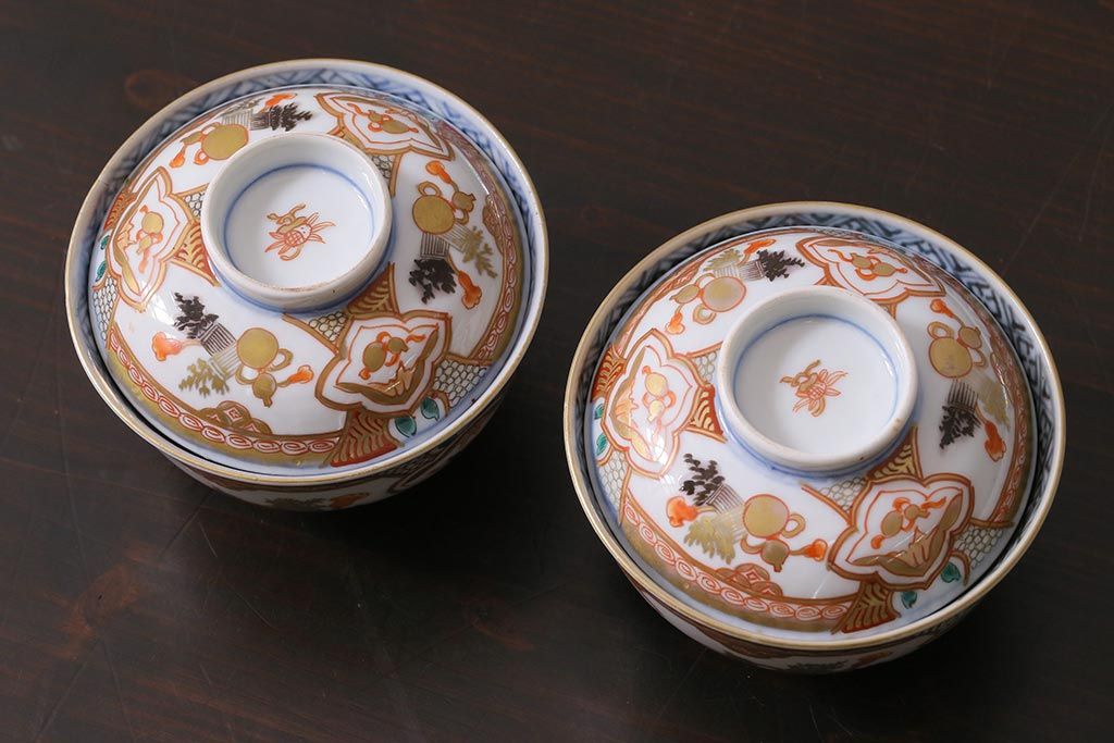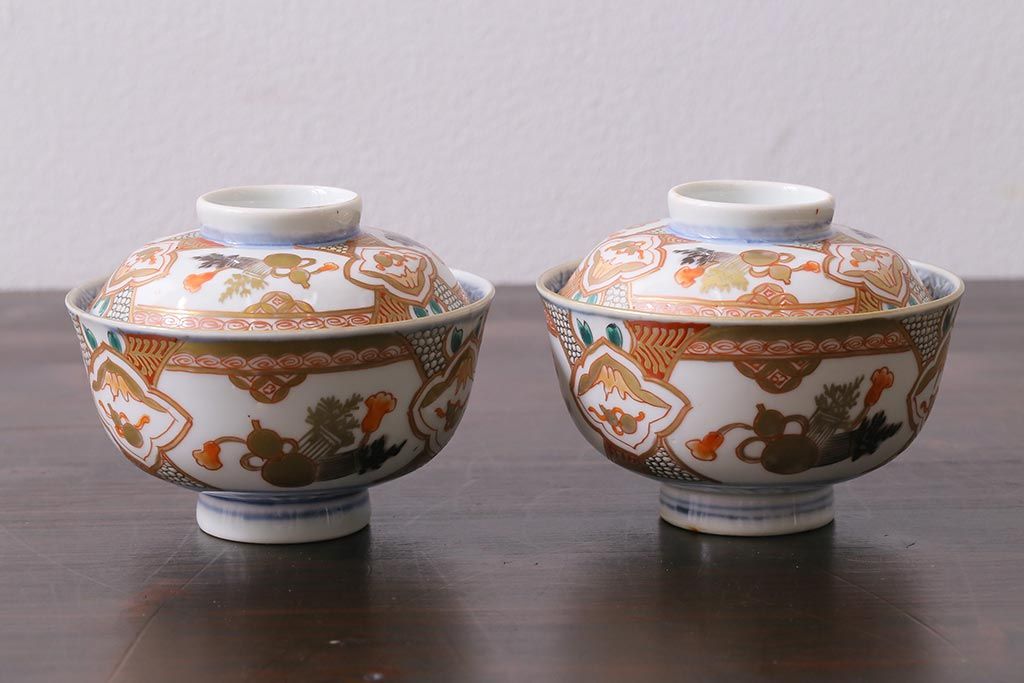 アンティーク雑貨 江戸期 色絵蓋付茶碗2個(伊万里)(R-037876)