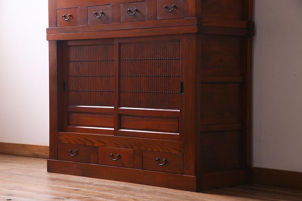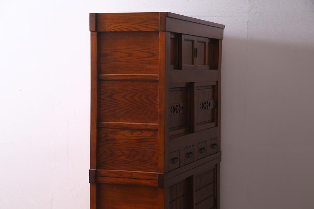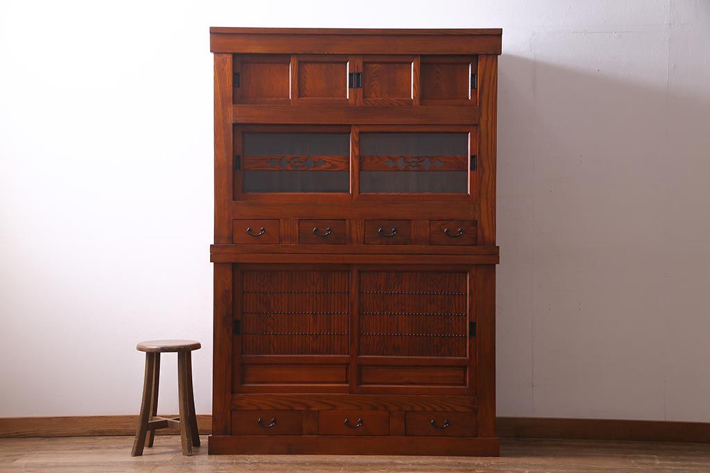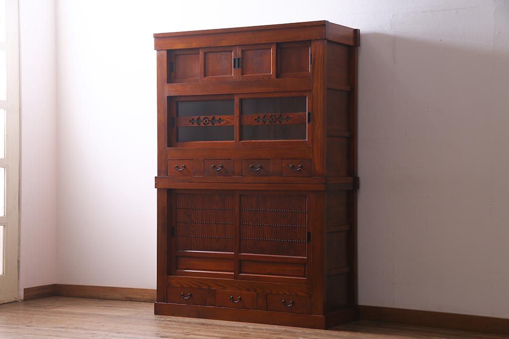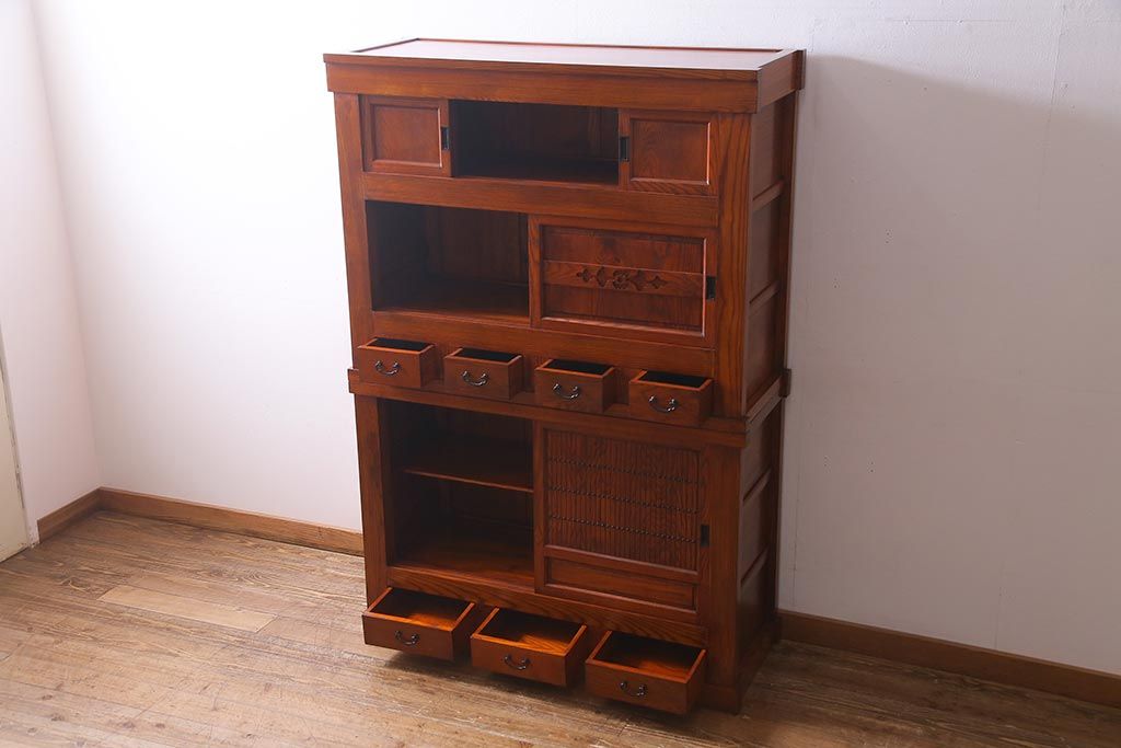 キャビネット・戸棚> 食器棚・カップボード > 新古品 民芸家具 ニレ無垢材 重厚感と上品さを醸し出す重ね水屋箪笥(収納棚、食器棚、キャビネット)(R-037911)