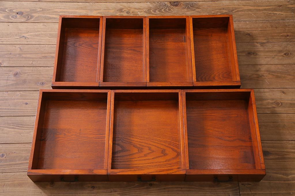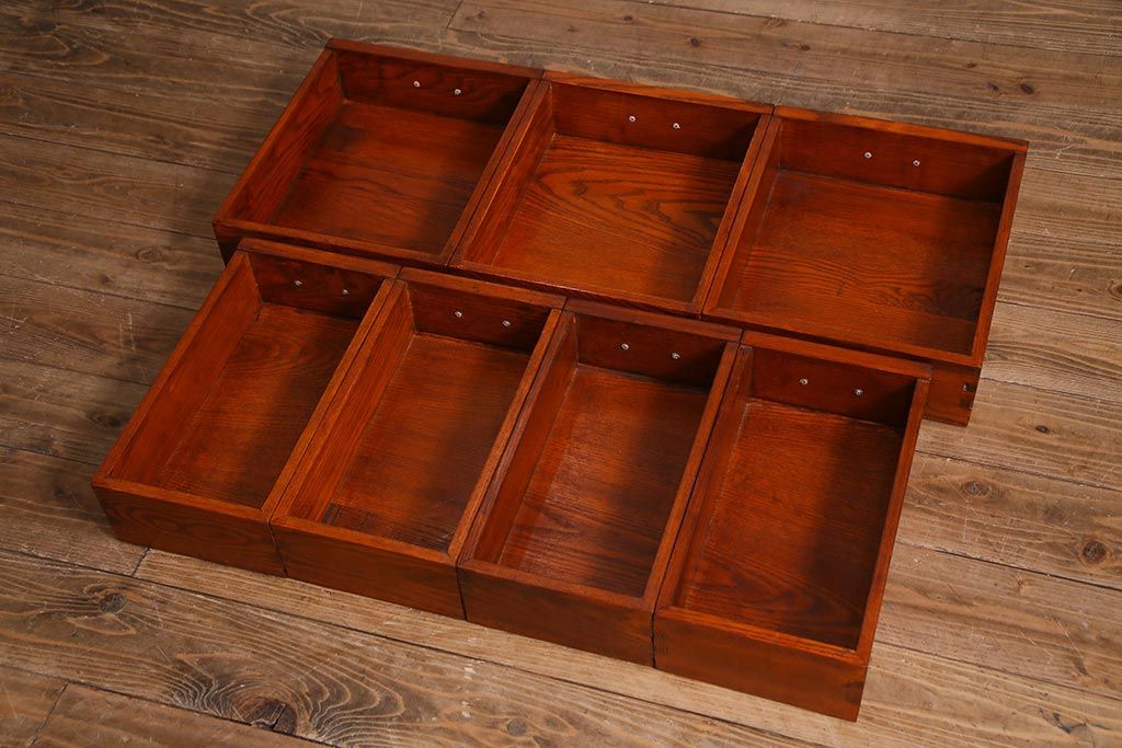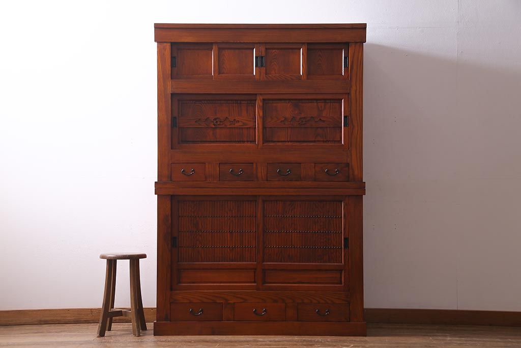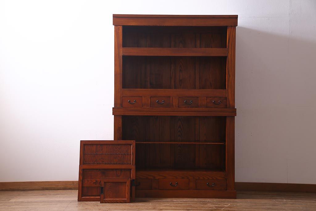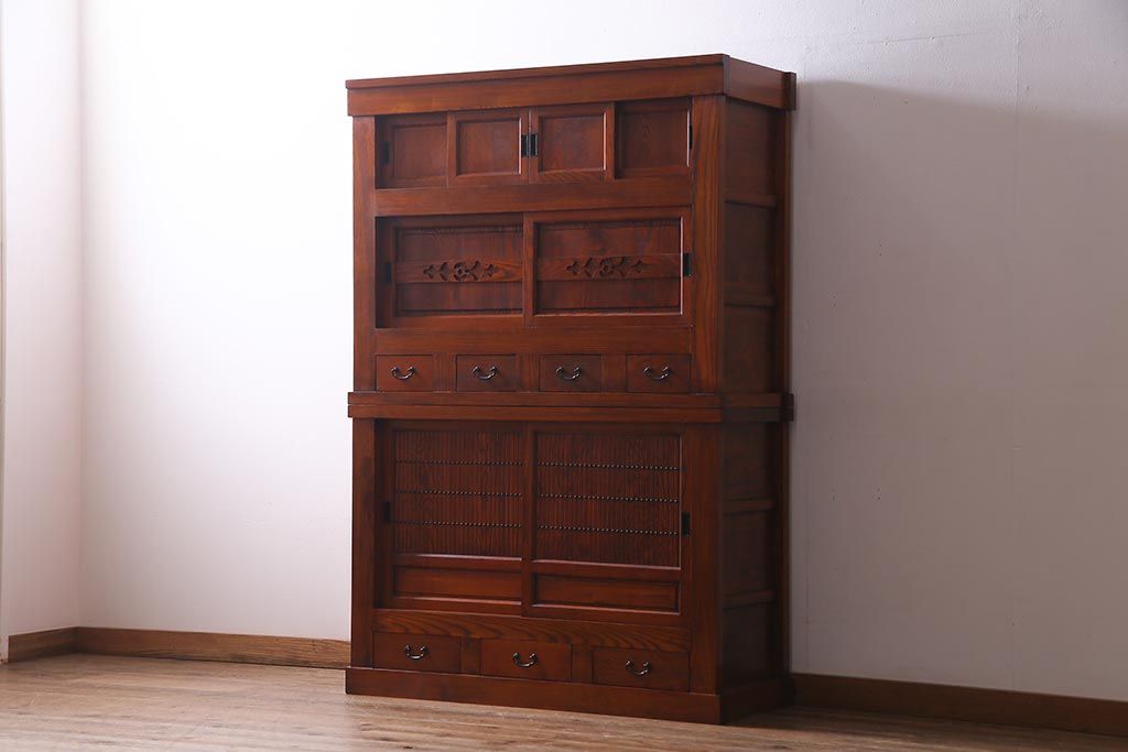 キャビネット・戸棚> 食器棚・カップボード > 新古品 民芸家具 ニレ無垢材 重厚感と上品さを醸し出す重ね水屋箪笥(収納棚、食器棚、キャビネット)(R-037911)