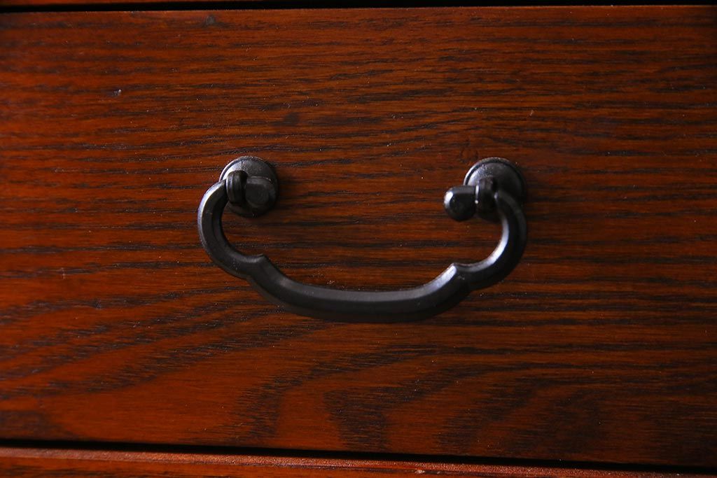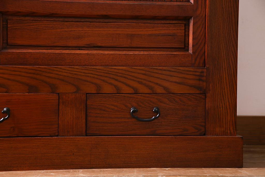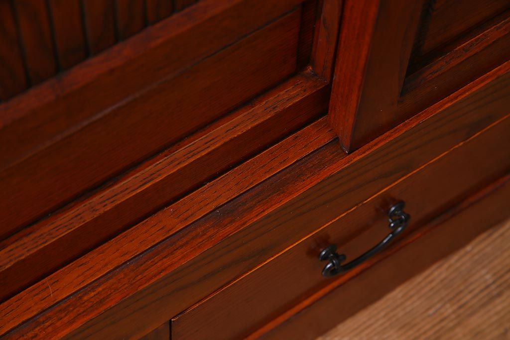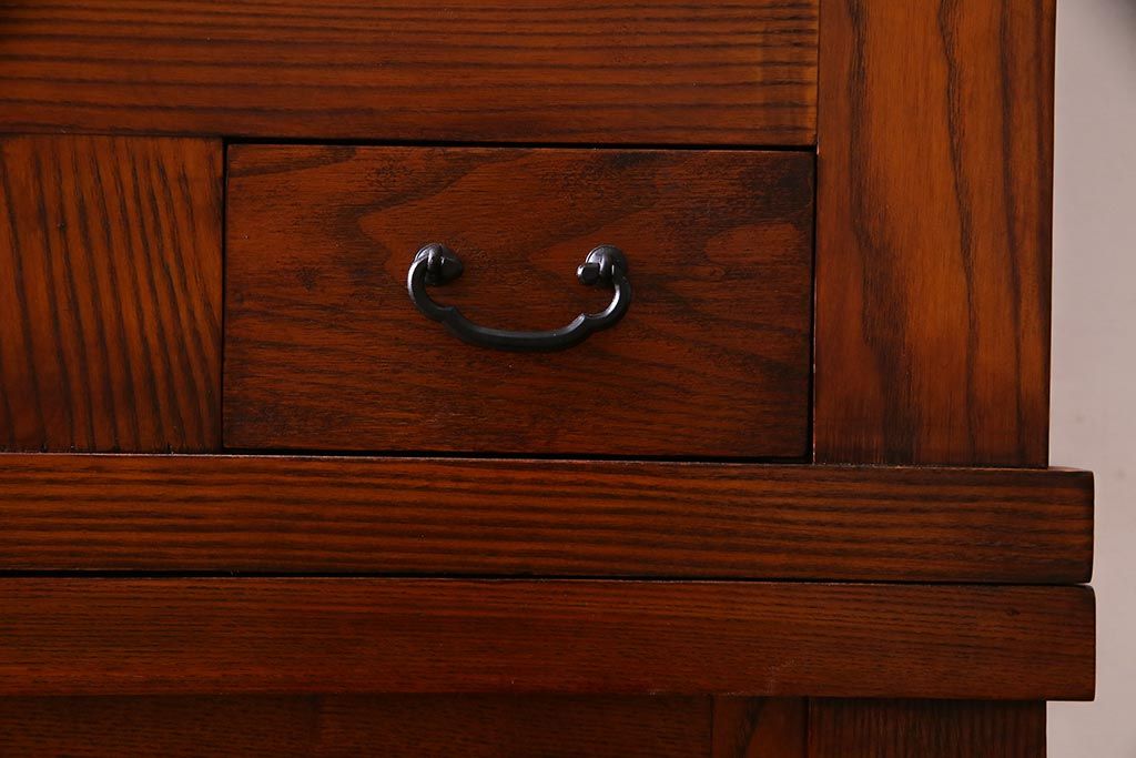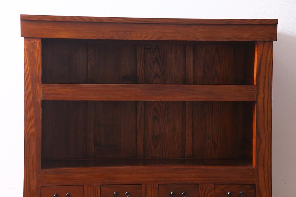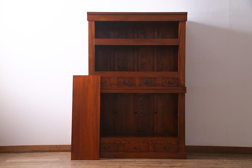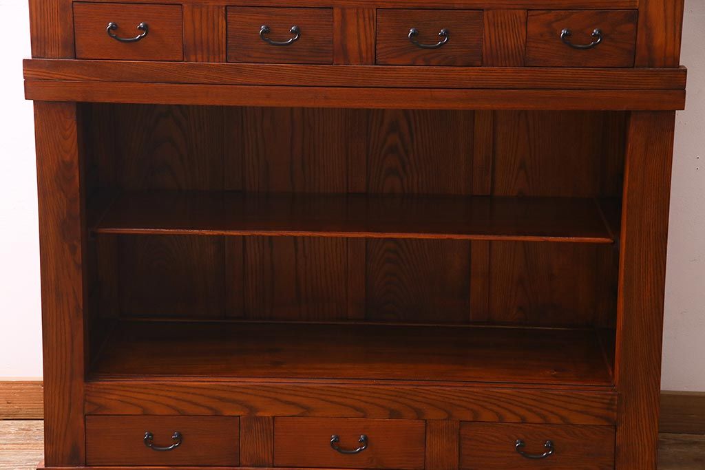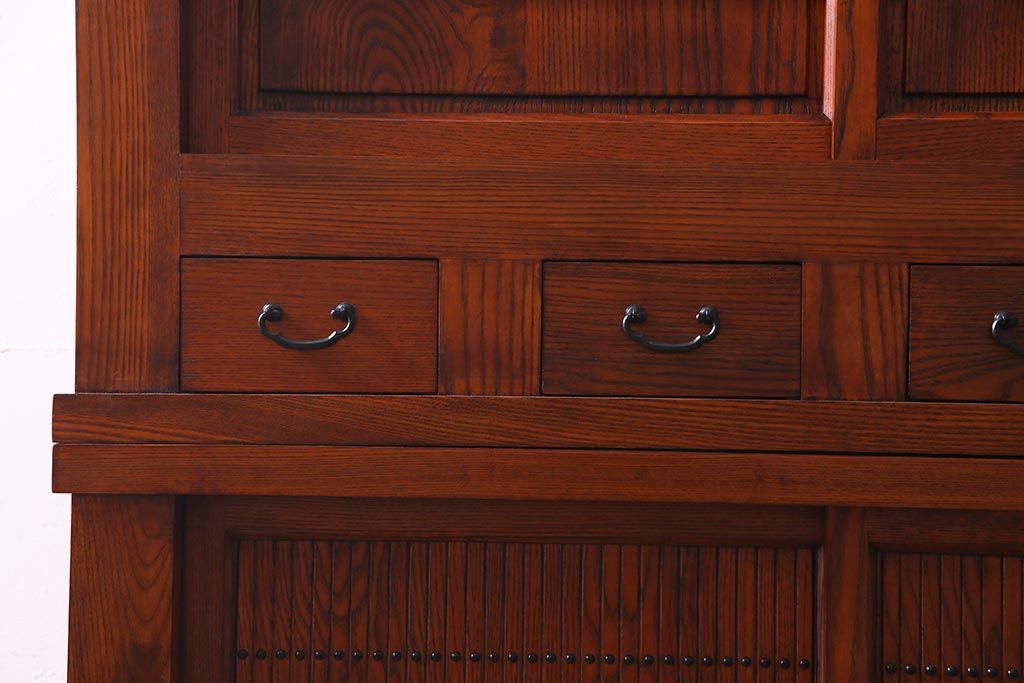 新古品 民芸家具 ニレ無垢材 重厚感と上品さを醸し出す重ね水屋箪笥(収納棚、食器棚、キャビネット)(R-037911)