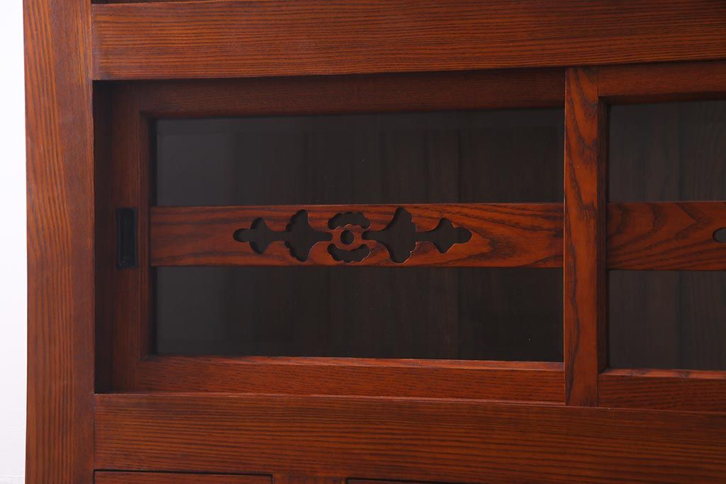 和箪笥 > 新古品 民芸家具 ニレ無垢材 重厚感と上品さを醸し出す重ね水屋箪笥(収納棚、食器棚、キャビネット)(R-037911)
