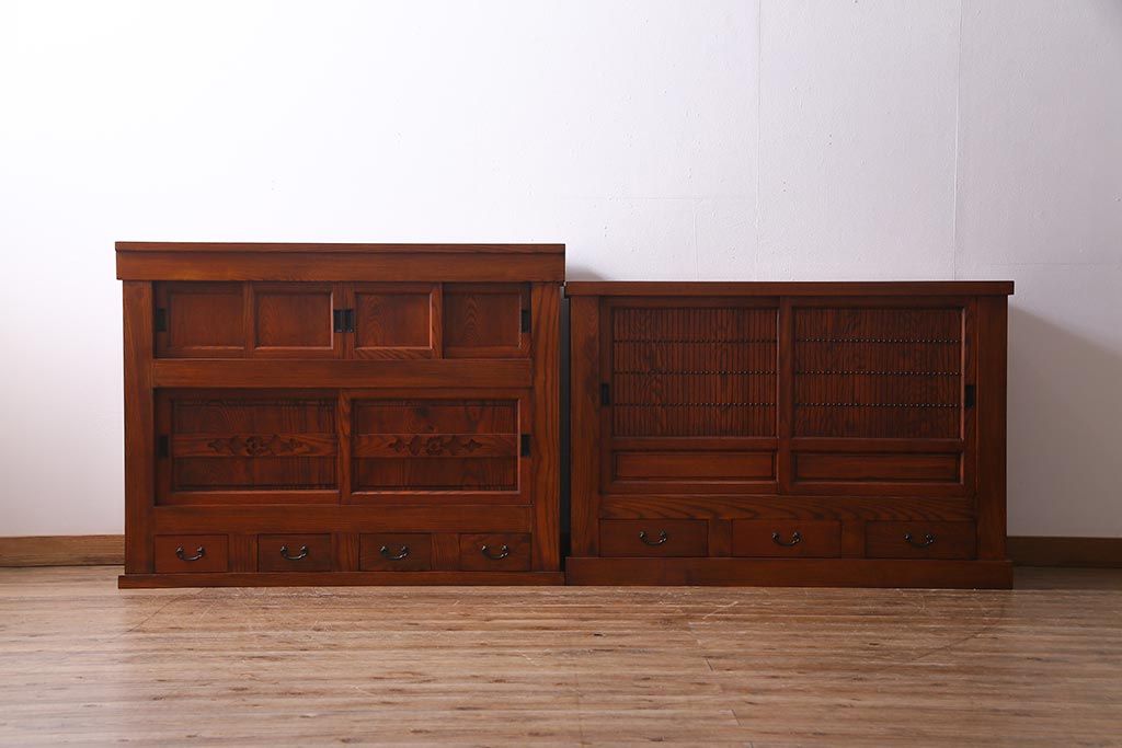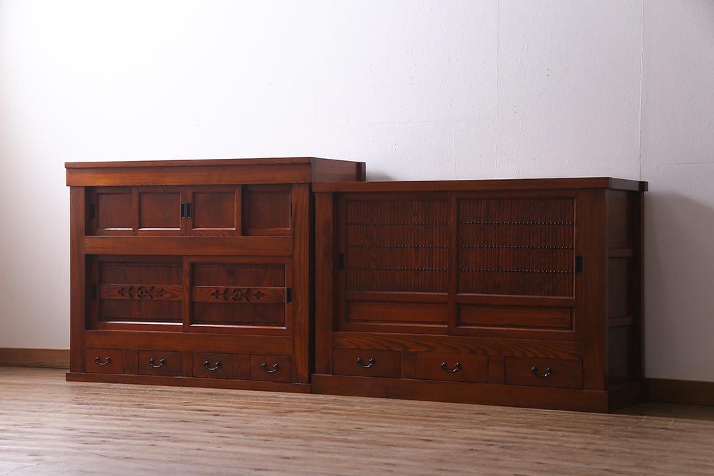 新古品 民芸家具 ニレ無垢材 重厚感と上品さを醸し出す重ね水屋箪笥(収納棚、食器棚、キャビネット)(R-037911)です。