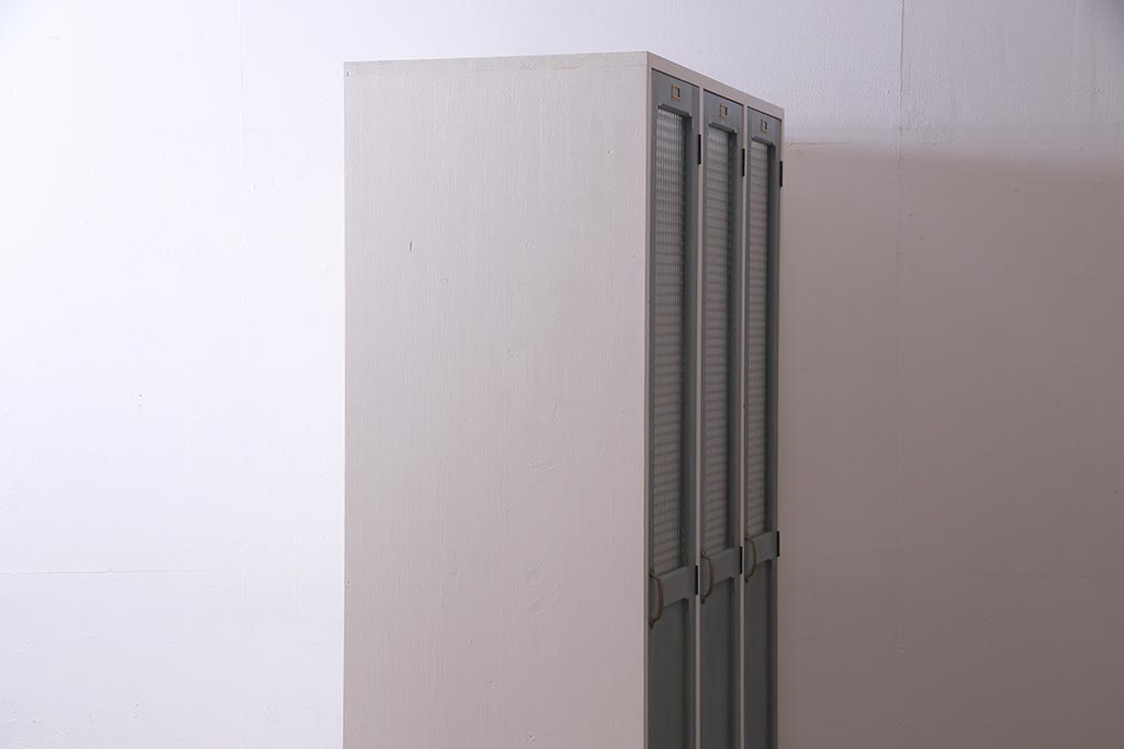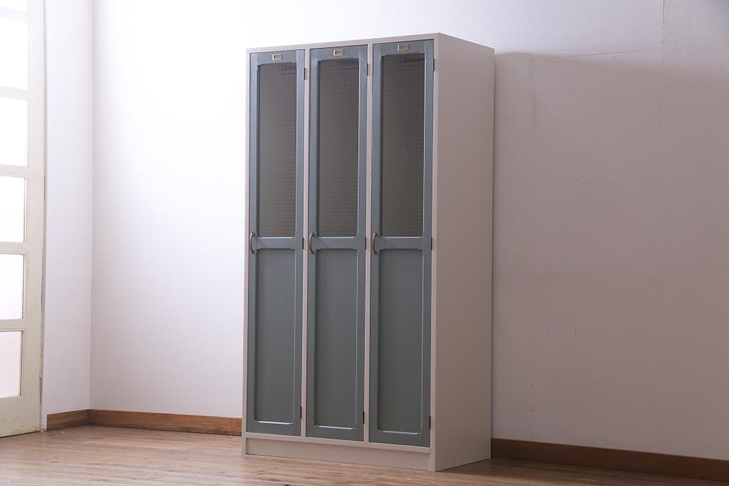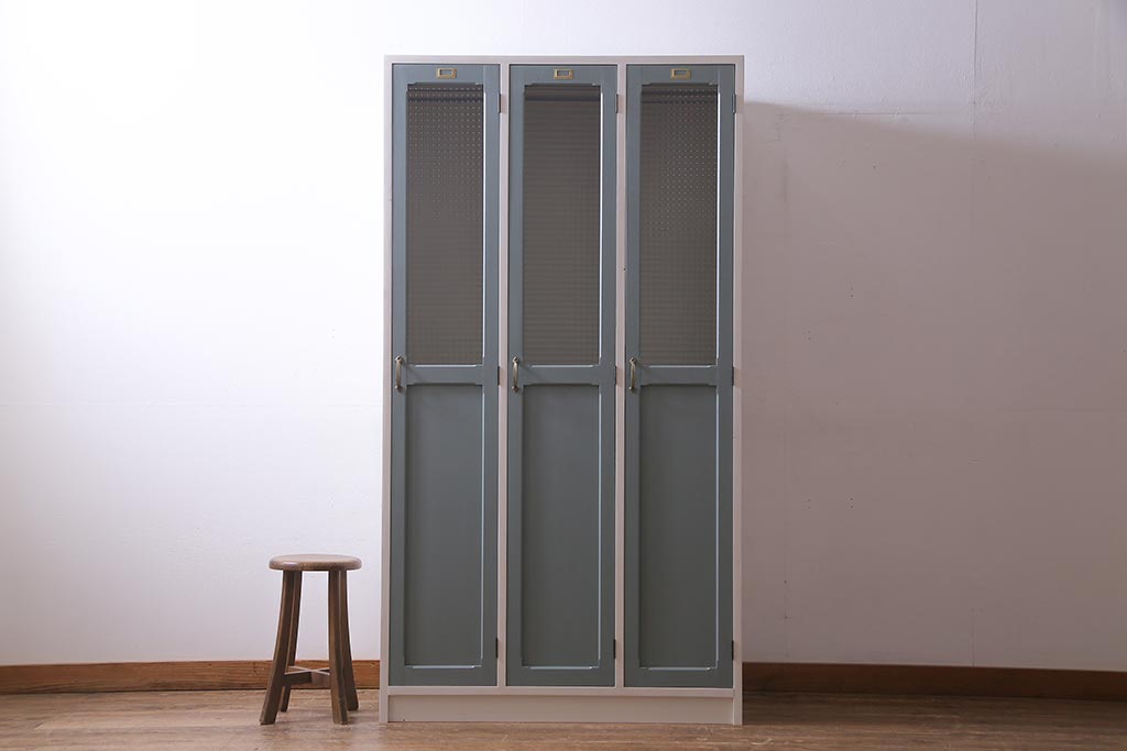 ラフジュ工房オリジナル ヒノキ無垢材・ヒバ材 チェッカーガラス入り レトロペイントの3人用ロッカー(収納棚、戸棚)(R-037984)