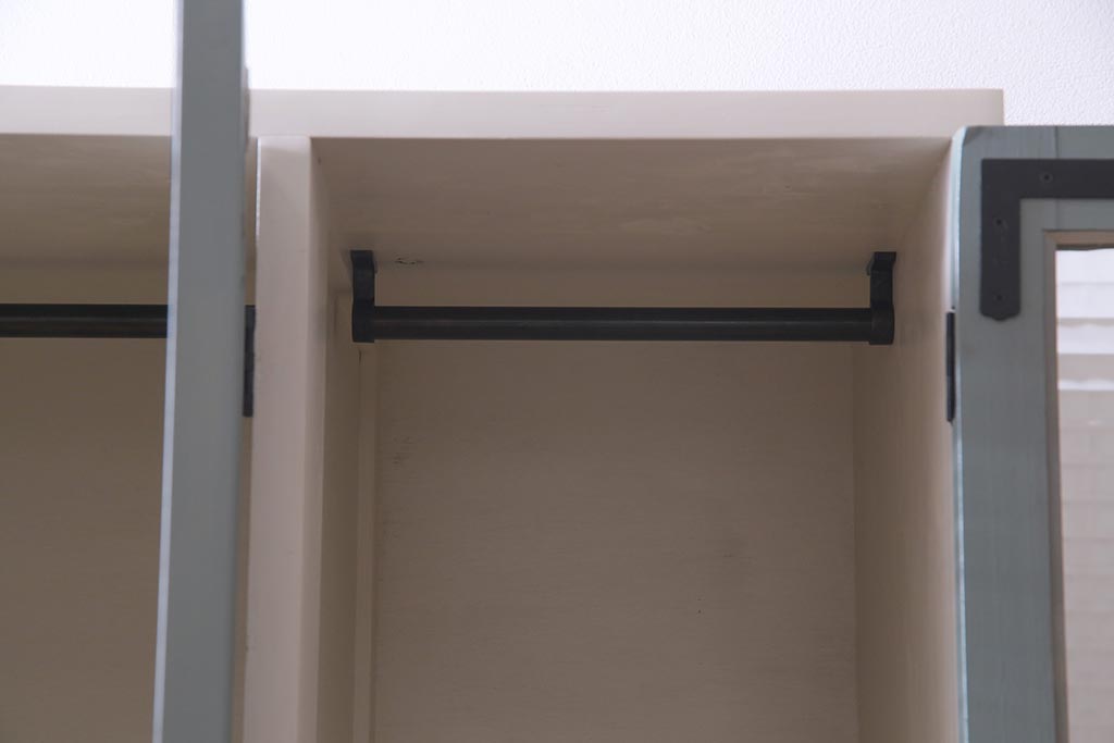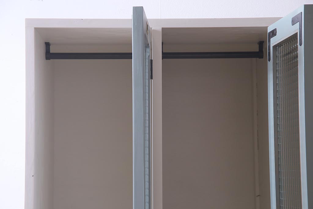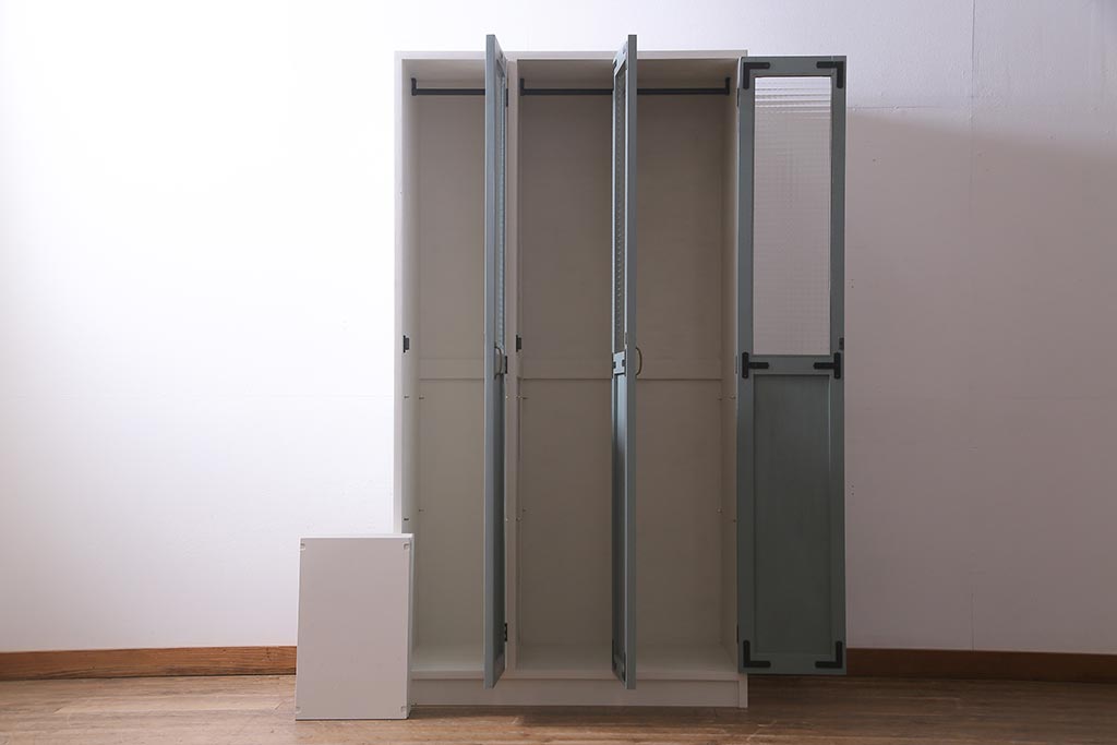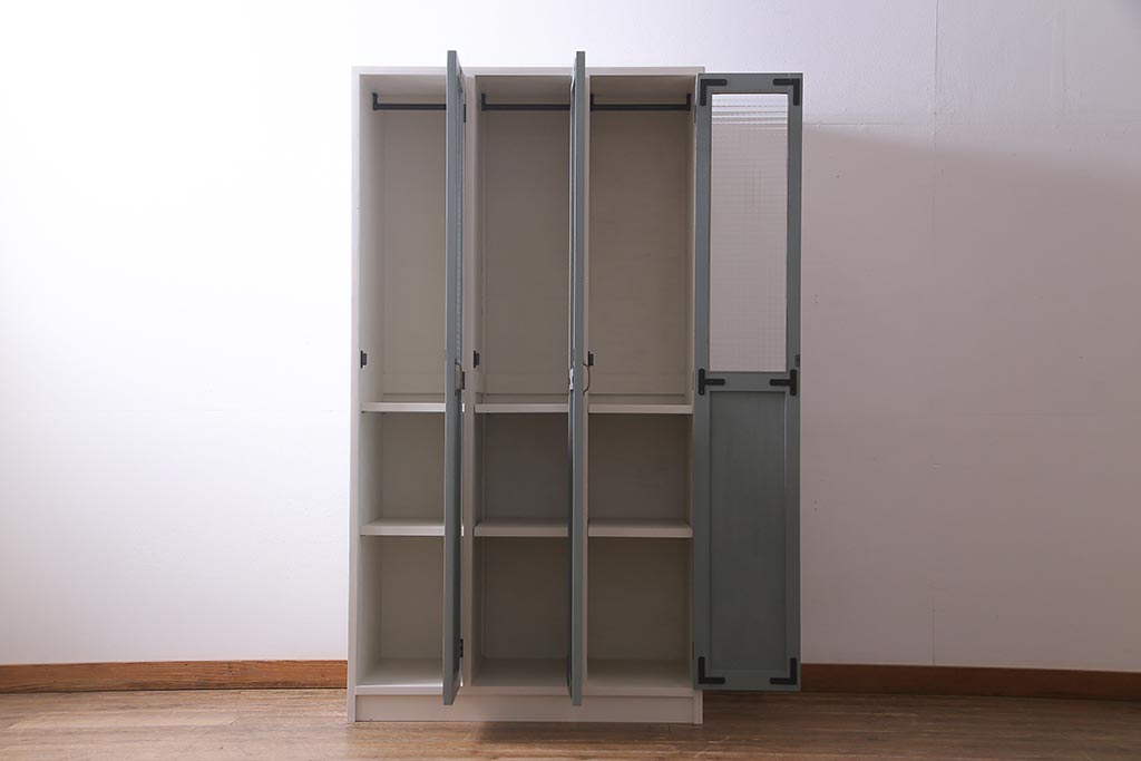 ラフジュ工房> ワードローブ・ロッカー> ワードローブ > ラフジュ工房オリジナル ヒノキ無垢材・ヒバ材 チェッカーガラス入り レトロペイントの3人用ロッカー(収納棚、戸棚)(R-037984)